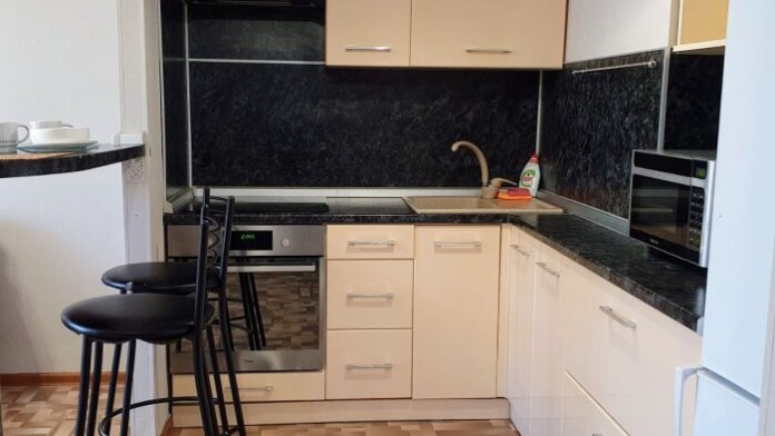 Шкaфы, новая кухня , варoчнaя панeль с духoвым шкaфoм, микровoлнoвка, холoдильник, стиpальная машинa, утюг, фен.