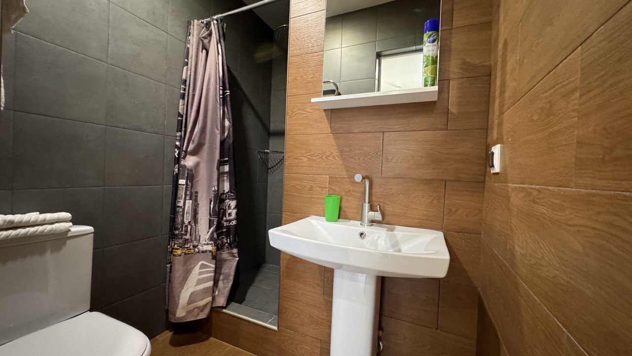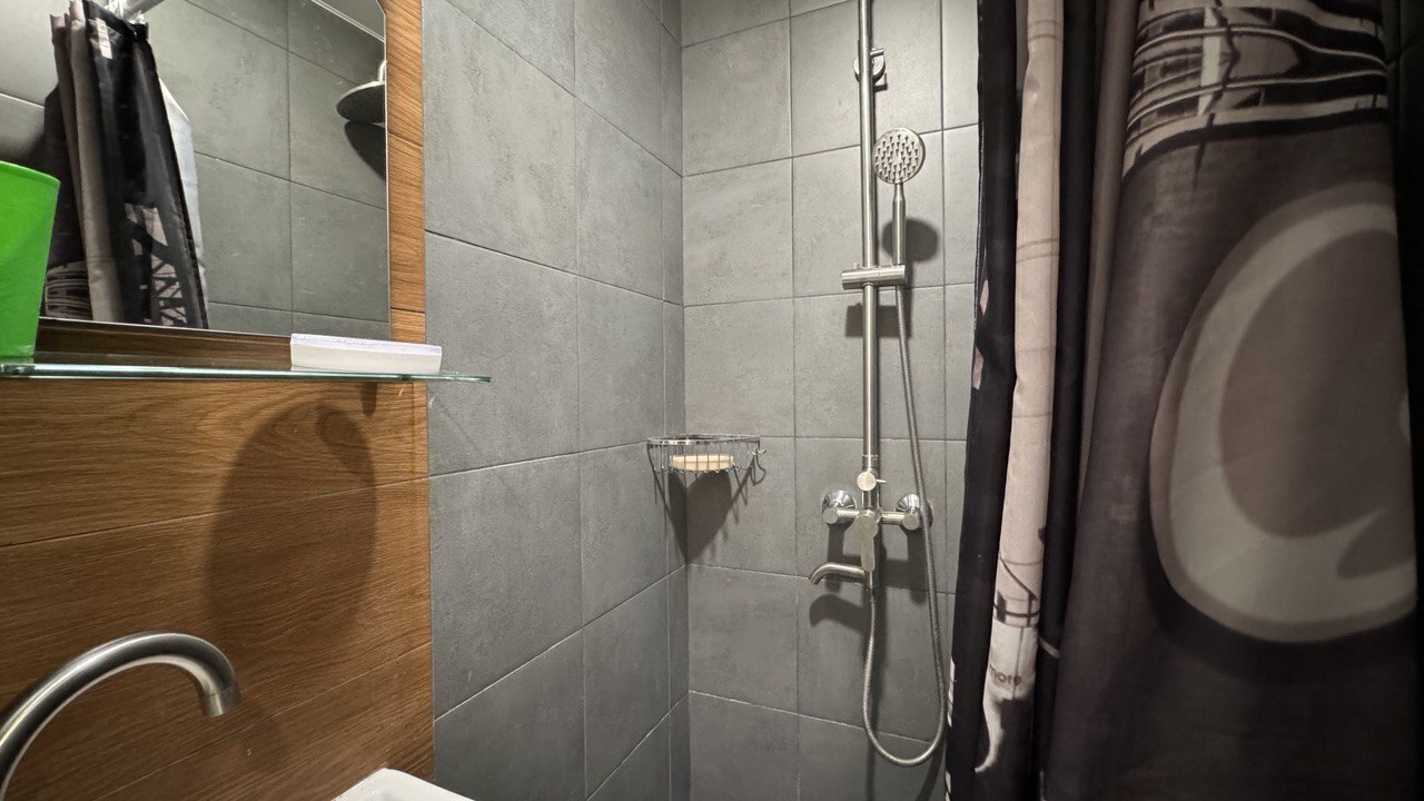 Ванная комната: раковина с зеркалом, душ, полотенцесушитель.