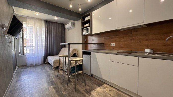 Двухкомнатная квартира, в которой каждая комната может быть отдельной студией. В каждой комнате есть кухня с посудой и приборами, кухонной мебелью: столы и стулья, кухонные гарнитуры.