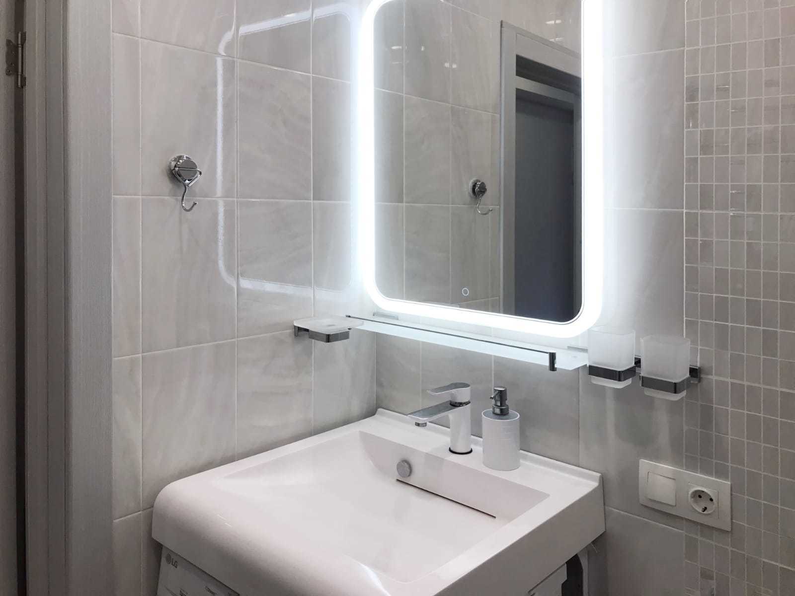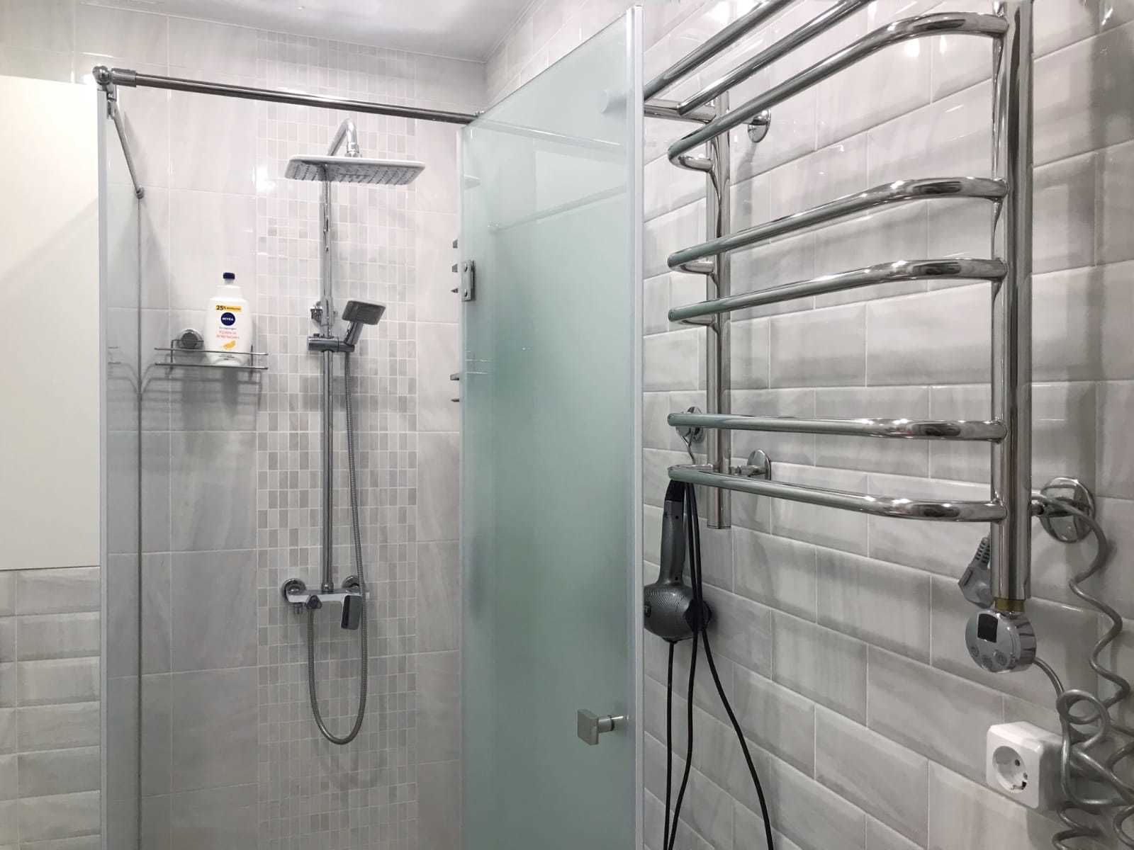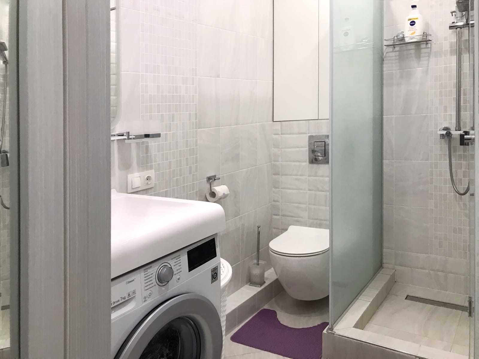 Ванная комната: раковина с зеркалом, унитаз, душ, стиральная машина, полотенцесушитель, сушилка для белья, фен.