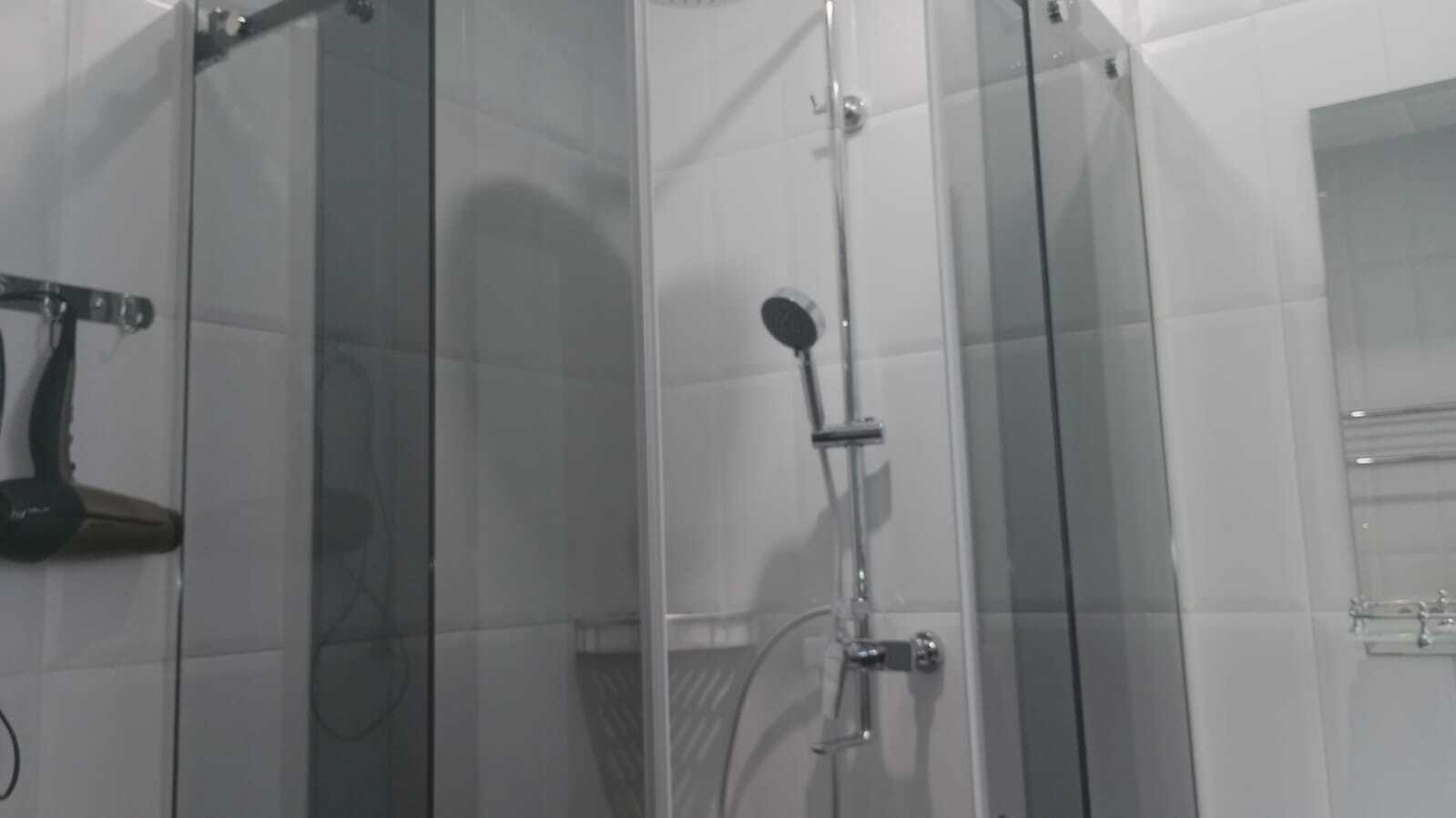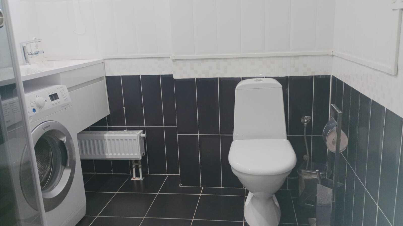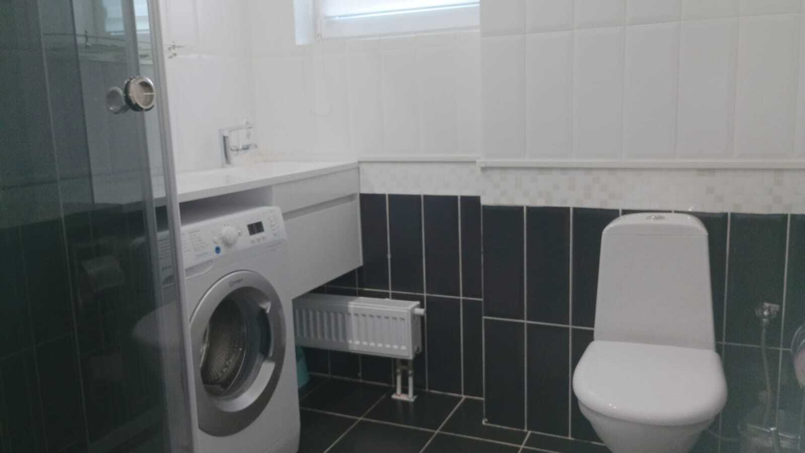Ванная комната: раковина с зеркалом, унитаз, душ, стиральная машина, полотенцесушитель, сушилка для белья, фен.