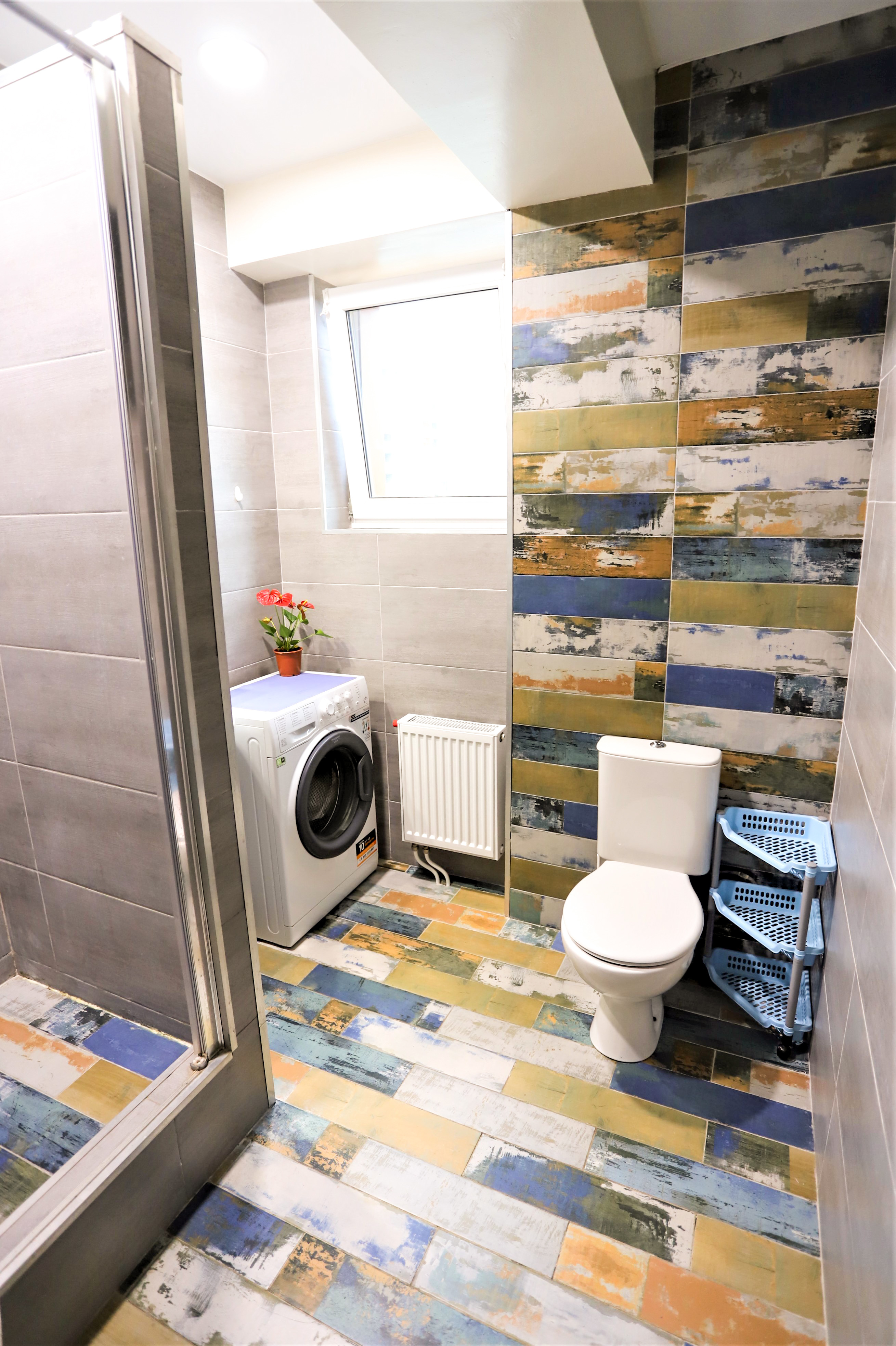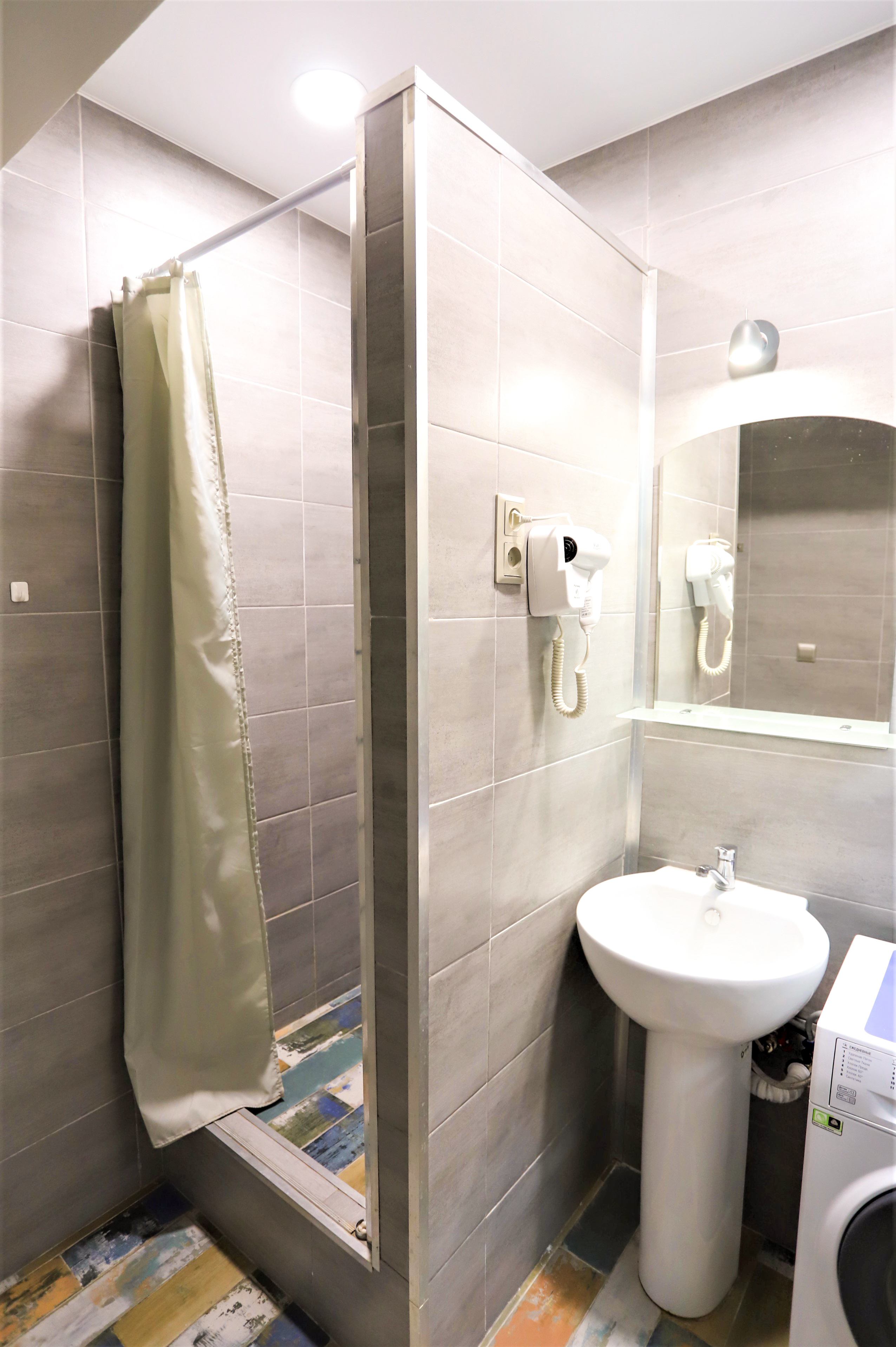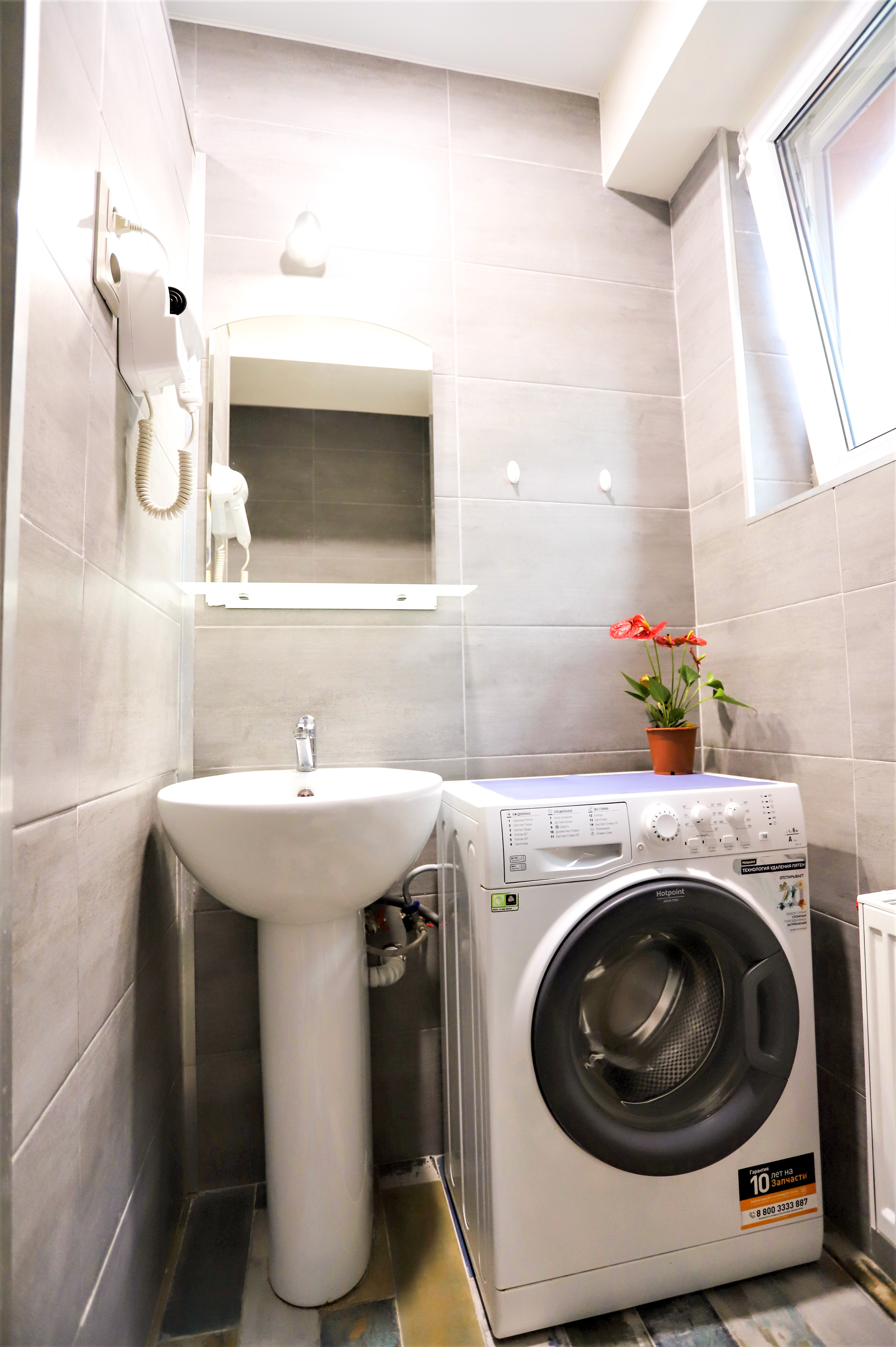 Ванная комната: раковина с зеркалом, унитаз, душ, стиральная машина, полотенцесушитель, сушилка для белья, фен.