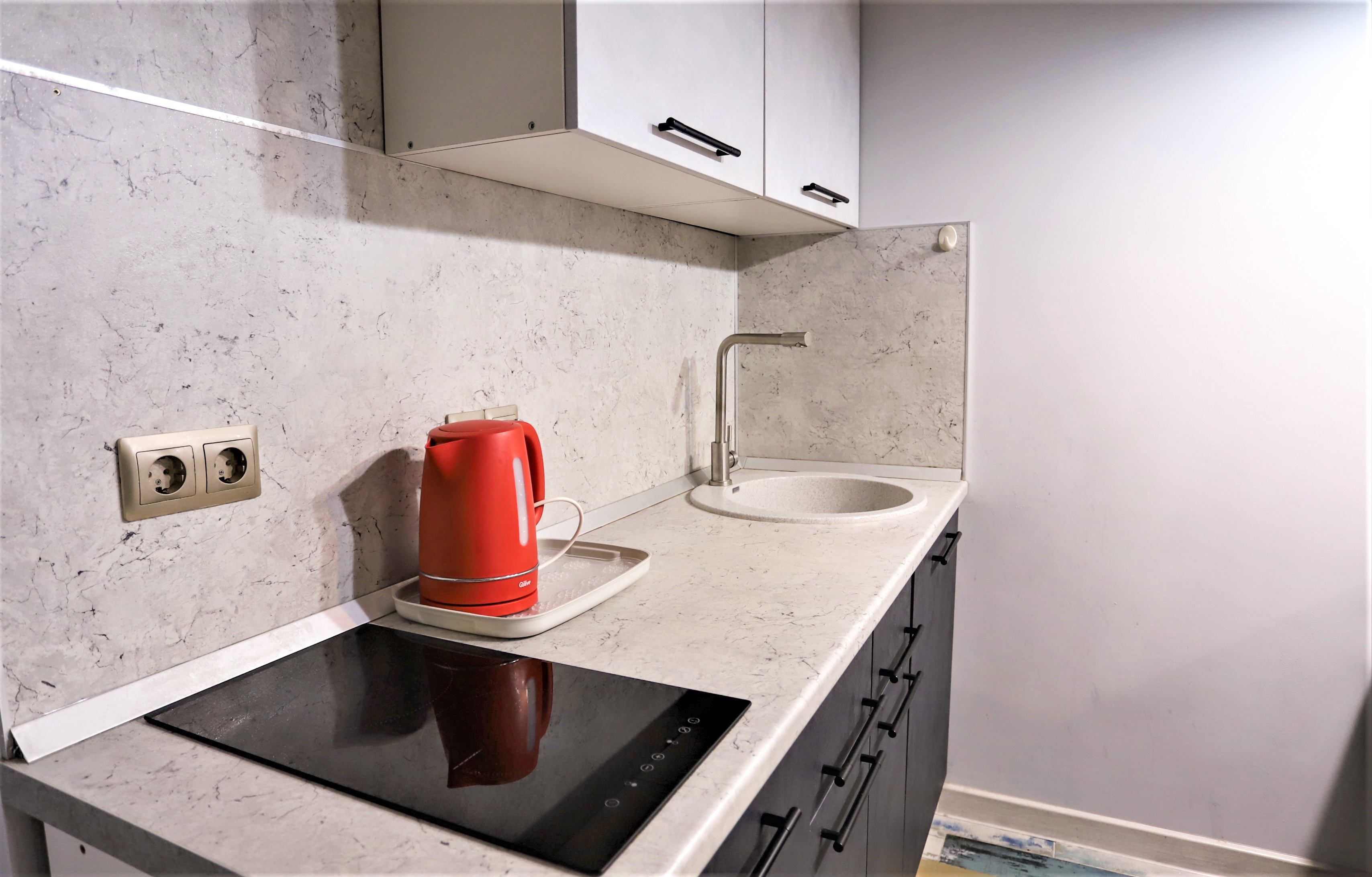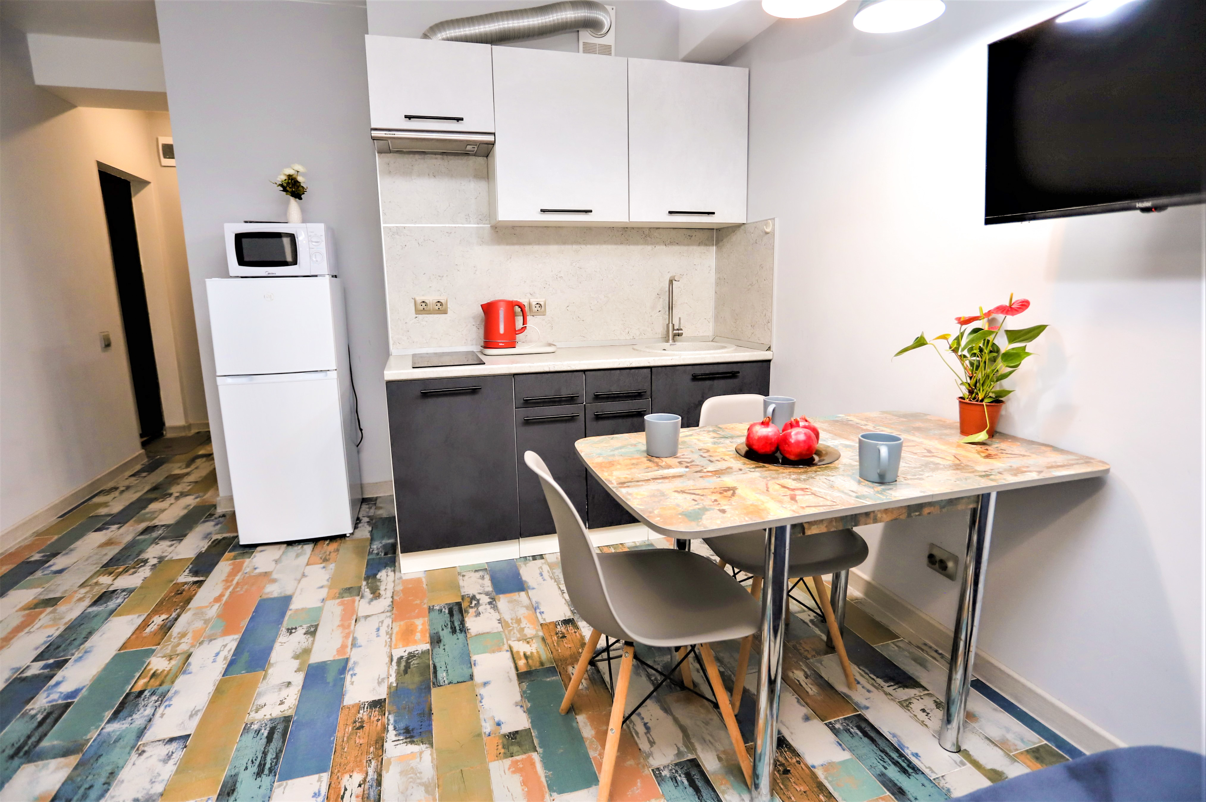 Кухонная зона: электрическая плита, вытяжка, холодильник, микроволновая печь, электрический чайник, кухонный стол, стулья, столовые приборы и посуда.