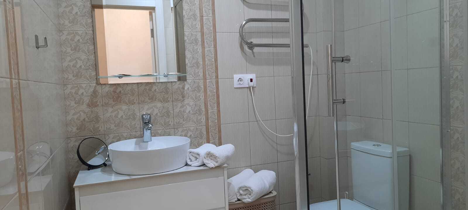 Ванная комната: раковина с зеркалом, унитаз, душ, стиральная машина, полотенцесушитель, сушилка для белья, фен.