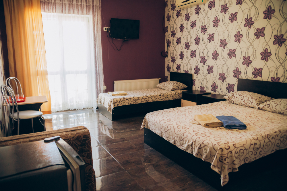 Номер представляет собой комфортное и просторное помещение, идеально подходящее для семейного отдыха или отдыха небольшой компанией. В номере предусмотрены двуспальная и односпальная кровати.