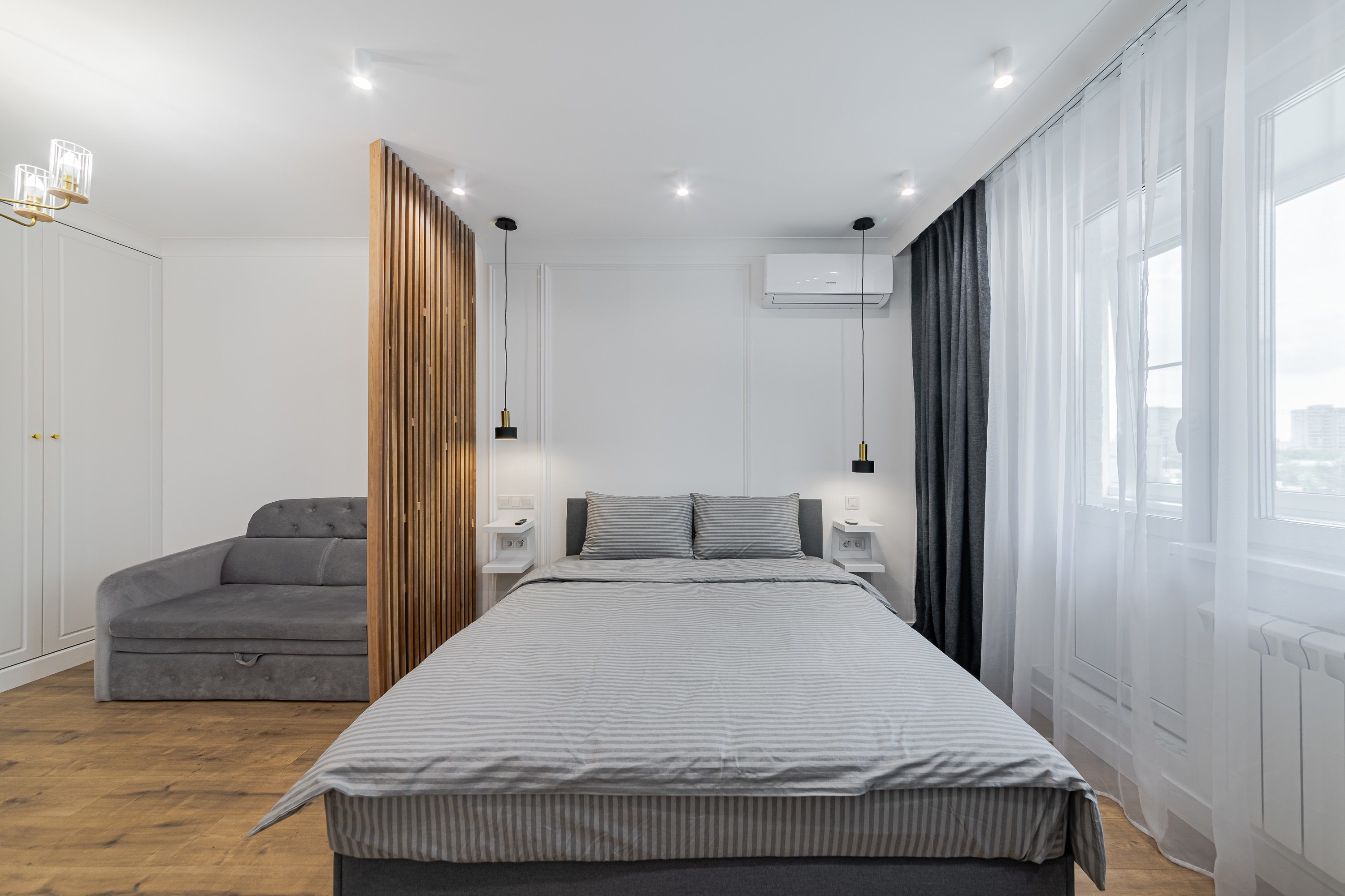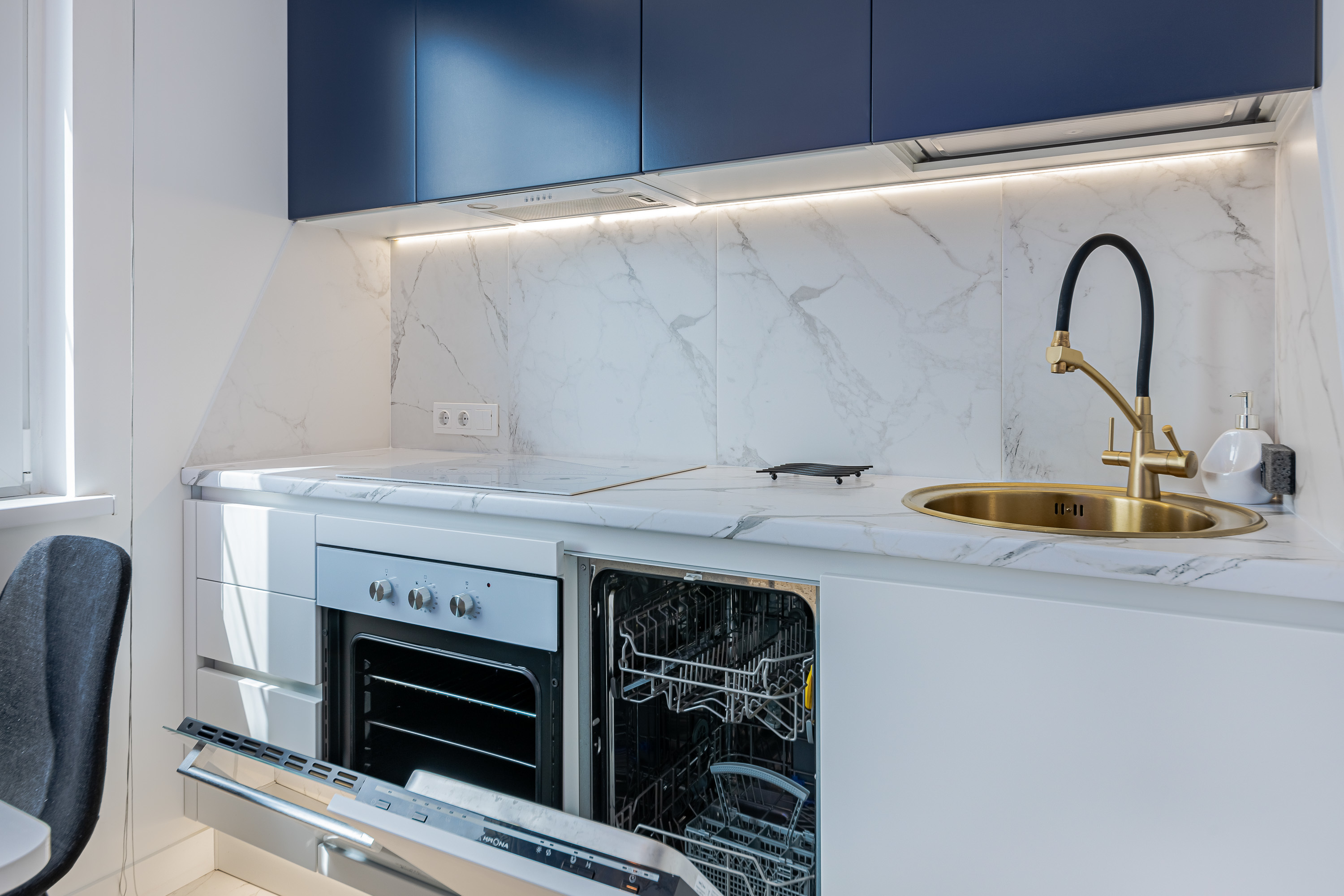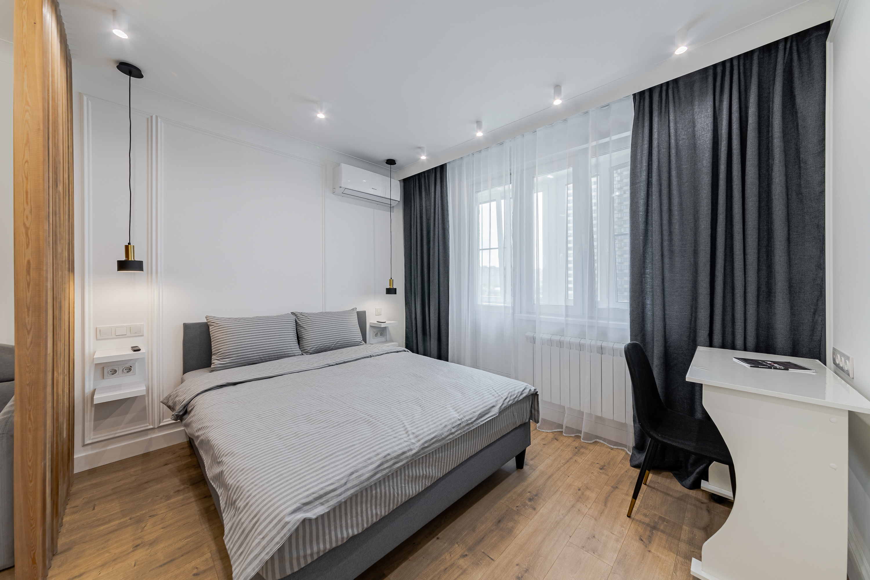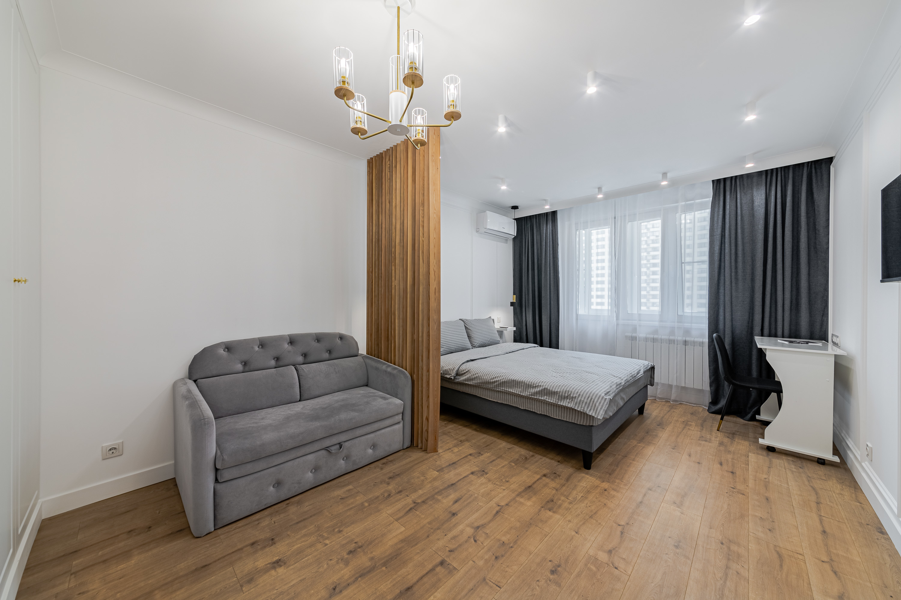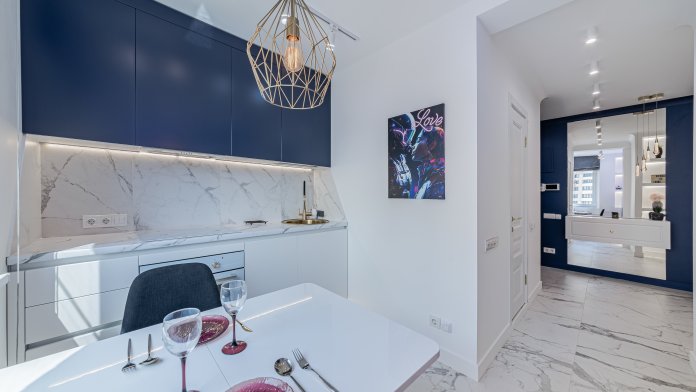 Квартира рассчитана на 3 гостей. Остановитесь в новой уютной квартире, оборудованной современной техникой и мебелью. Дизайн интерьера выполнен в светлых тонах, с синими акцентами. Полностью экипированная кухня с СВЧ, плитой и духовкой, вытяжкой, холодильником, электрическим чайником и посудомоечной машиной. В комнате достаточно места для длительного пребывания. Здесь есть огромный шкаф для хранения вещей, комфортная двуспальная кровать, а также диван, который служит дополнительным спальным местом.