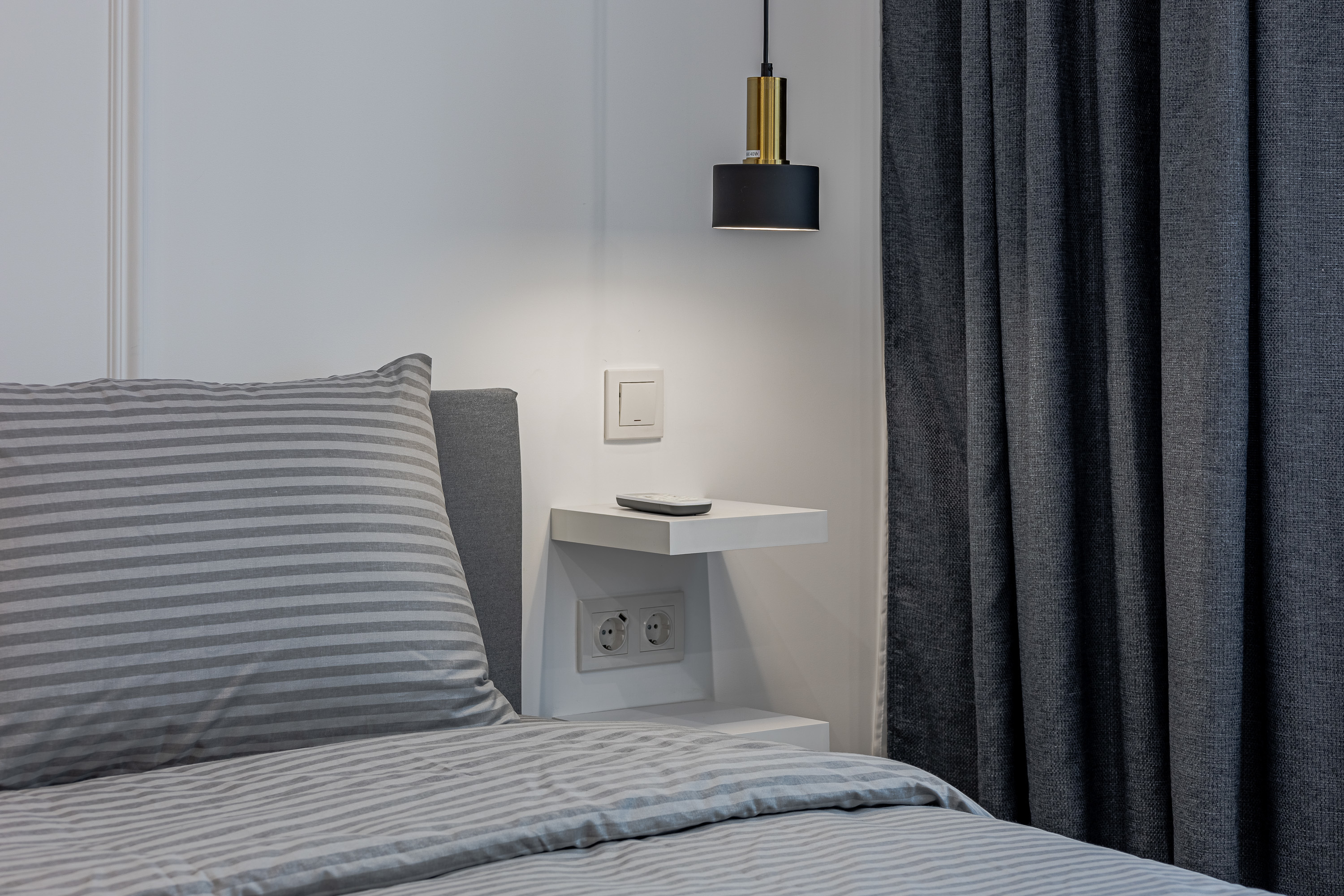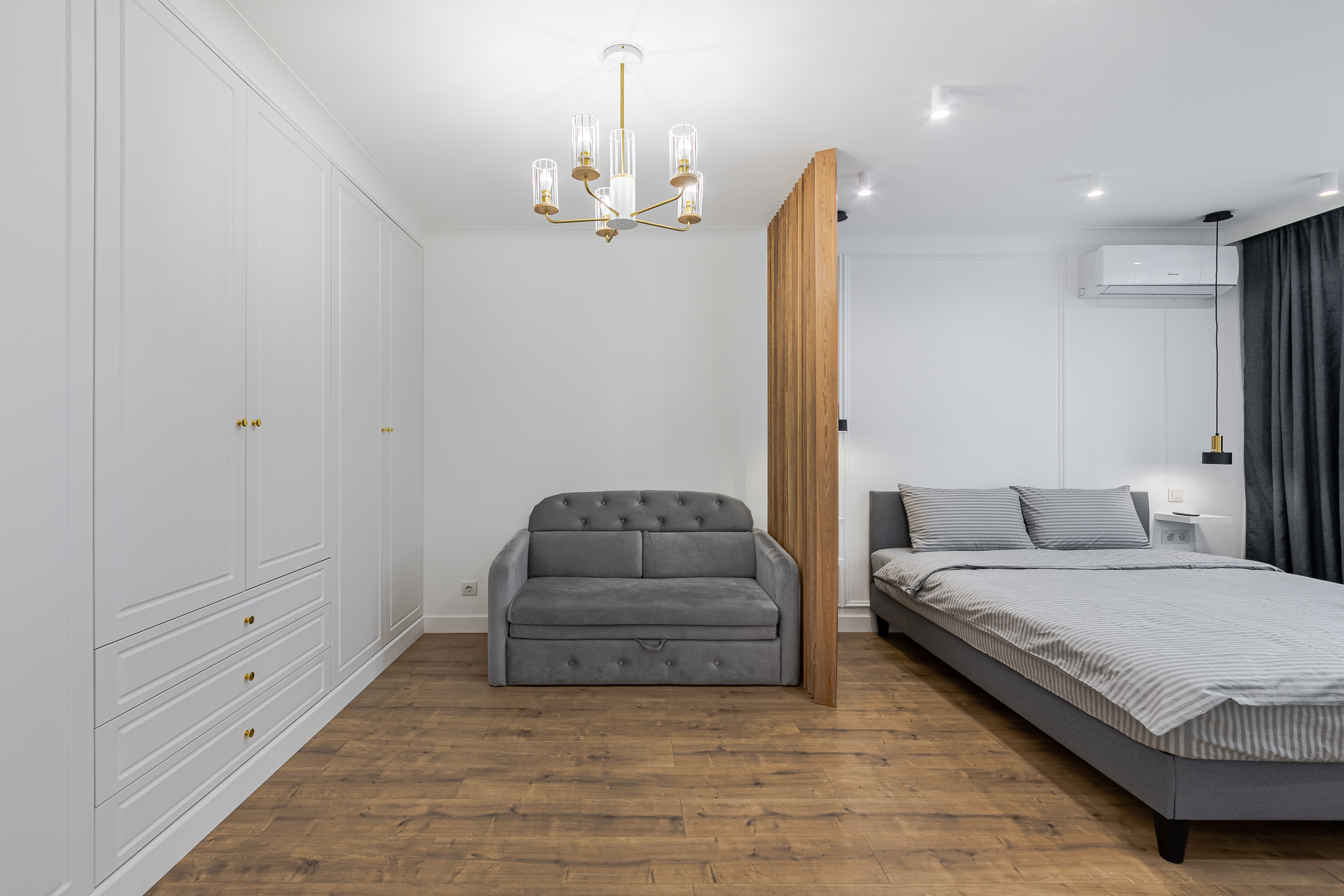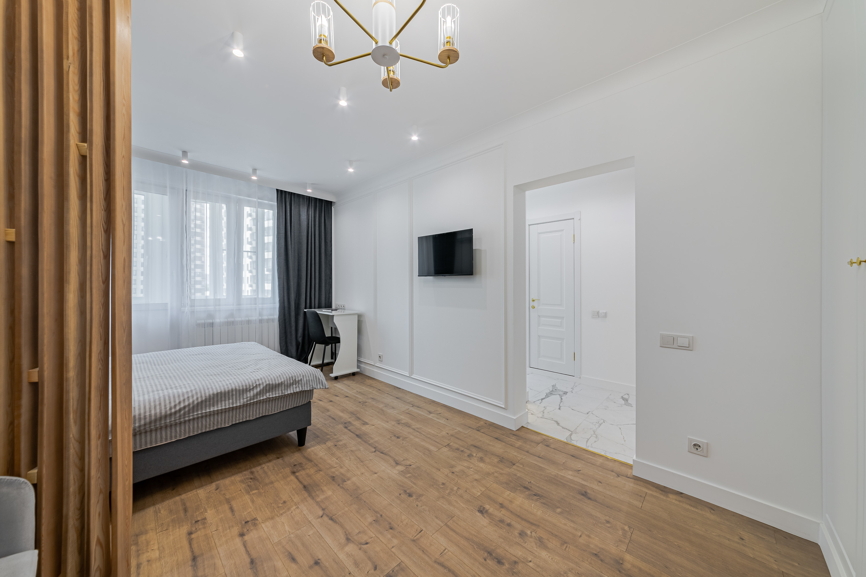 Квартира рассчитана на 3 гостей. Остановитесь в новой уютной квартире, оборудованной современной техникой и мебелью. Дизайн интерьера выполнен в светлых тонах, с синими акцентами. Полностью экипированная кухня с СВЧ, плитой и духовкой, вытяжкой, холодильником, электрическим чайником и посудомоечной машиной. В комнате достаточно места для длительного пребывания. Здесь есть огромный шкаф для хранения вещей, комфортная двуспальная кровать, а также диван, который служит дополнительным спальным местом.