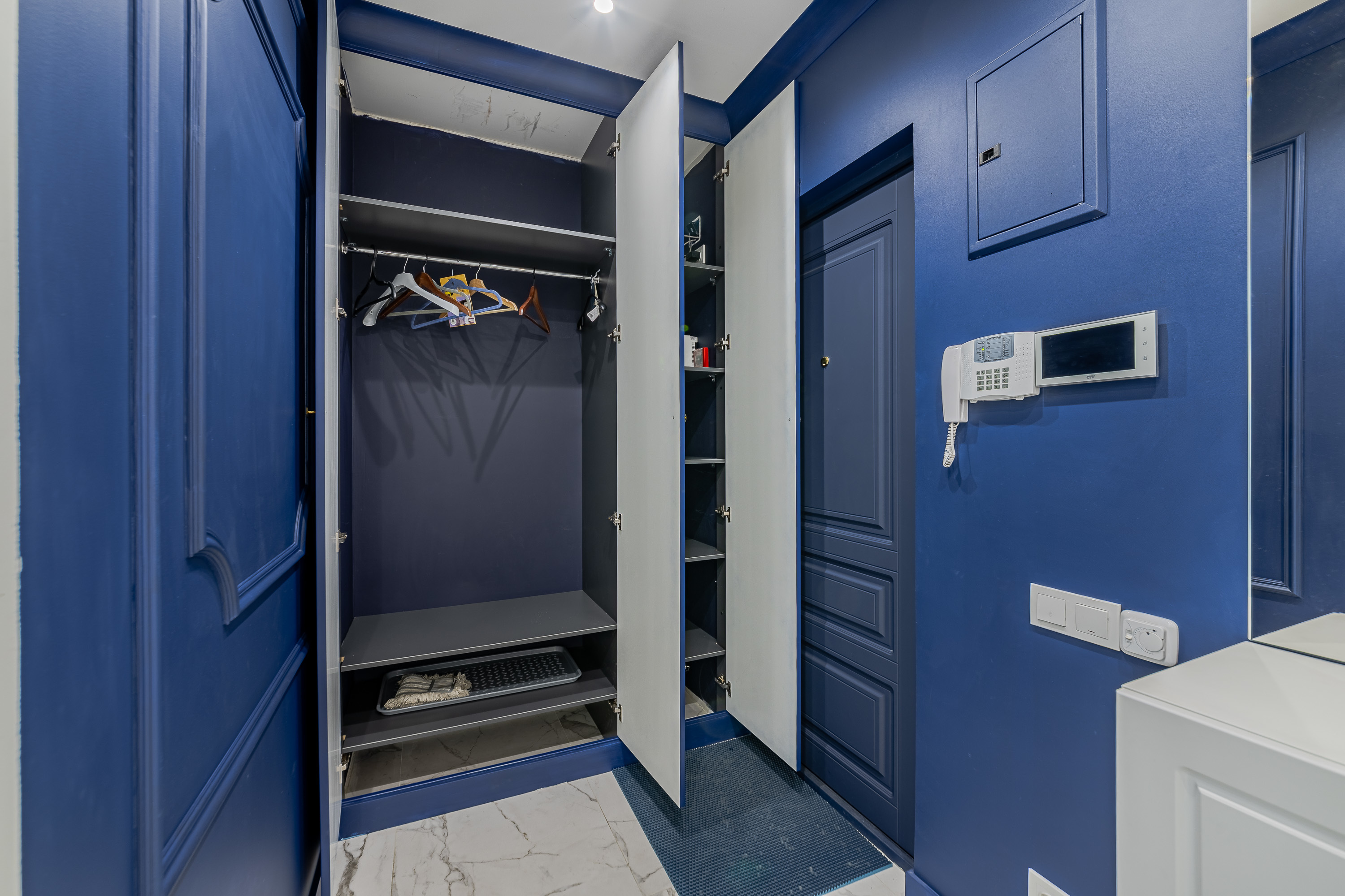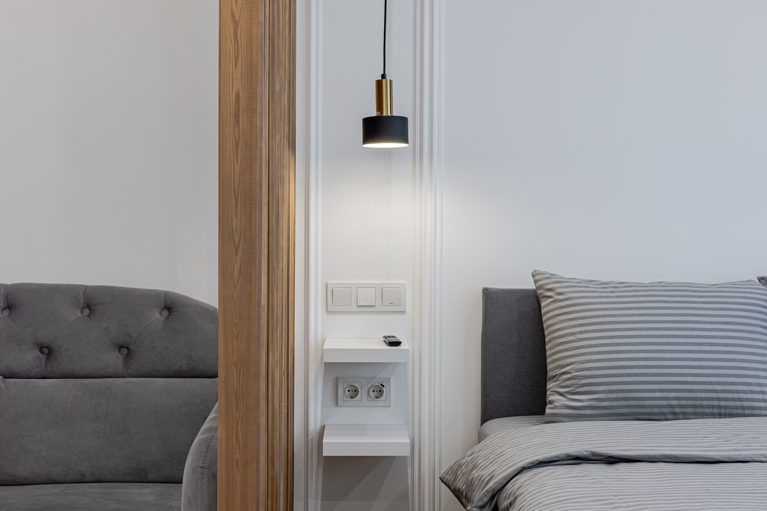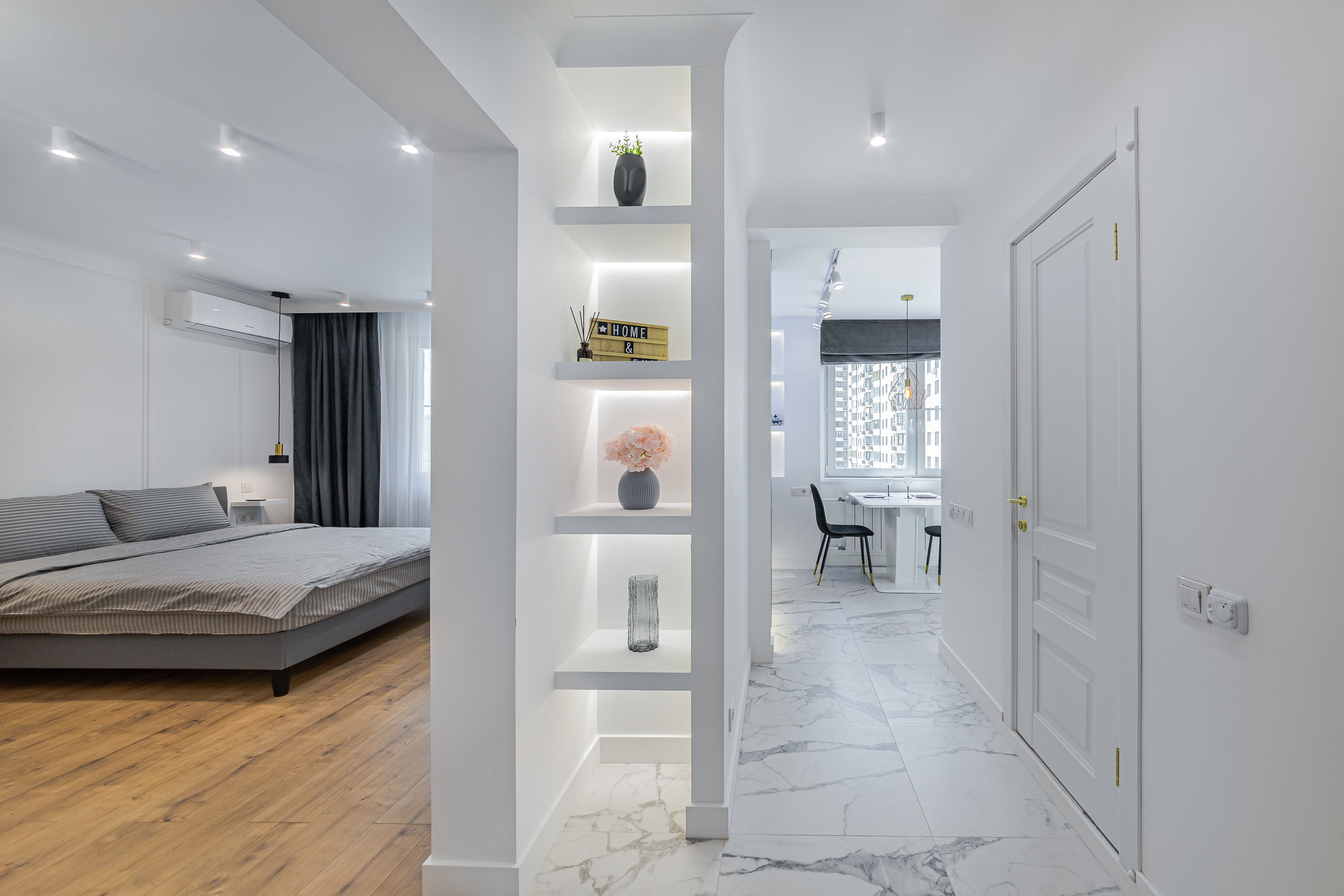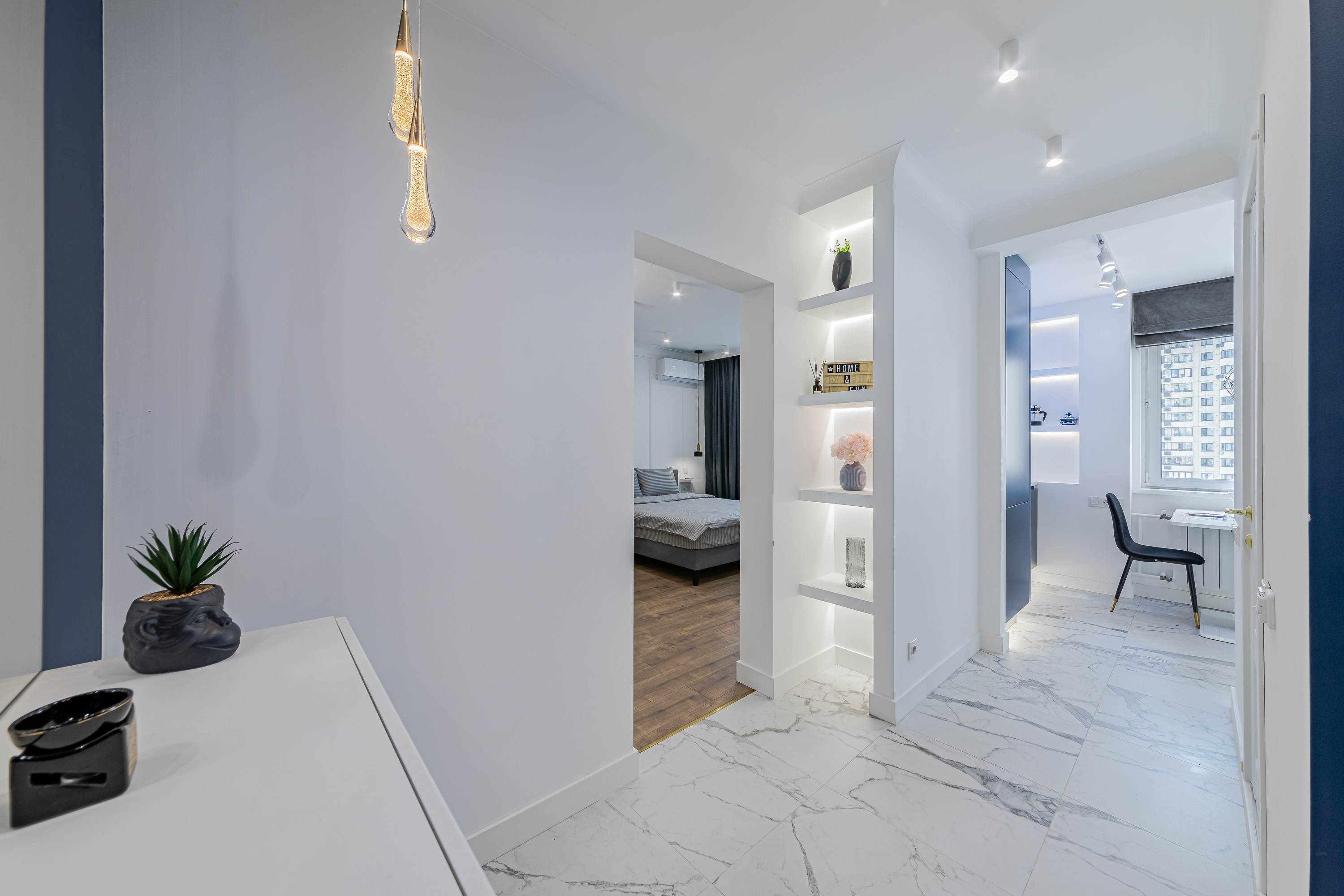 Квартира рассчитана на 3 гостей. Остановитесь в новой уютной квартире, оборудованной современной техникой и мебелью. Дизайн интерьера выполнен в светлых тонах, с синими акцентами. Полностью экипированная кухня с СВЧ, плитой и духовкой, вытяжкой, холодильником, электрическим чайником и посудомоечной машиной. В комнате достаточно места для длительного пребывания. Здесь есть огромный шкаф для хранения вещей, комфортная двуспальная кровать, а также диван, который служит дополнительным спальным местом.