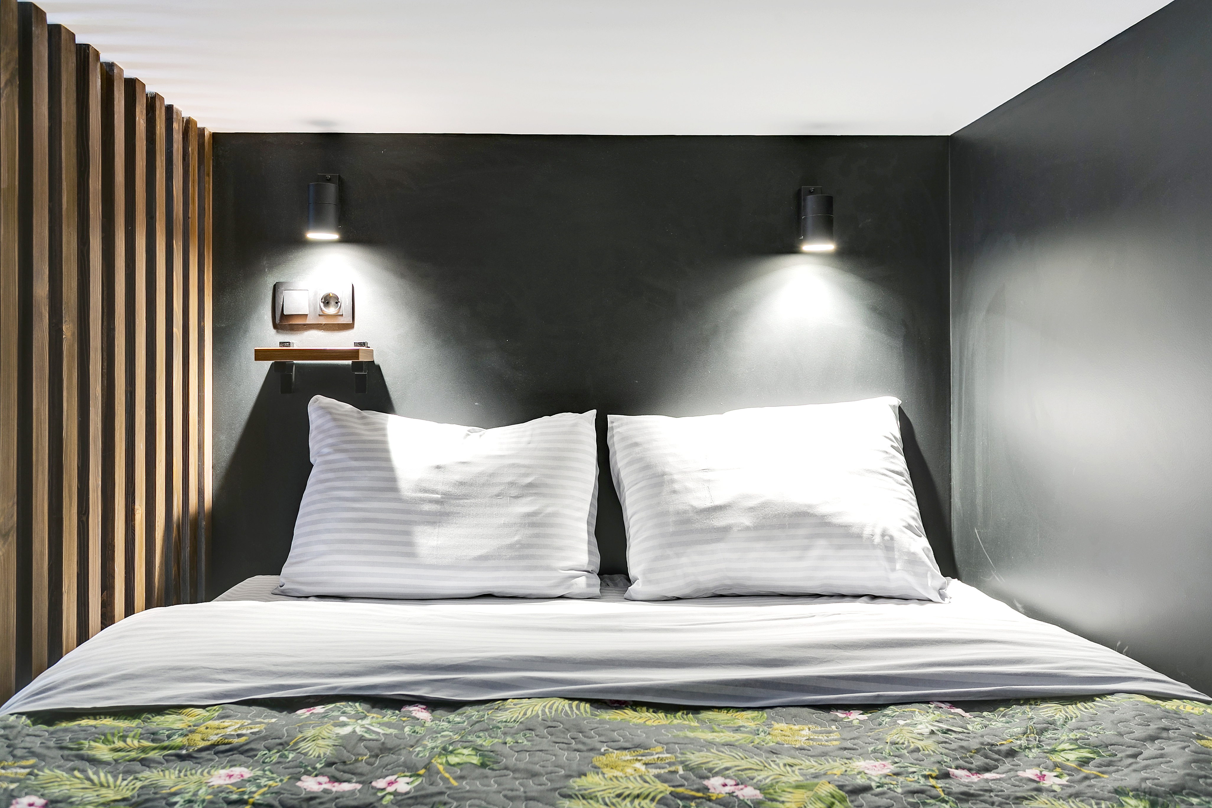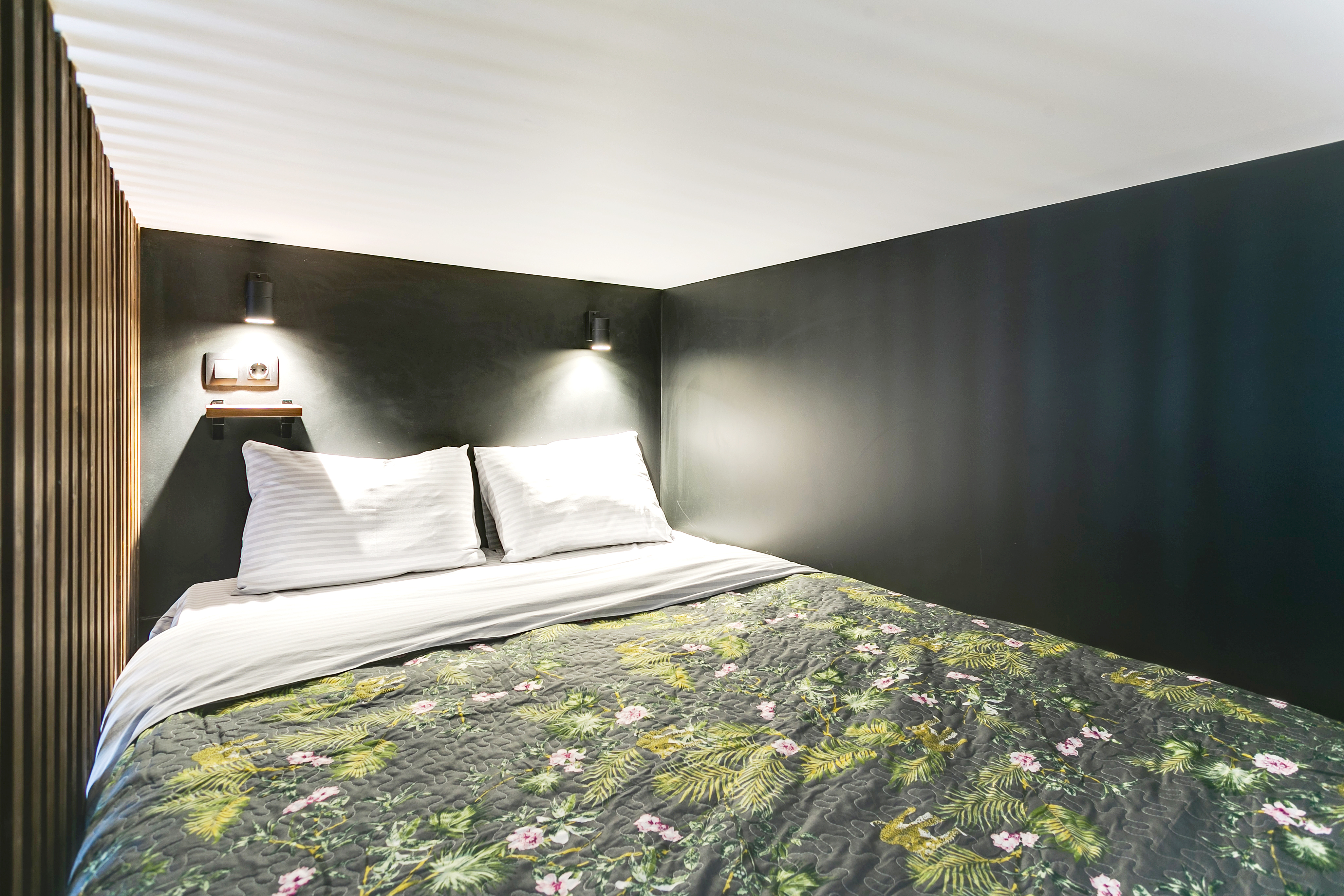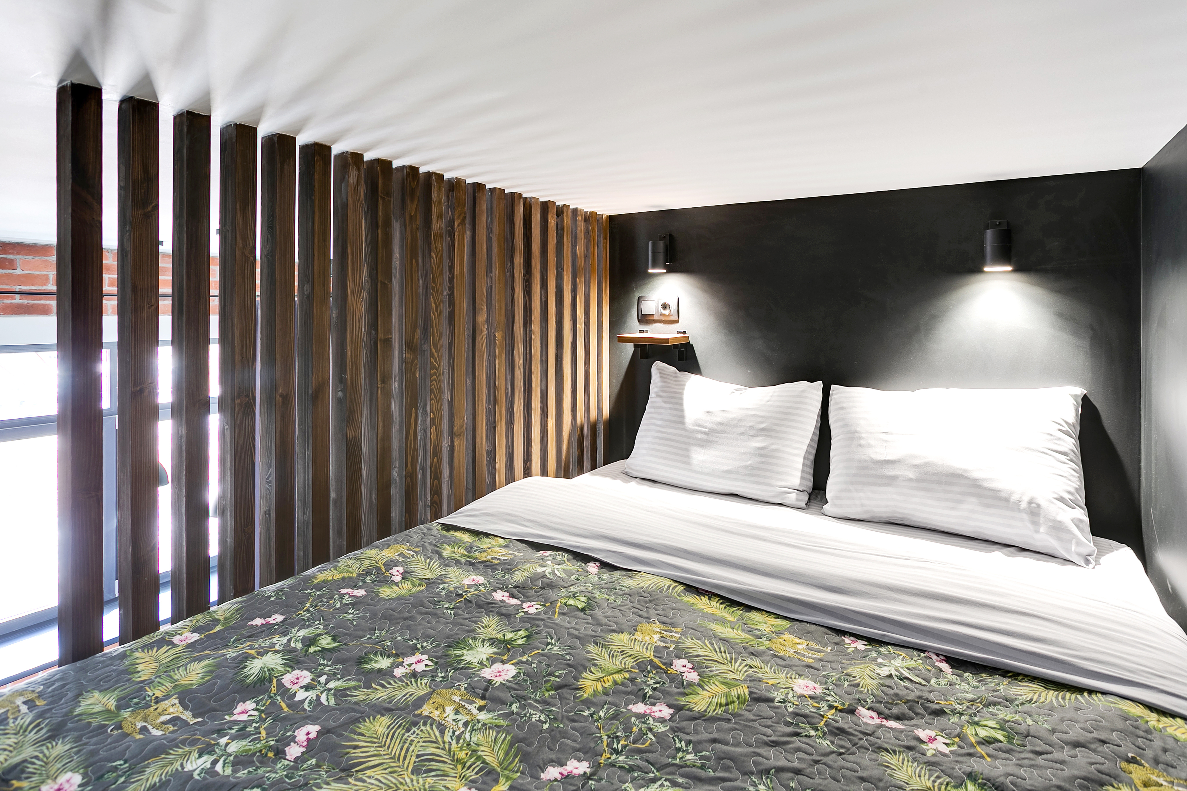 На втором уровне: спальная зона с большой удобной двуспальной кроватью и свежим постельным бельем.