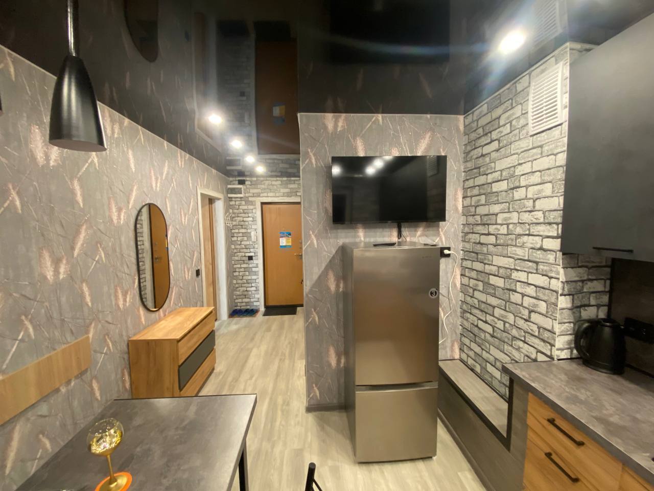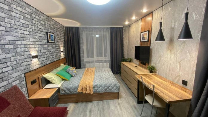 Хороший ремонт, стеклопакеты, ламинат. Есть вся необходимая мебель для комфортного проживания: двухспальная тахта, мягкая мебель, бытовая техника, санузел «под ключ». Стиральная машина, плазменный ТВ, посуда, всё необходимое для комфортного проживания. Безлимитный Wi-Fi Интернет.