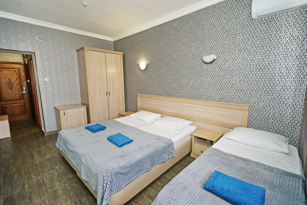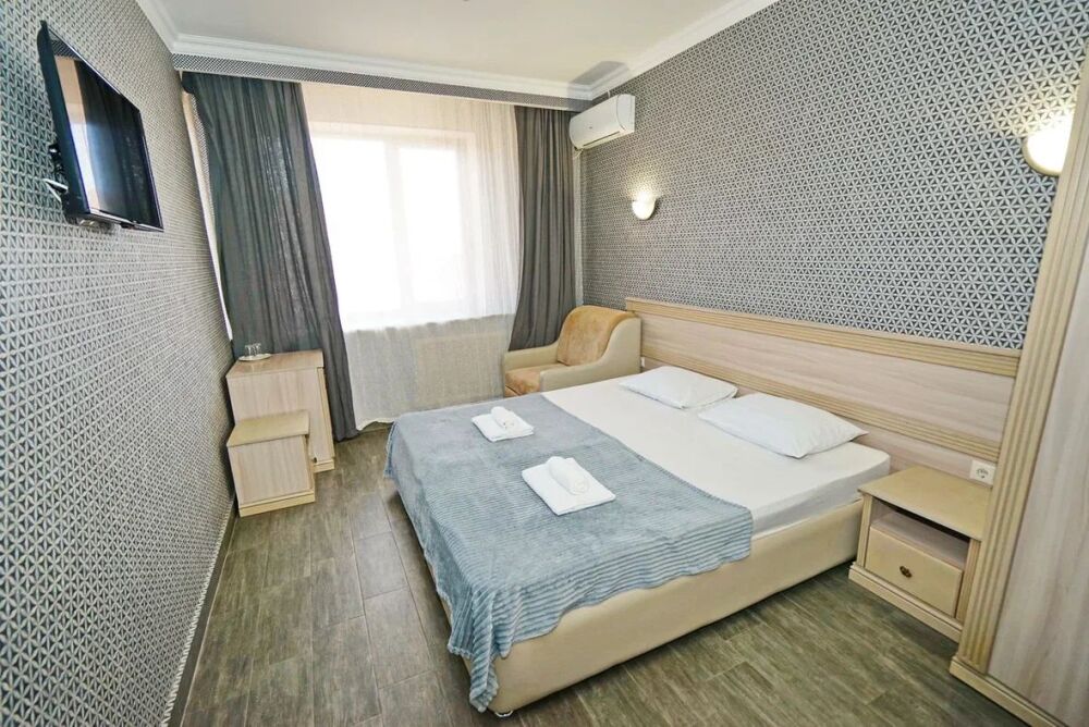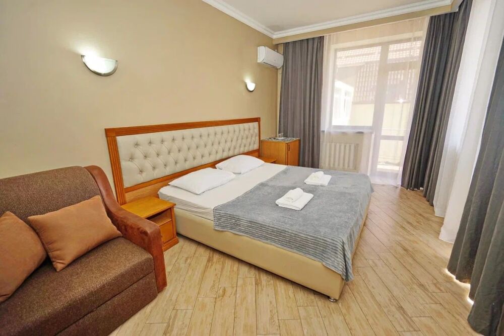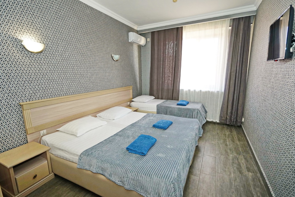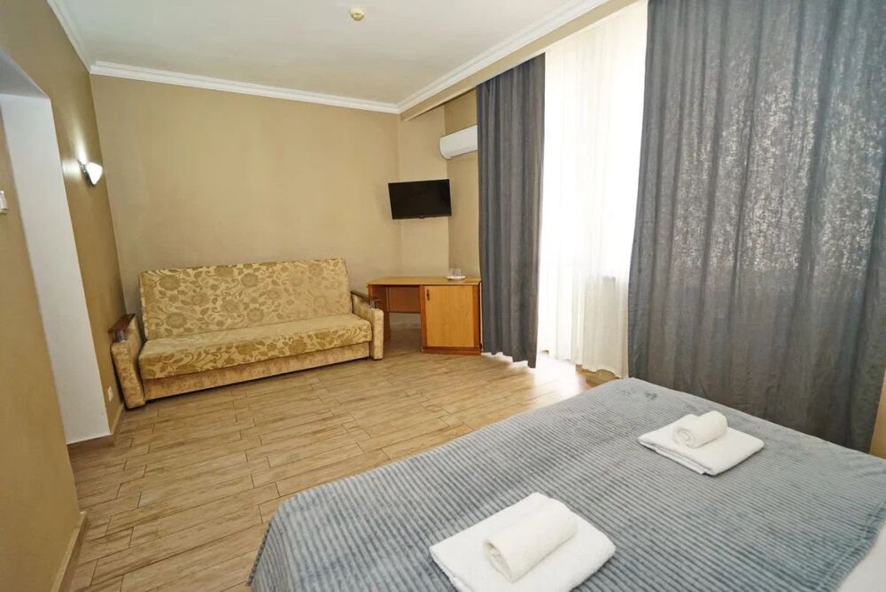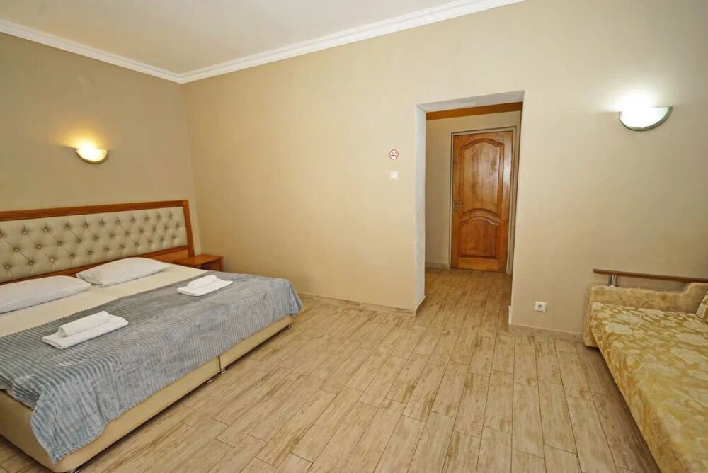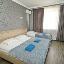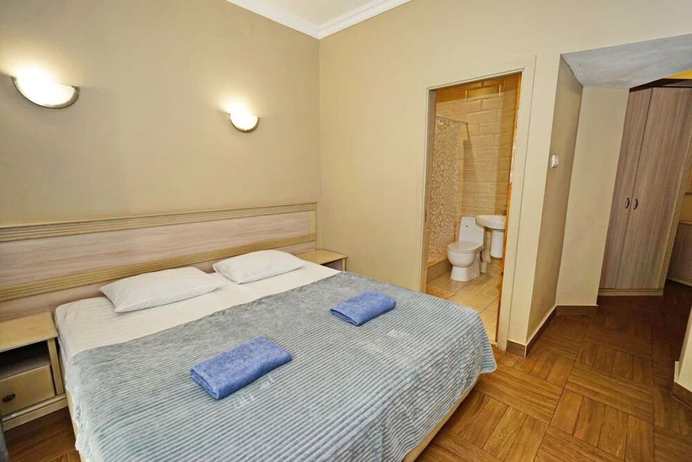Комфортные номера со всей необходимой техникой. Кровати трансформеры (2 односпальные или 1 двуспальная кровать) и кресло-кровать, прикроватные тумбы, стол, стулья, шкаф, вешалки, зеркало, постельное белье, полотенца, фен, телевизор, чайник, интернет кабельное, кондиционер, холодильник, санузел совмещённый.