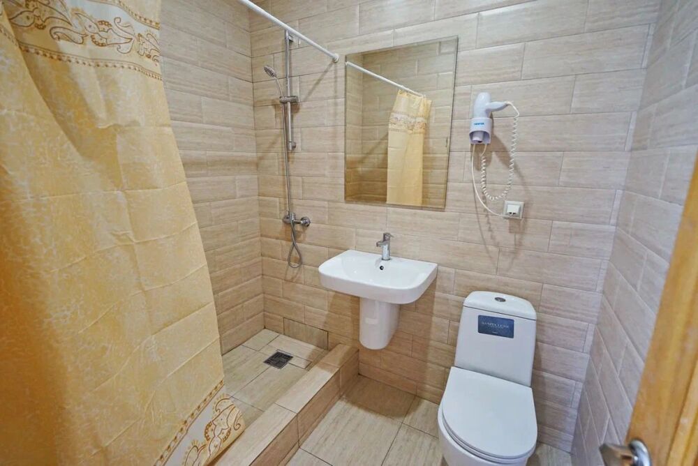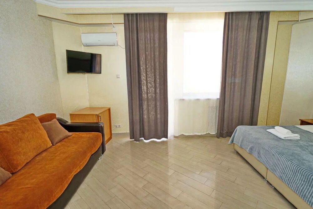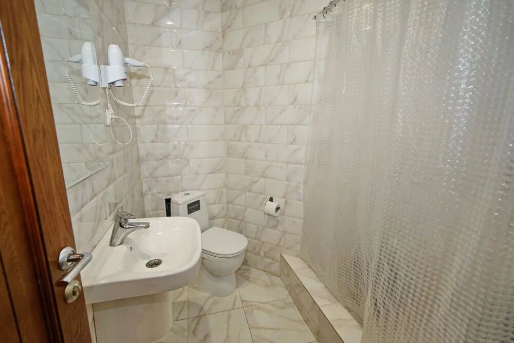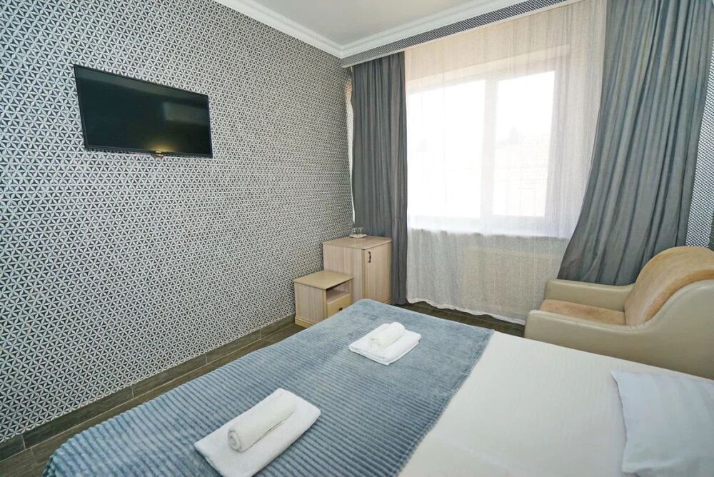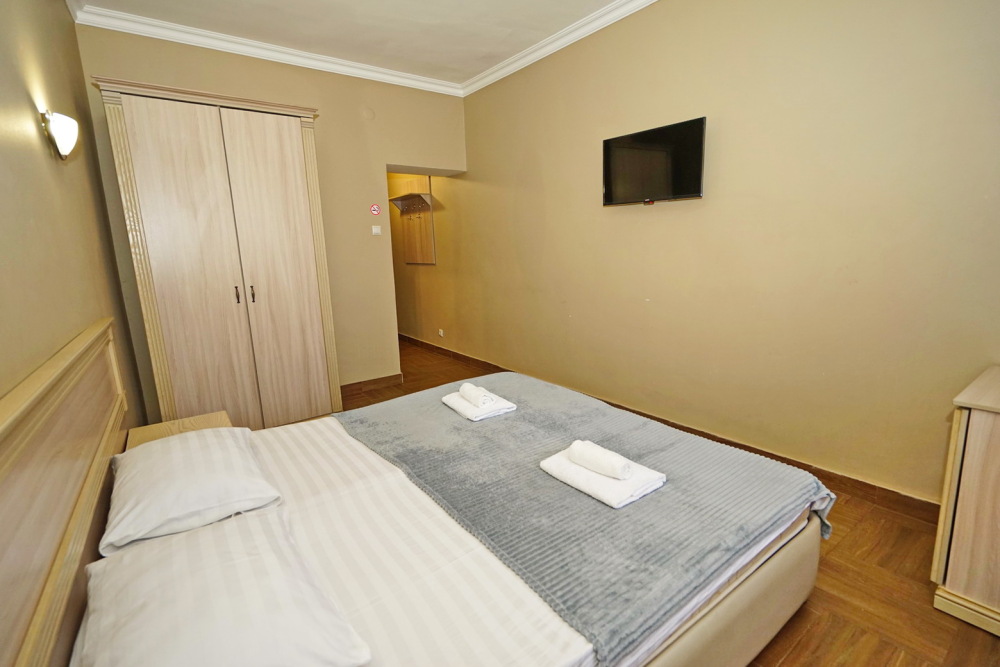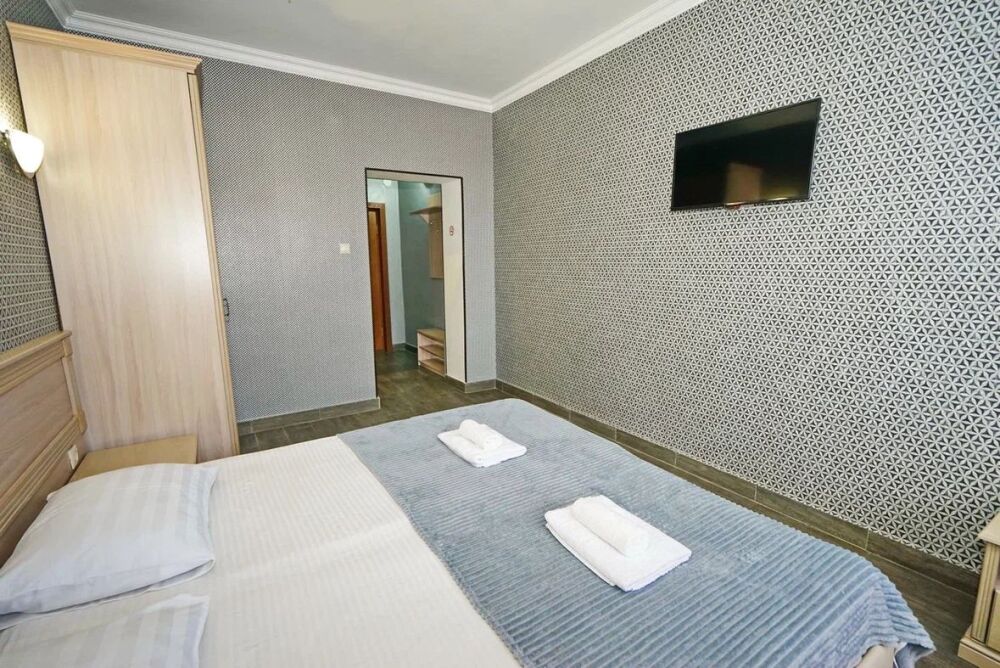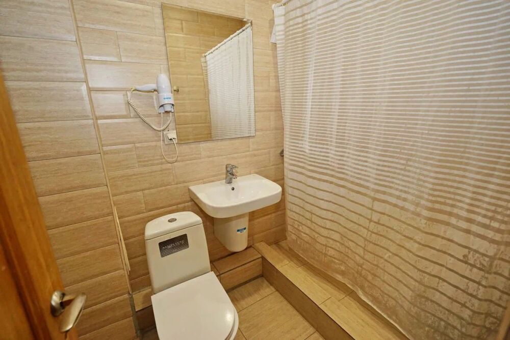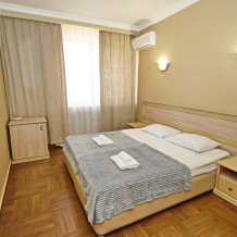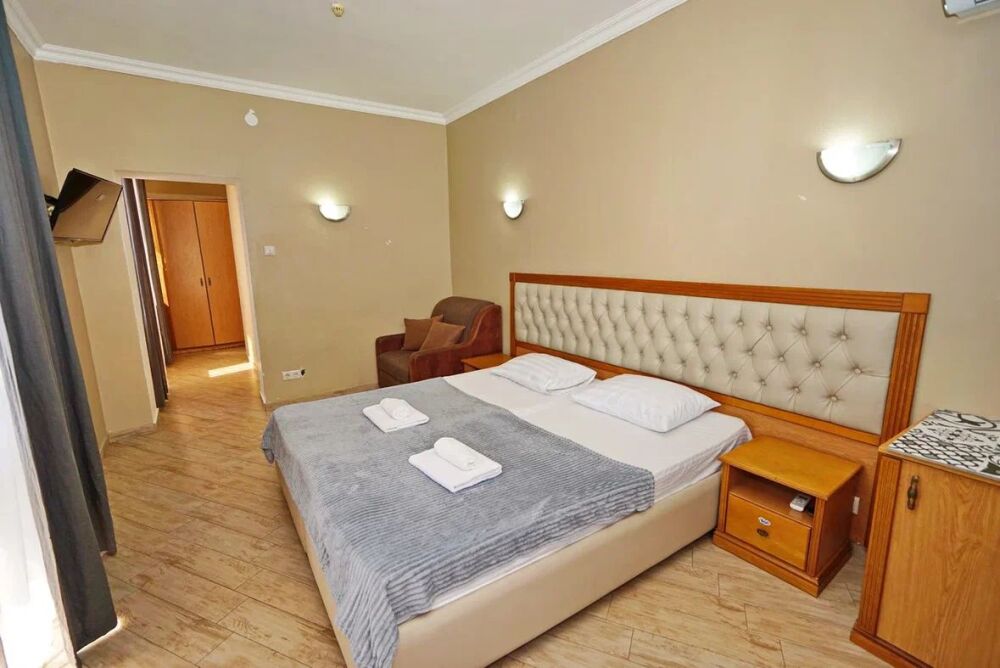 Комфортные номера со всей необходимой техникой. Кровати трансформеры (2 односпальные или 1 двуспальная кровать) и кресло-кровать, прикроватные тумбы, стол, стулья, шкаф, вешалки, зеркало, постельное белье, полотенца, фен, телевизор, чайник, интернет кабельное, кондиционер, холодильник, санузел совмещённый.
