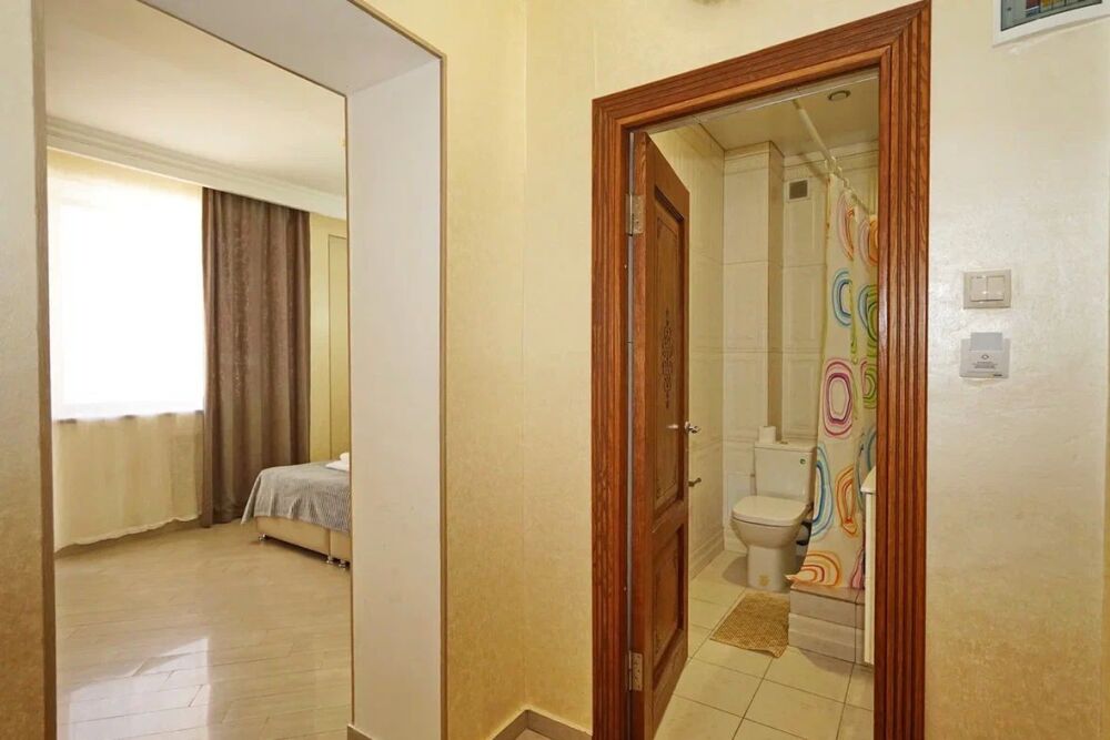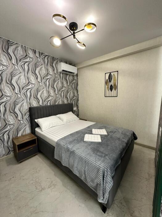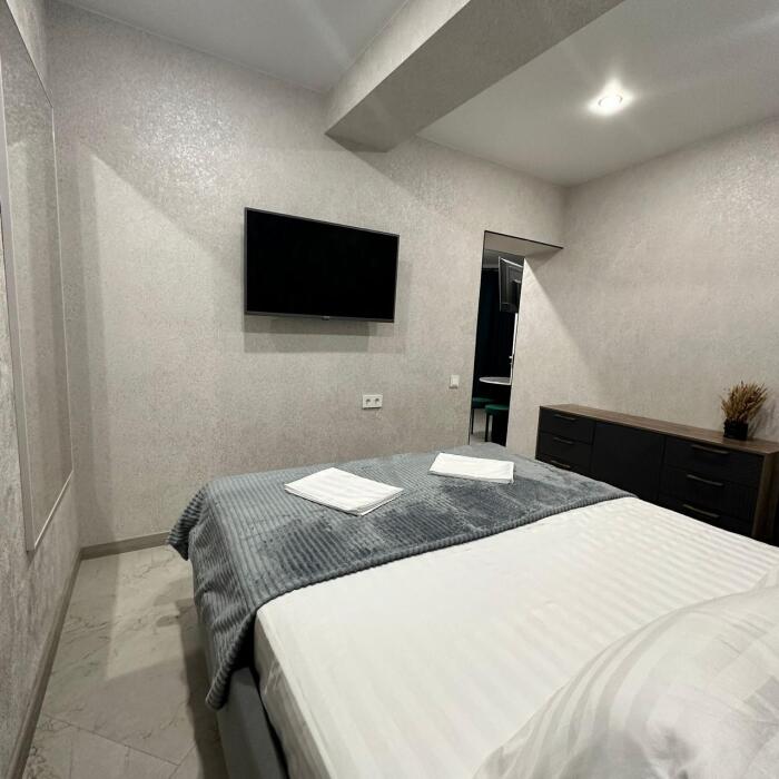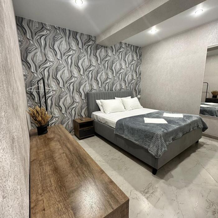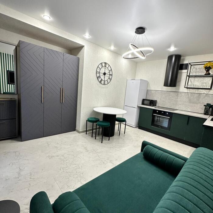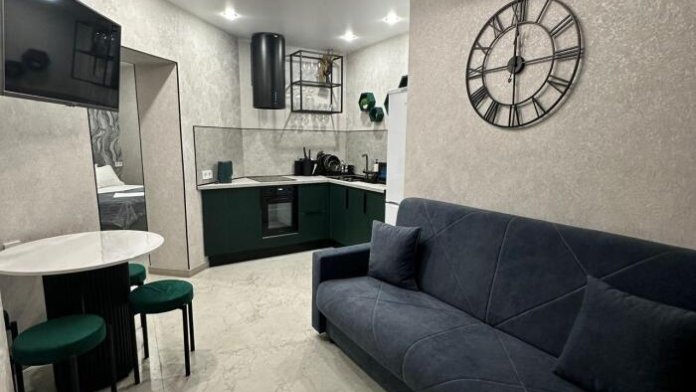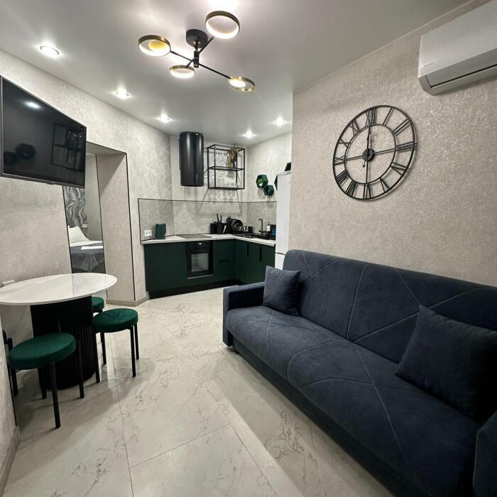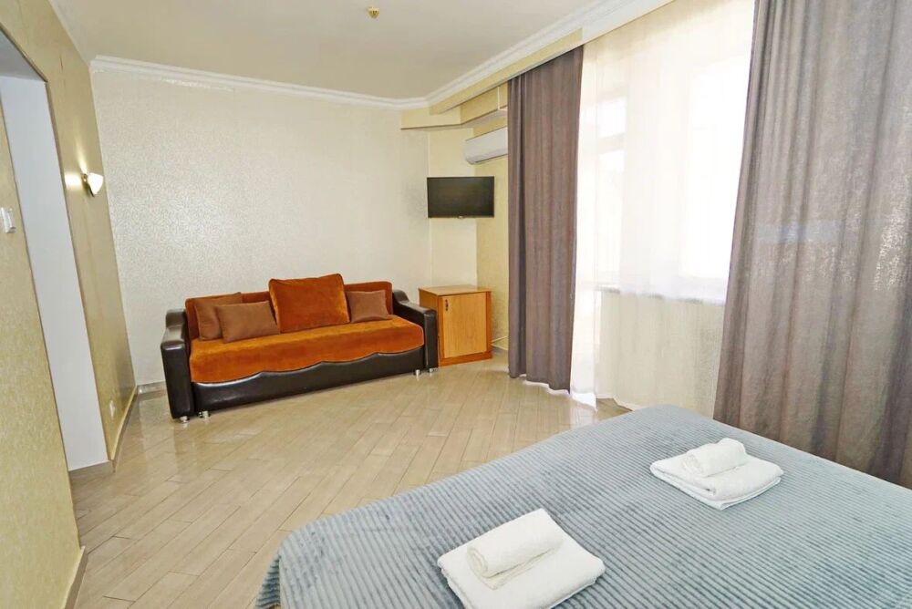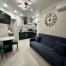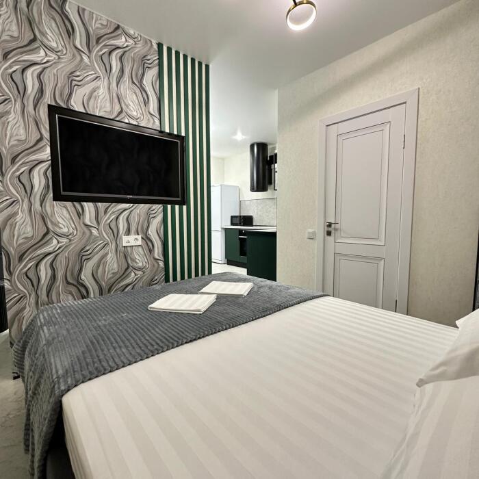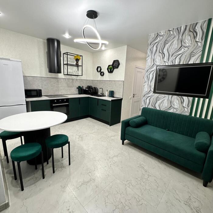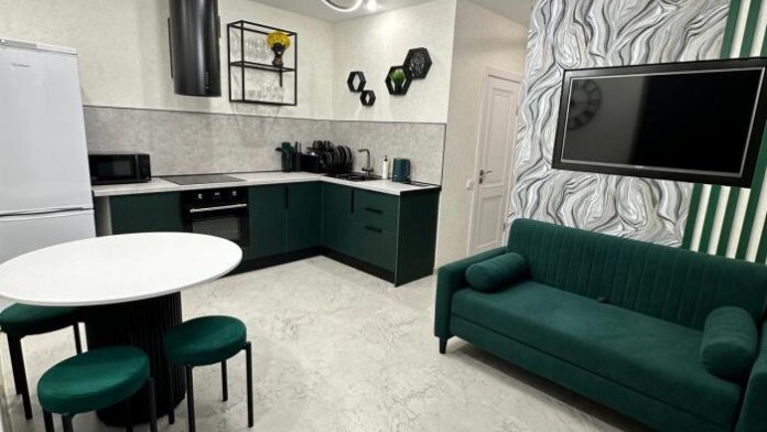 Люксовые апартаменты с дизайнерским ремонтом по типу полноценной квартиры, которая состоит из спальни и кухни-гостиной. Номер оснащён двуспальной кроватью, двуспальным диваном, прикроватными тумбами, комодом, шкафом для вещей, обеденной зонной и кухней с необходимой посудой. Так же в номере есть телевизор, холодильник, кондиционер, стиральная машина, фен, чайник, микроволновка ,плита, духовой шкаф, утюг с гладильной доской, сейф, интернет, кабельное, сушилка для одежды, гигиенические принадлежности в ванной, постельное белье, наборы полотенец.