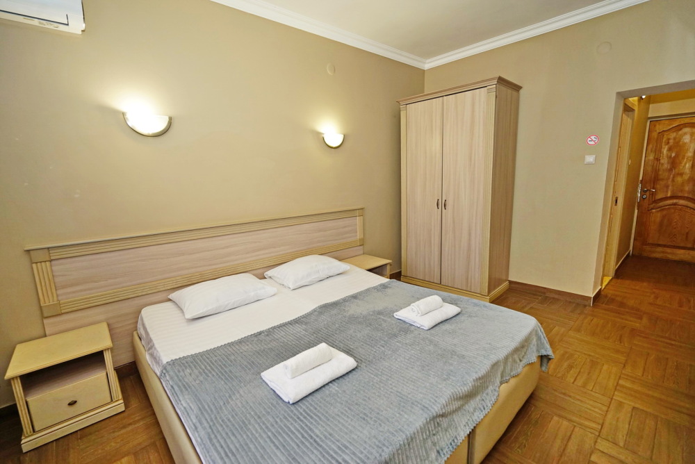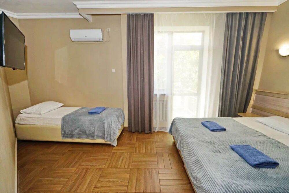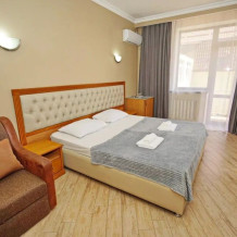 Комфортные номера со всей необходимой техникой. Кровати трансформеры (2 односпальные или 1 двуспальная кровать) и кресло-кровать, прикроватные тумбы, стол, стулья, шкаф, вешалки, зеркало, постельное белье, полотенца, фен, телевизор, интернет кабельное, кондиционер, холодильник, балкон, санузел совмещённый.