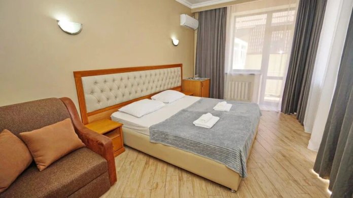 Комфортные номера со всей необходимой техникой. Кровати трансформеры (2 односпальные или 1 двуспальная кровать) и диван-кровать, прикроватные тумбы, стол, стулья, шкаф, вешалки, зеркало, постельное белье, полотенца, фен, телевизор, интернет кабельное, кондиционер, холодильник, балкон, санузел совмещённый.