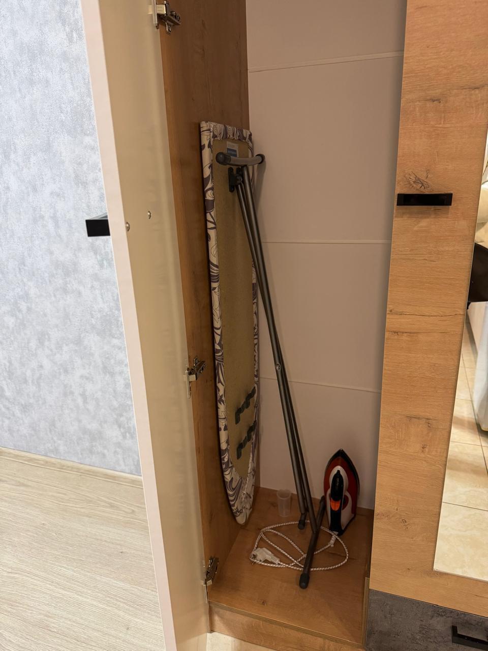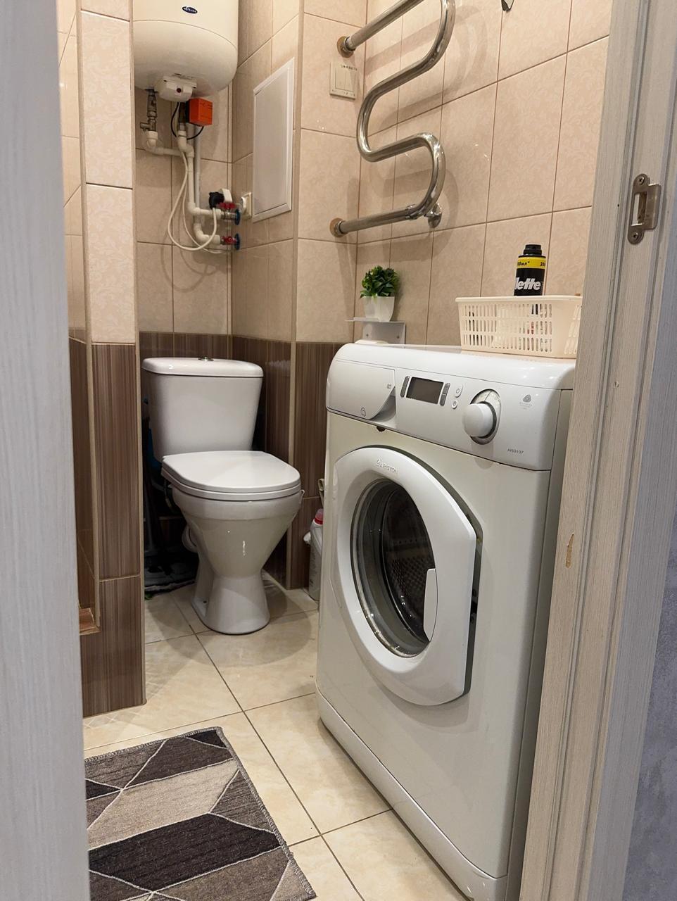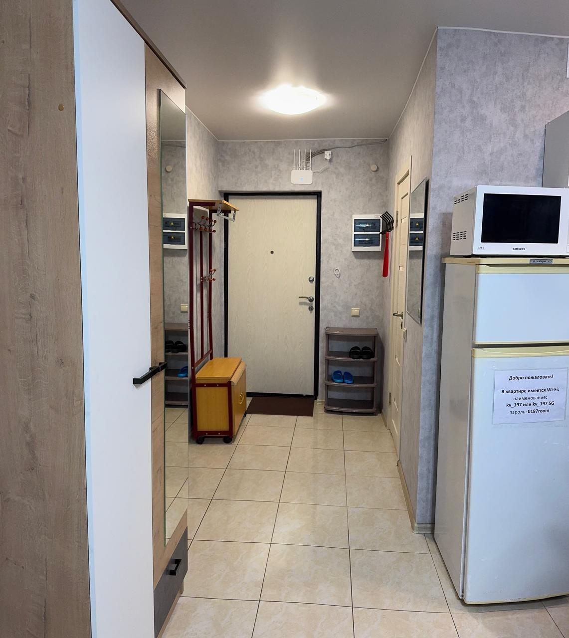 Кухонная зона оборудована всей необходимой техникой и посудой. В спальной зоне находится двуспальная кровать и шкаф. В ванной комнате установлена душевая кабинка и стиральная машинка.
