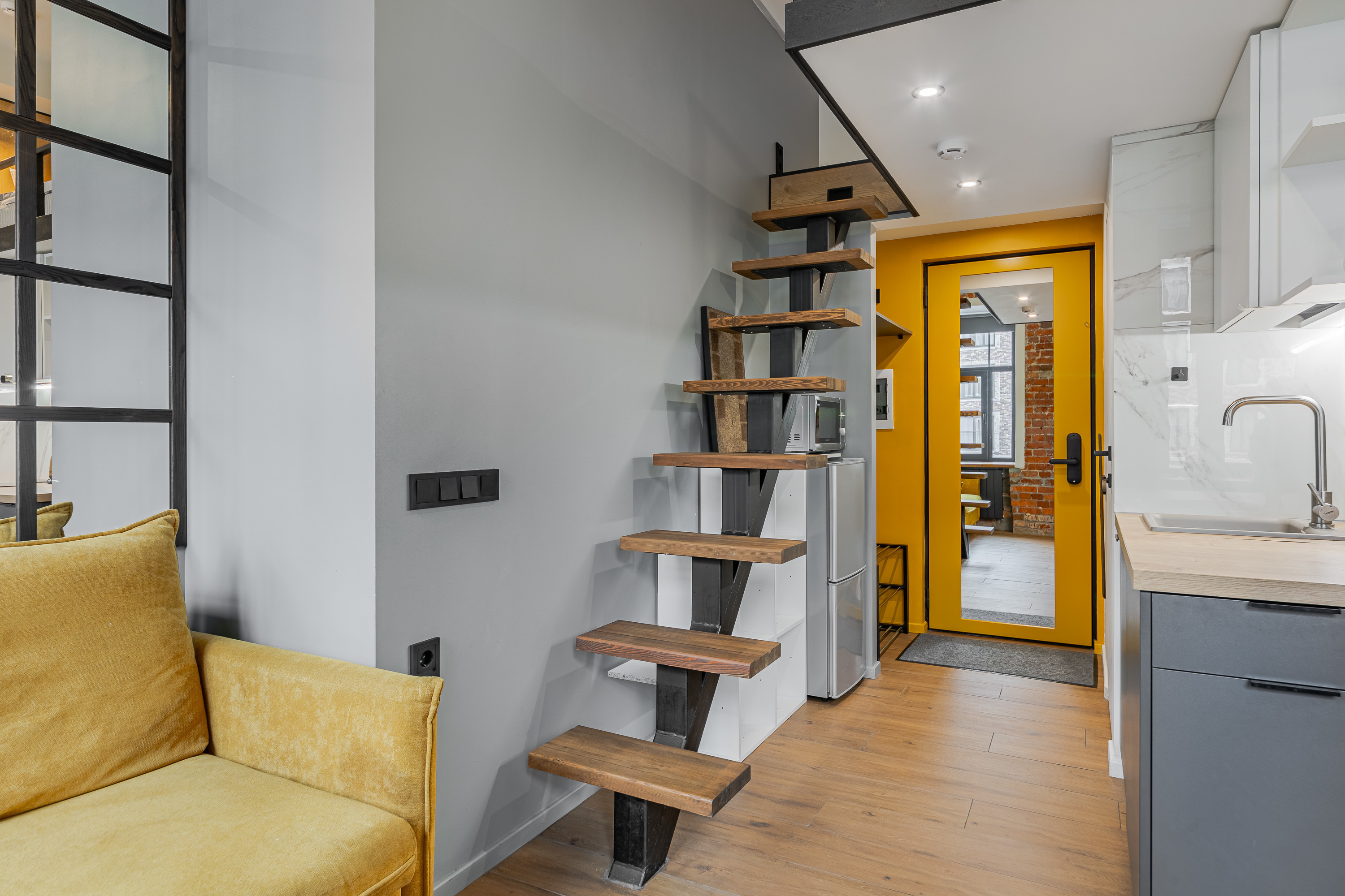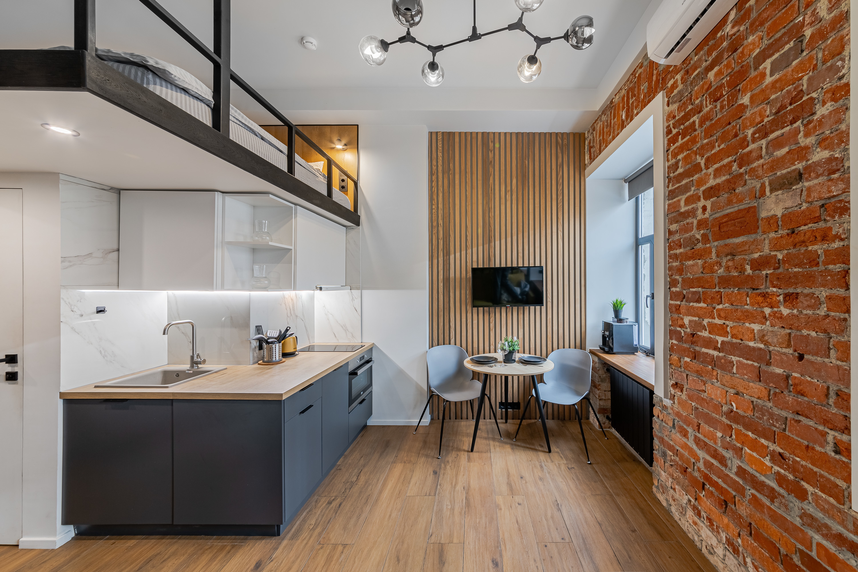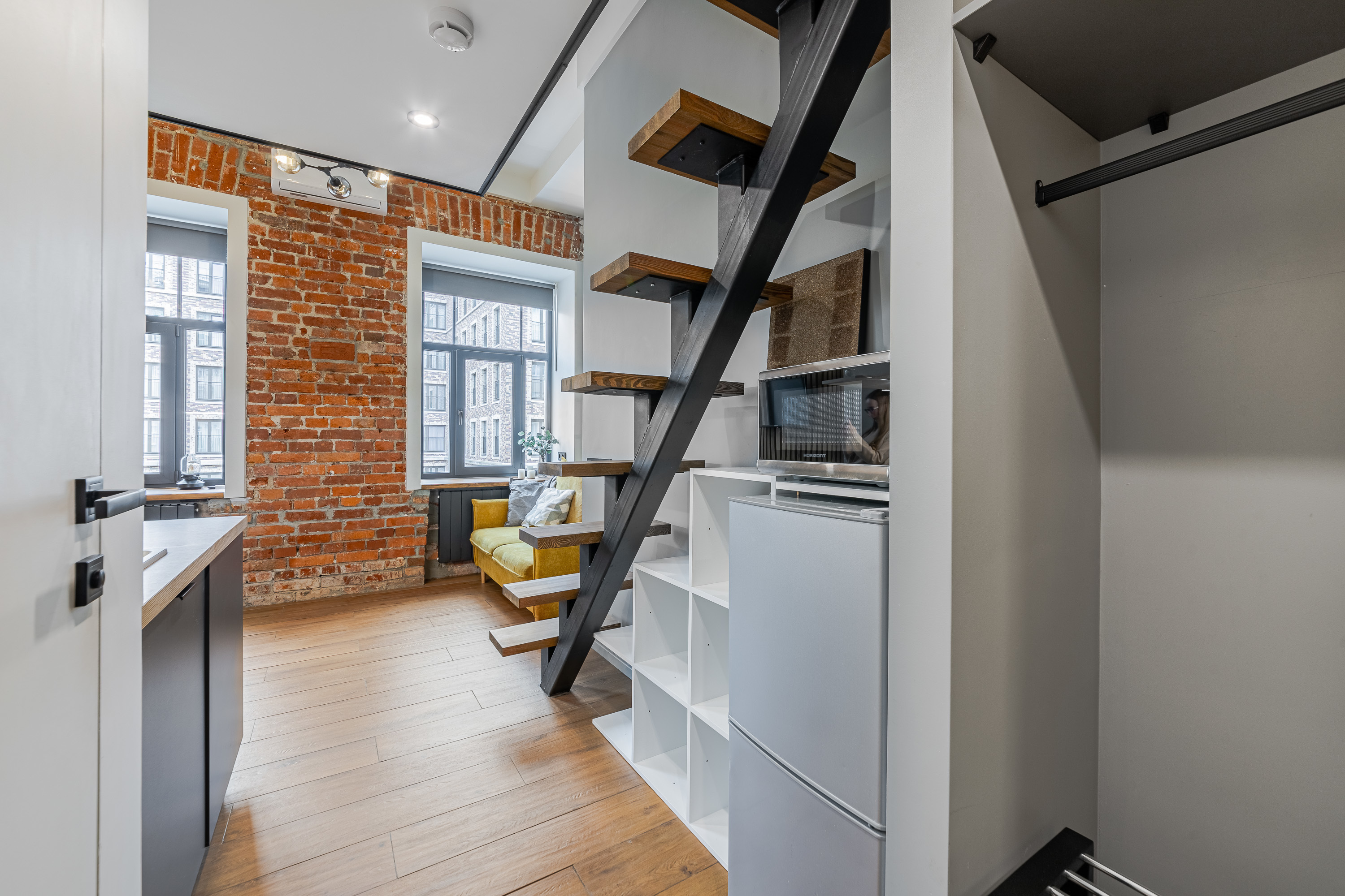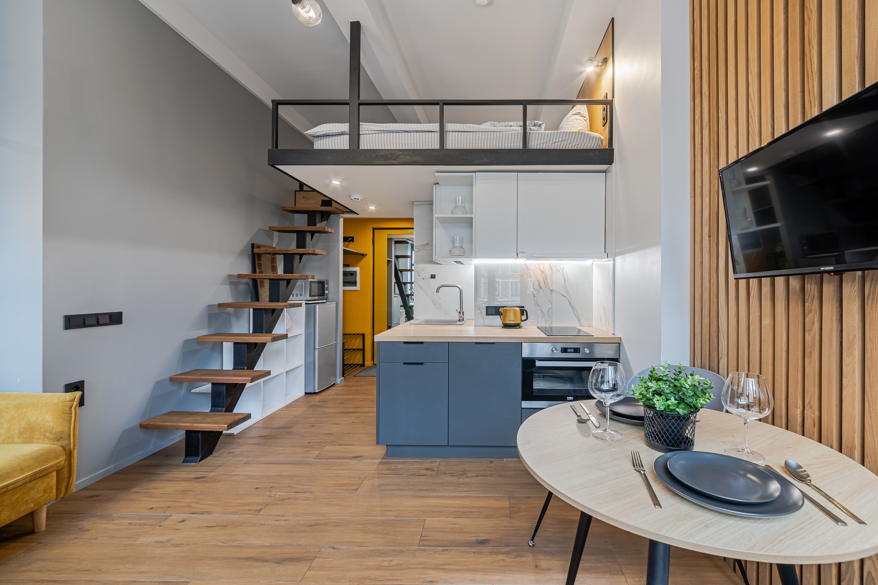 Отдельная спальная зона на втором уровне лофта для полноценного отдыха - вся необходимая мебель для проживания: 4 спальных места: двуспальная кровать и раскладывающийся диван для 2х гостей. Кухонный уголок со всей необходимой посудой для приготовления ваших кулинарных шедевров.