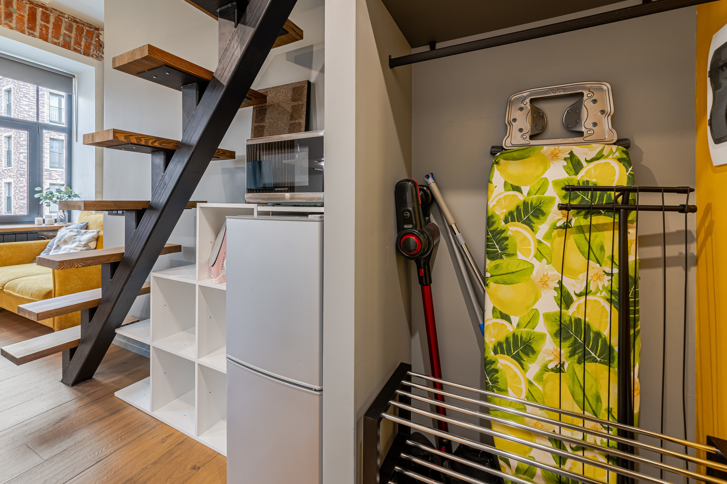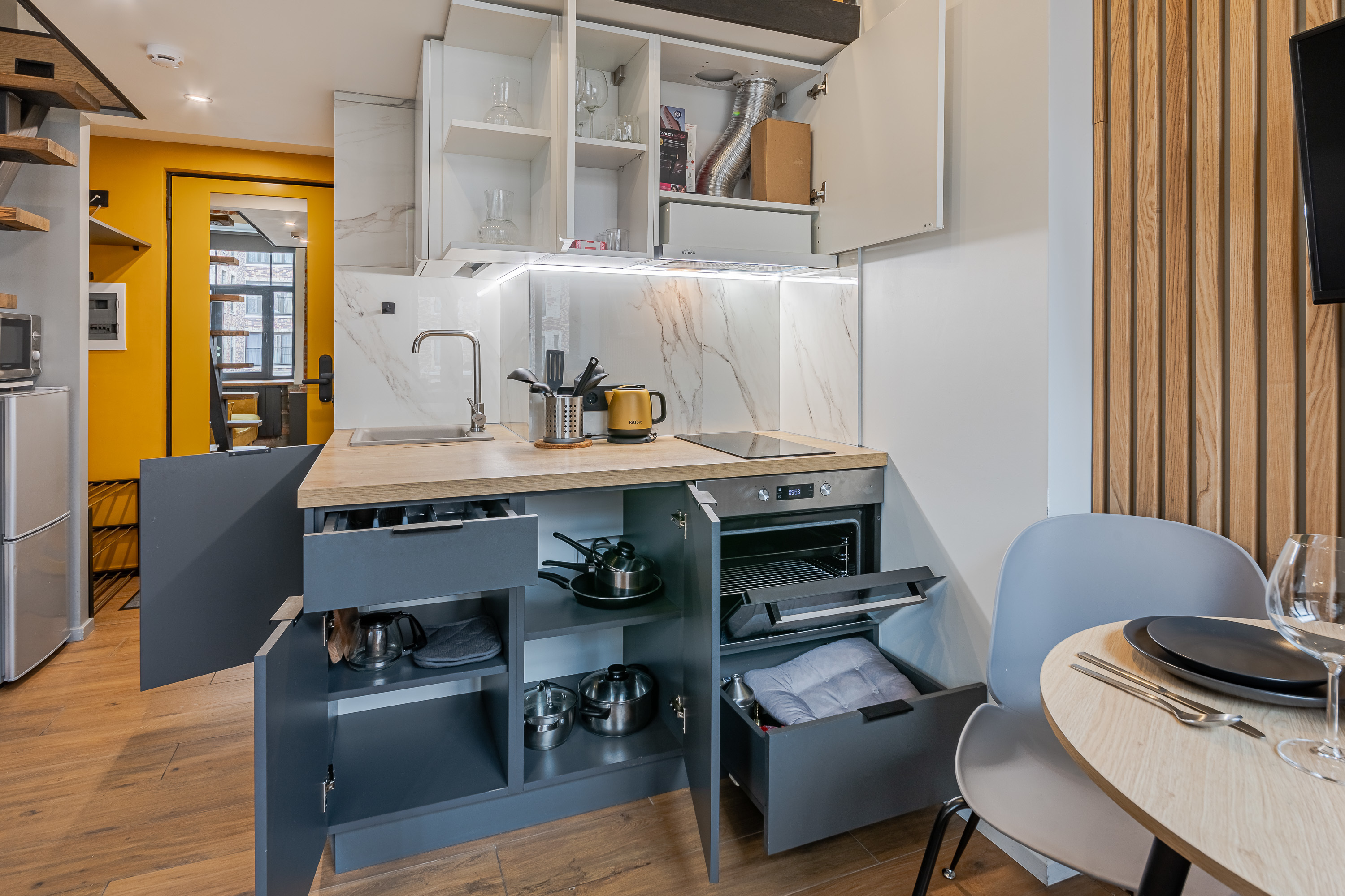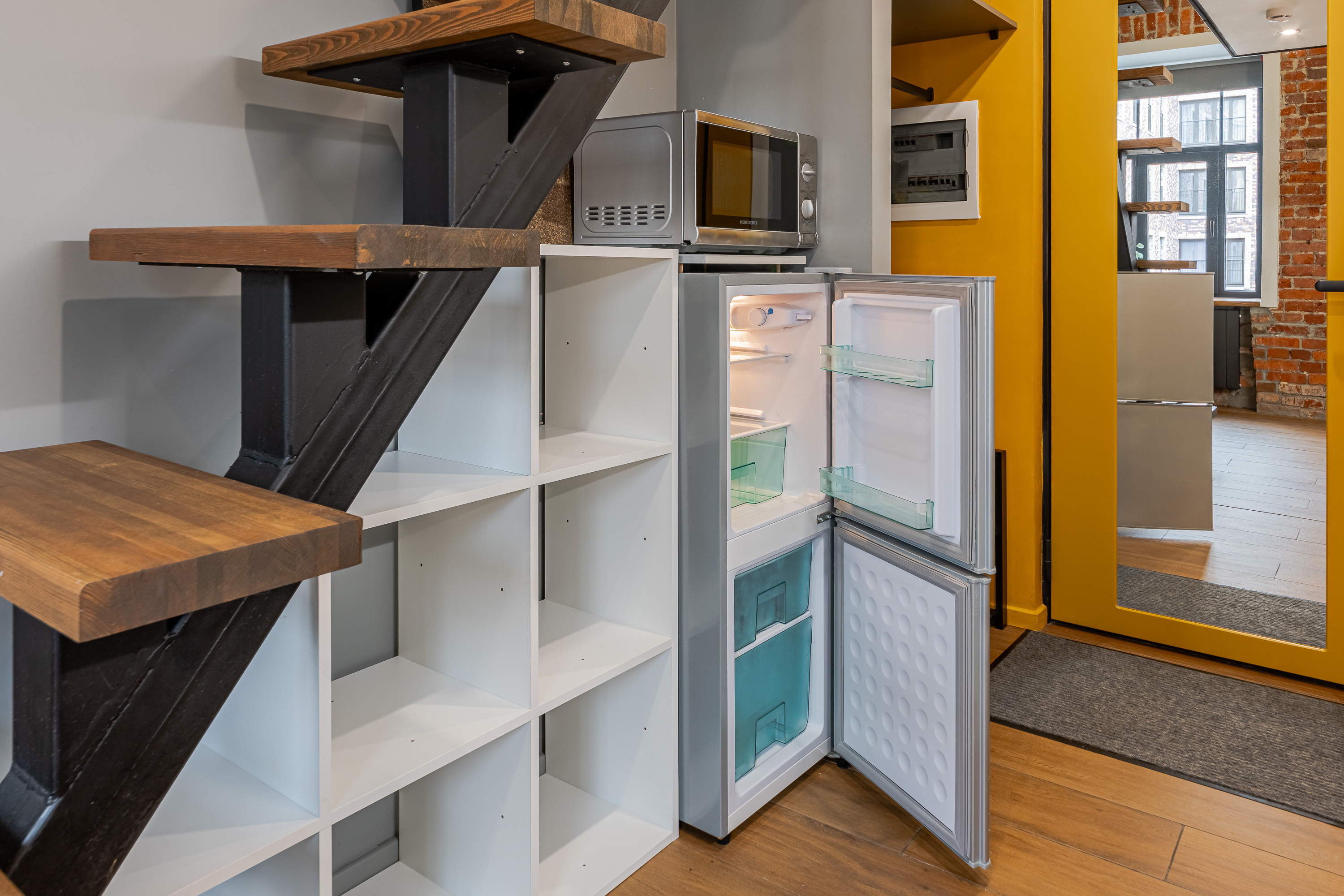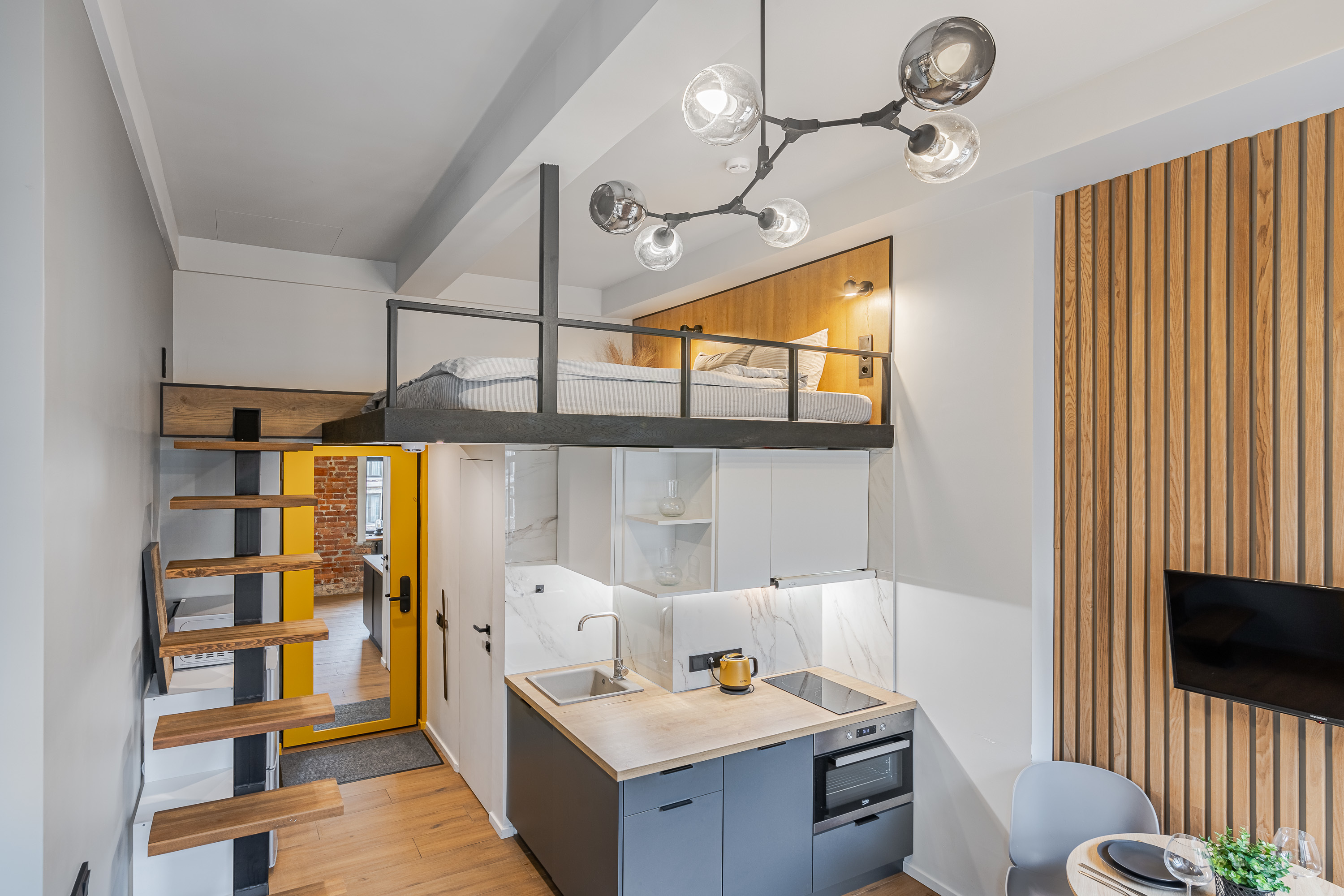 Отдельная спальная зона на втором уровне лофта для полноценного отдыха - вся необходимая мебель для проживания: 4 спальных места: двуспальная кровать и раскладывающийся диван для 2х гостей. Кухонный уголок со всей необходимой посудой для приготовления ваших кулинарных шедевров.