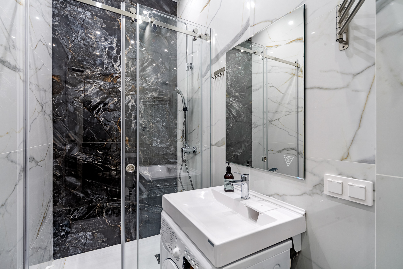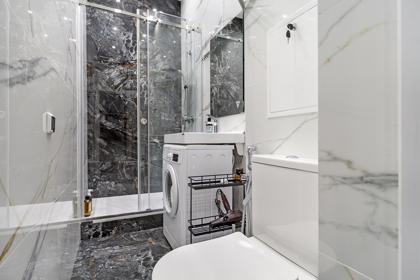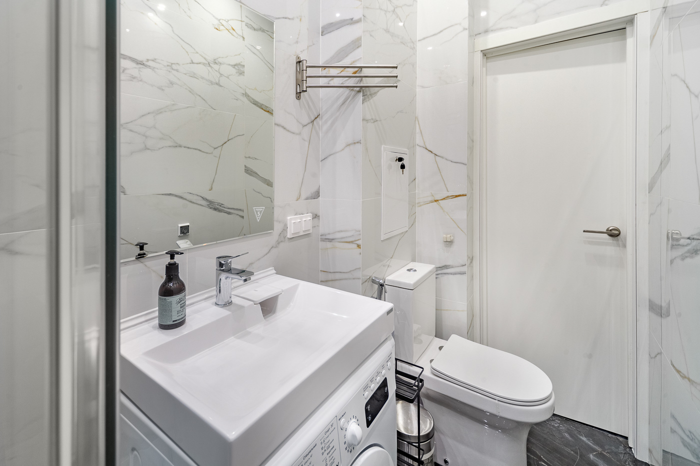 В ванной комнате установлена стиральная машина. Есть утюг и гладильные принадлежности.