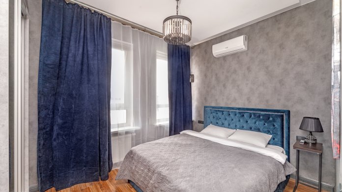 Апартаменты оформлены в современном стиле, в серых и синих оттенках. Полностью укомплектованы высококачественной мебелью и бытовой техникой студия для удобного размещения 1- 2 гостей. На кухне есть все самое необходимое для приготовления любых блюд: плита, холодильник, духовка, посудомоечная машина, чайник, кофемашина, вытяжка и набор посуды.