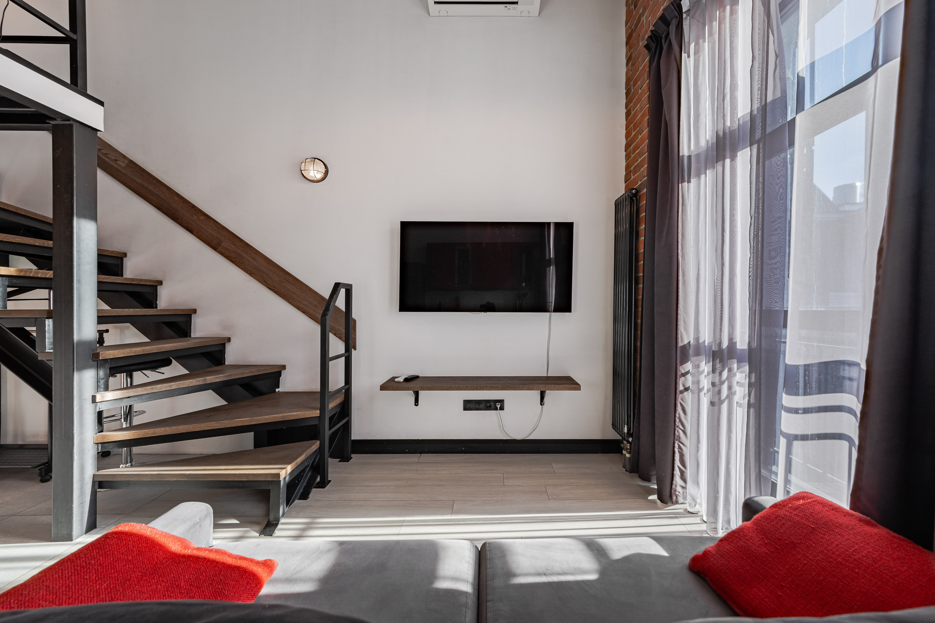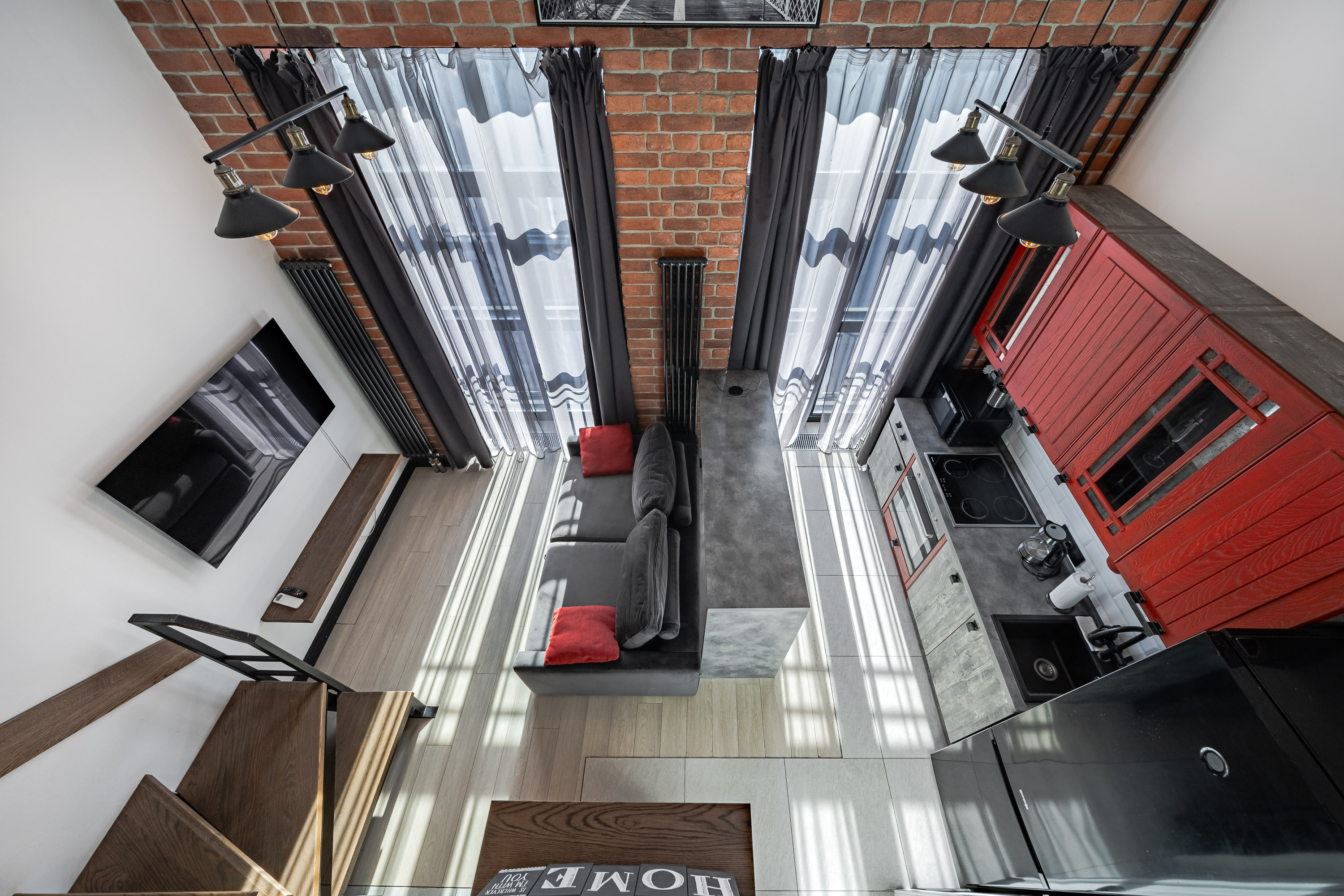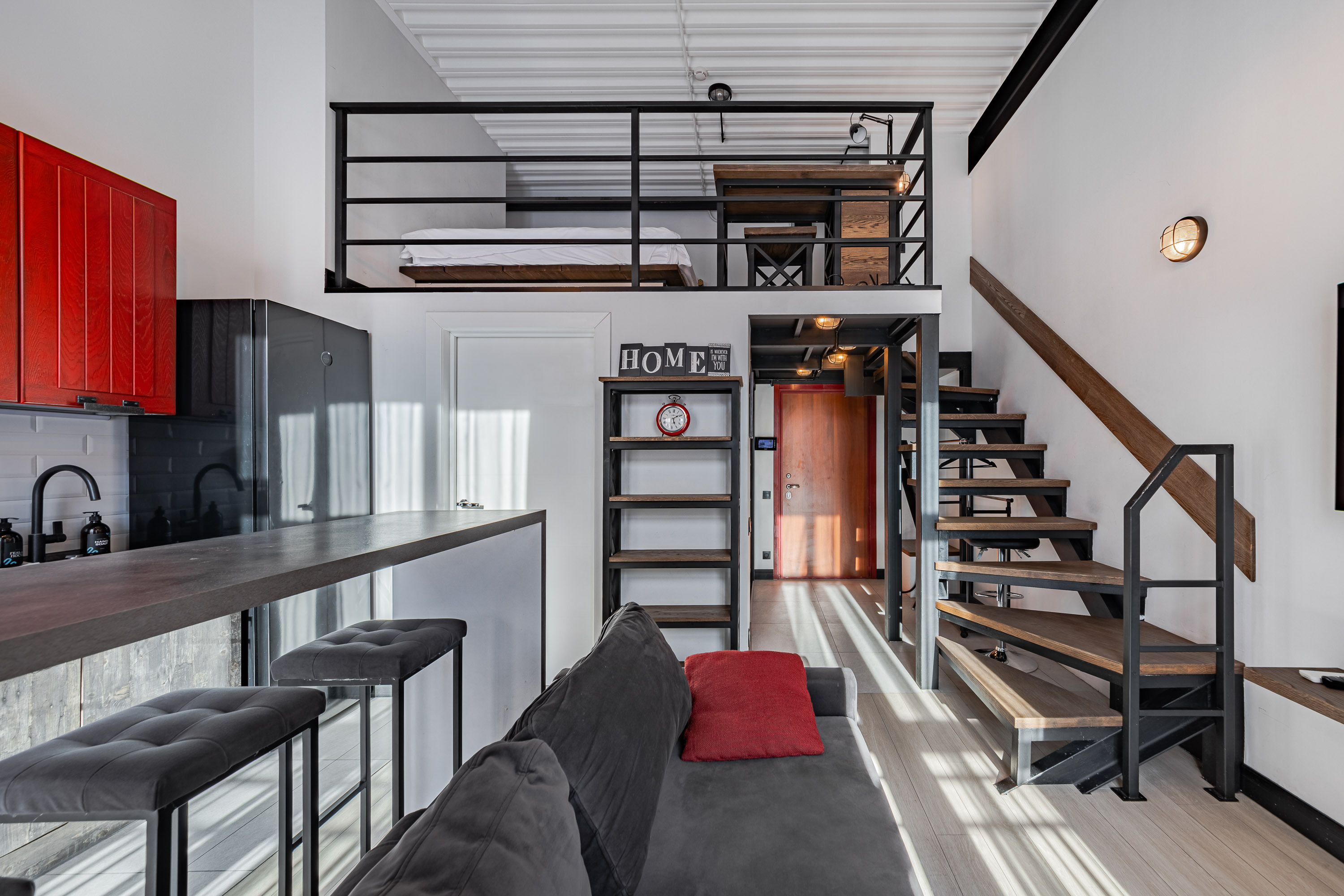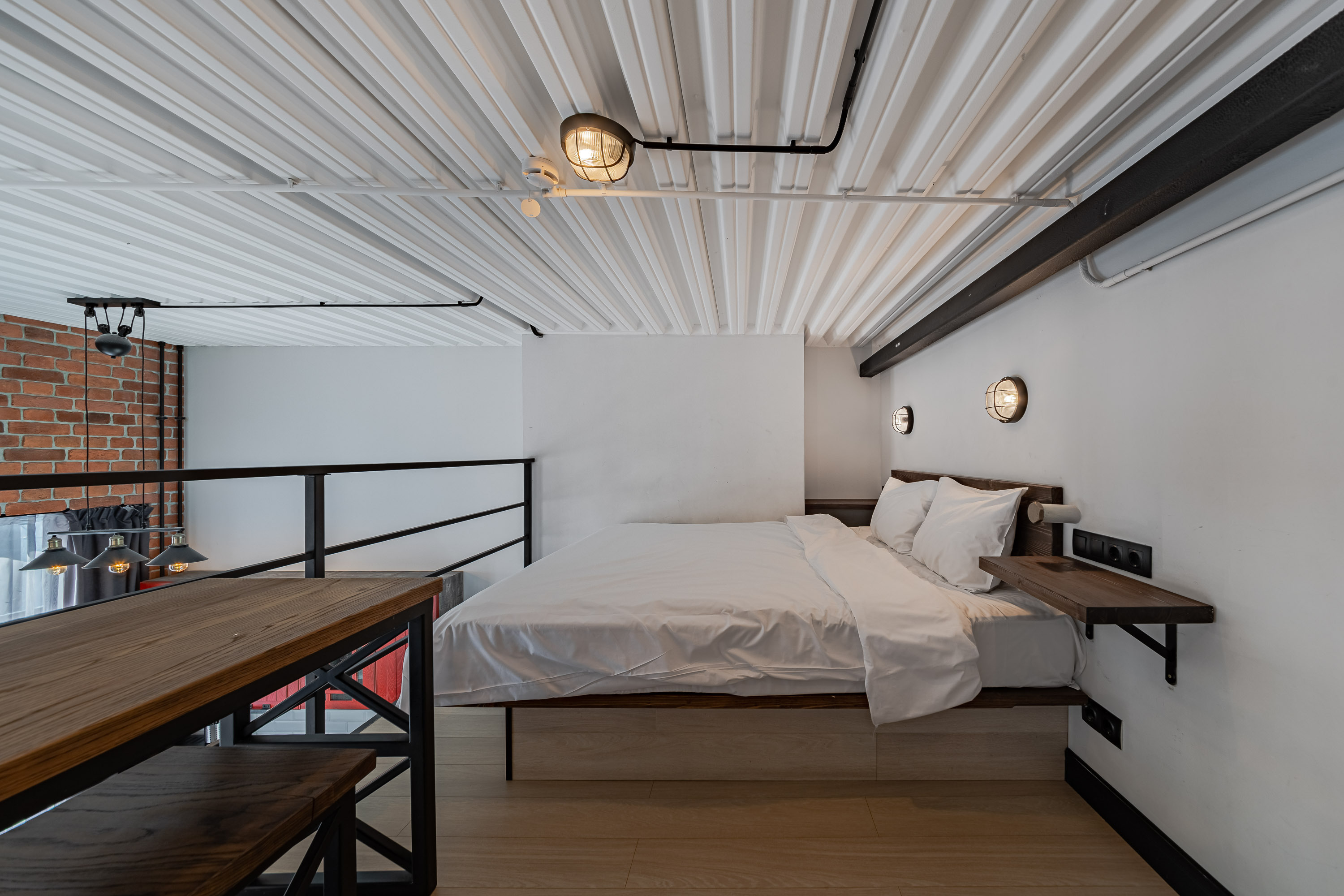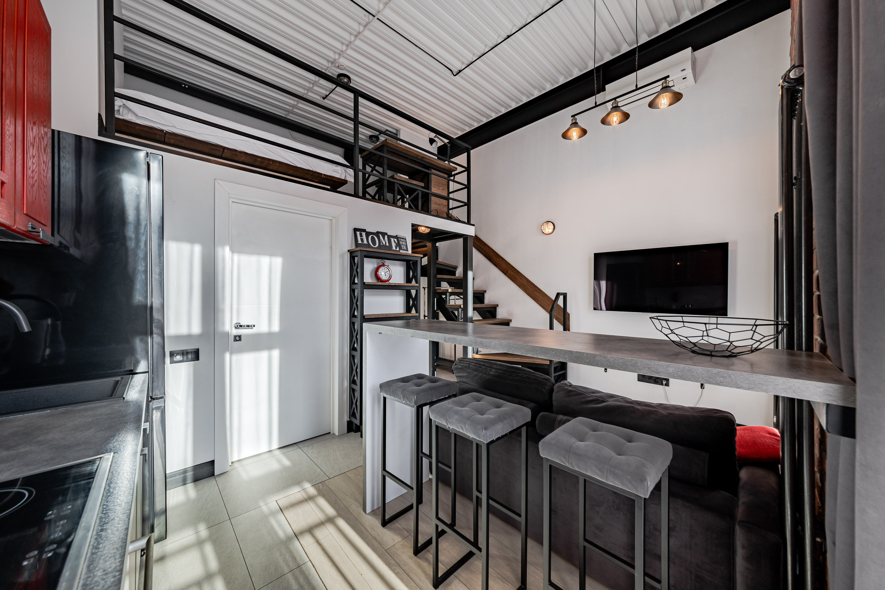 На первом уровне расположена кухня-гостиная с удобным диваном, который служит дополнительным спальным местом. Вы сможете не только пригласить друзей, но и приготовить им любимые блюда. Кухня полностью оснащена всем необходимым: плита, электрический чайник, холодильник и набор посуды для приготовления и приема пищи. На втором уровне расположена спальня с большой двухспальной кроватью, а также оборудованы гардеробная и рабочее место. Вы сможете не только отдохнуть, но и поработать, т.к. доступен скоростной интернет. Светлая ванная комната со стиральной машиной и просторным душевым отсеком находится на первом уровне лофта. Там вы найдете все необходимое для принятия душа: мыльные принадлежности и свежие полотенца.