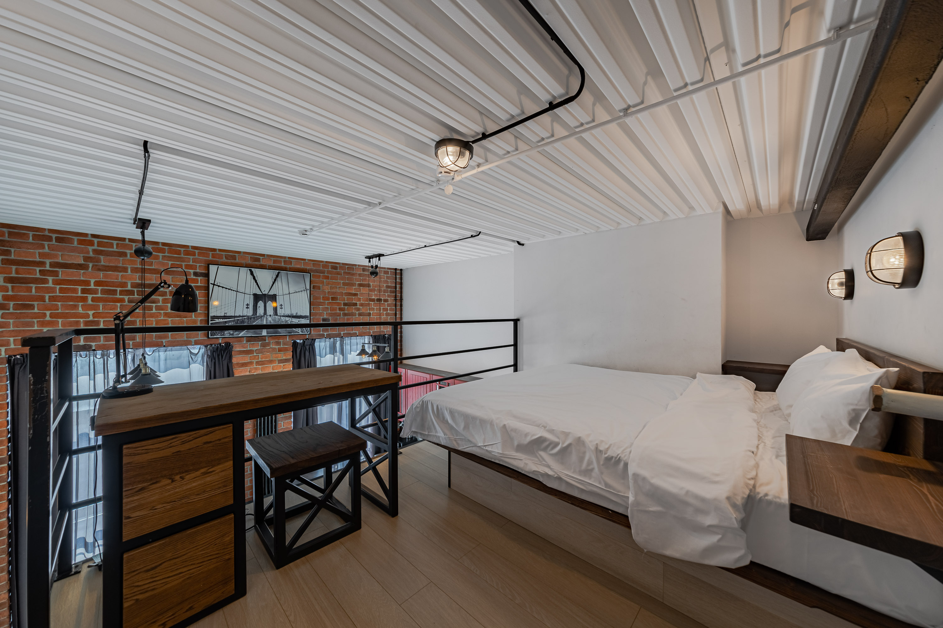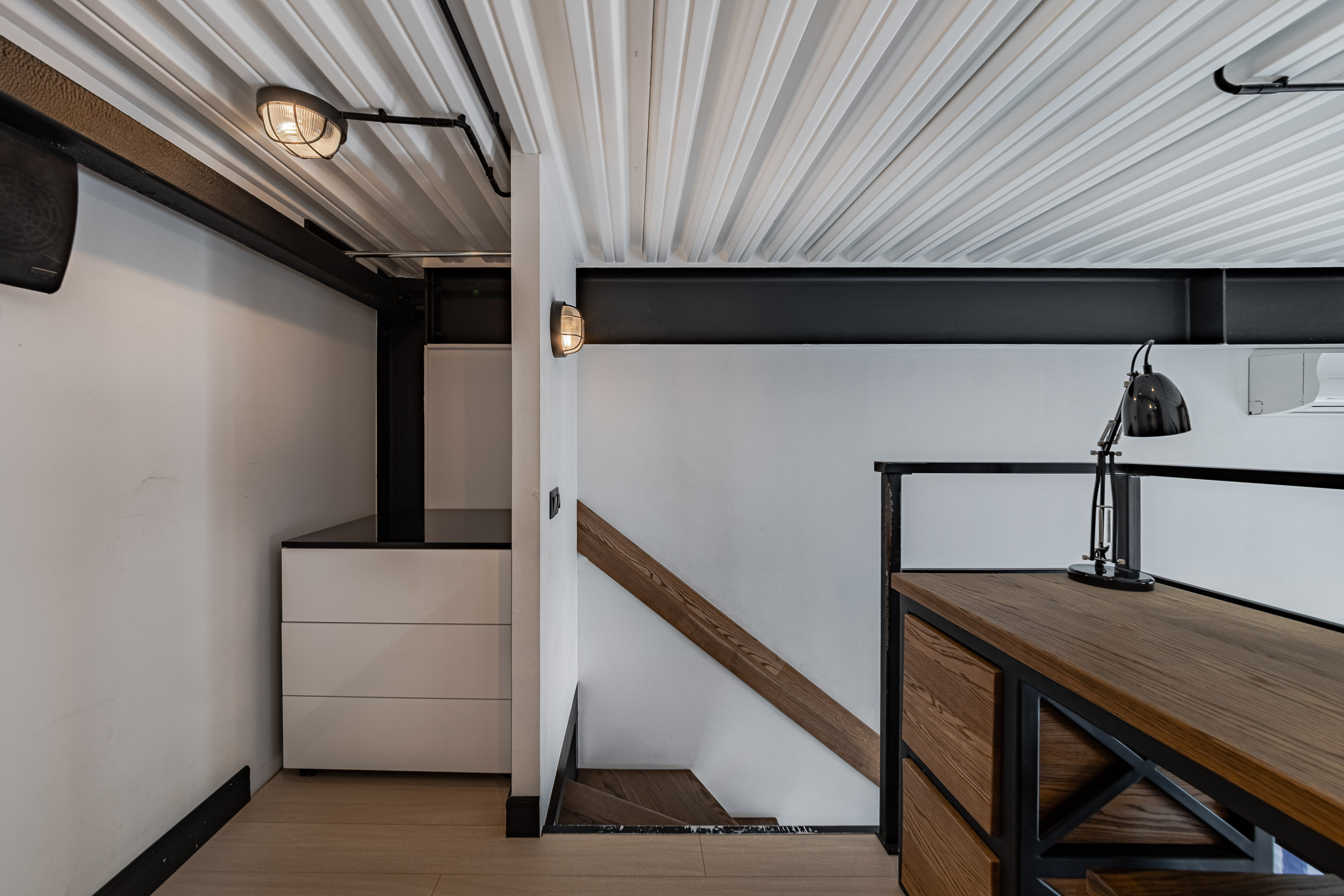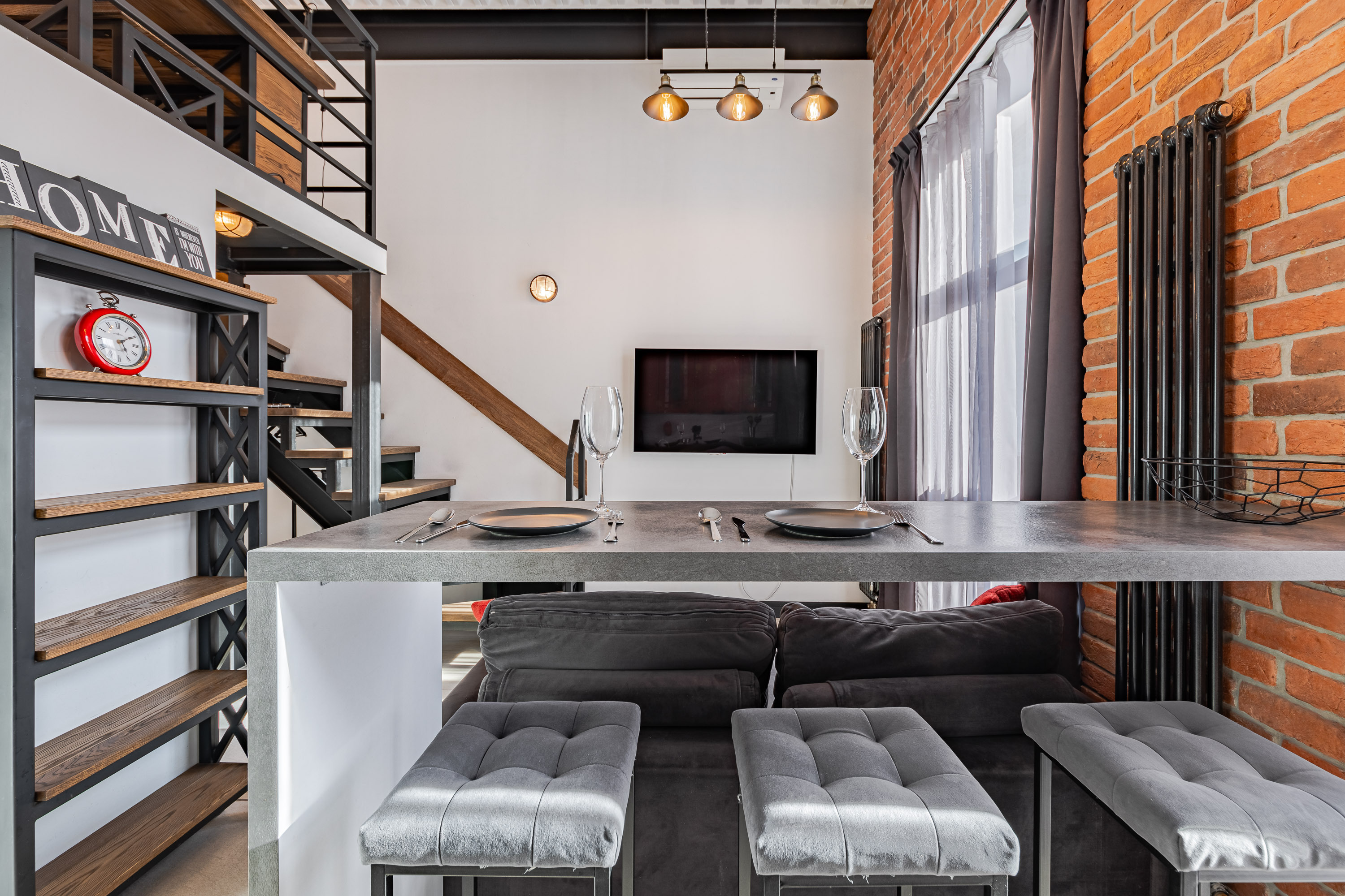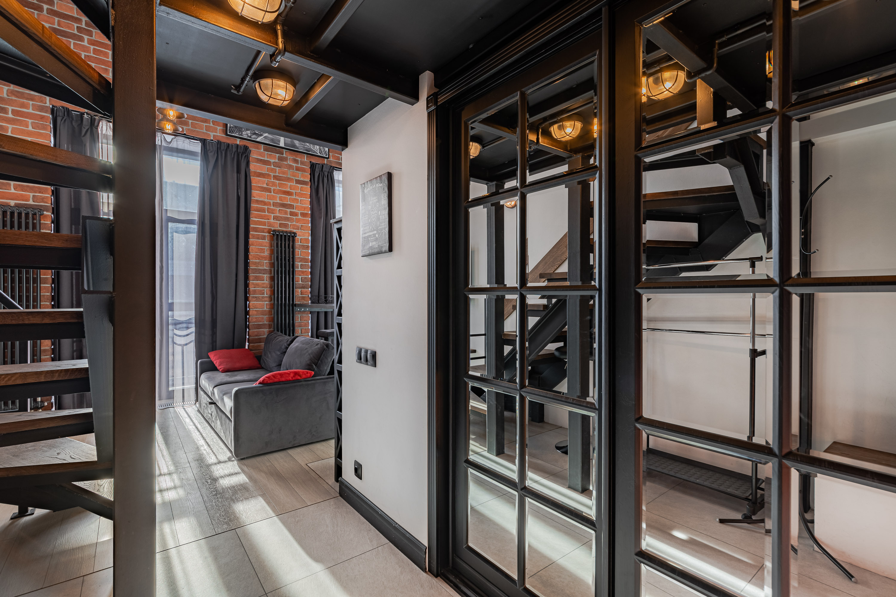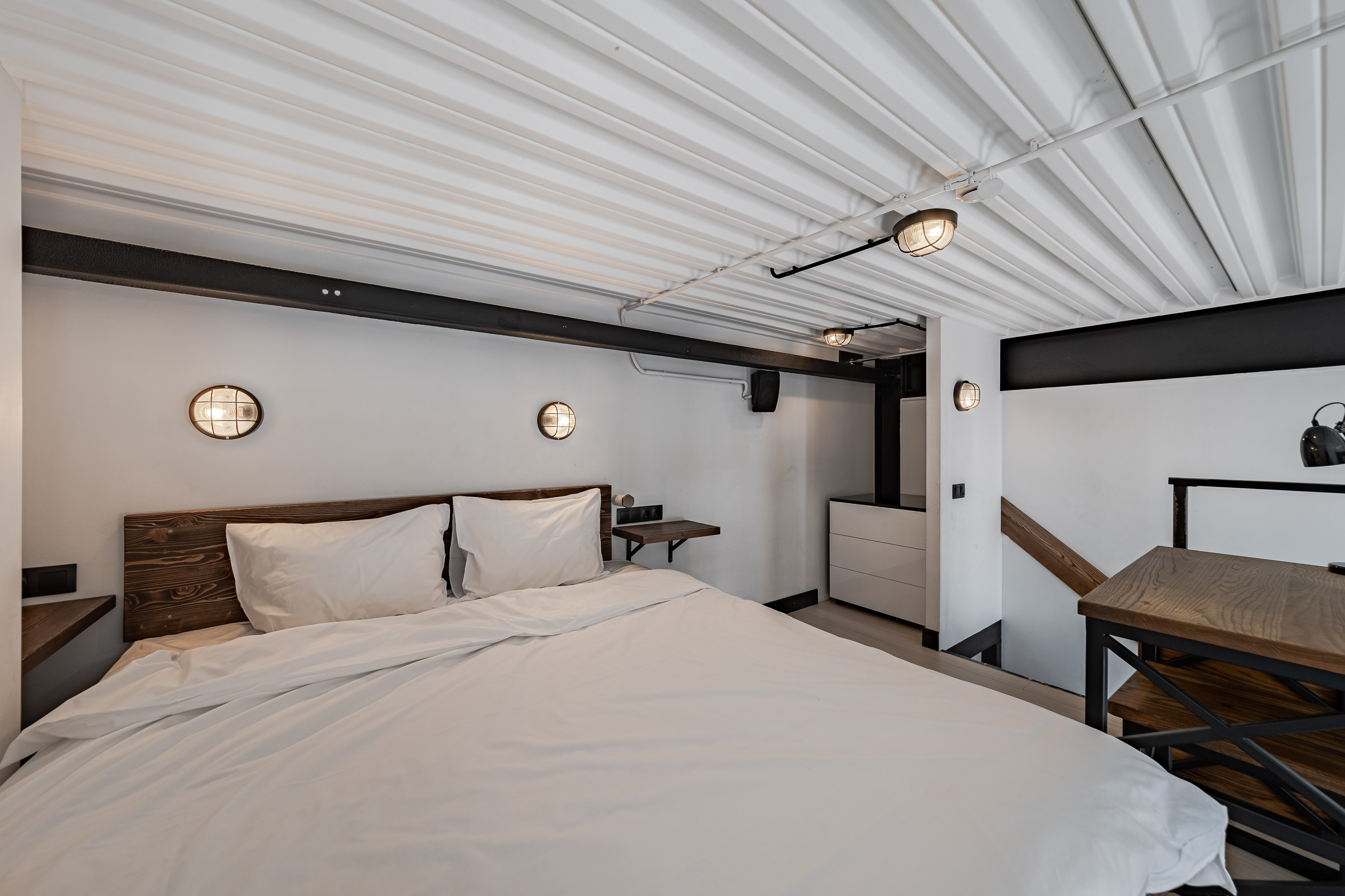 На первом уровне расположена кухня-гостиная с удобным диваном, который служит дополнительным спальным местом. Вы сможете не только пригласить друзей, но и приготовить им любимые блюда. Кухня полностью оснащена всем необходимым: плита, электрический чайник, холодильник и набор посуды для приготовления и приема пищи. На втором уровне расположена спальня с большой двухспальной кроватью, а также оборудованы гардеробная и рабочее место. Вы сможете не только отдохнуть, но и поработать, т.к. доступен скоростной интернет. Светлая ванная комната со стиральной машиной и просторным душевым отсеком находится на первом уровне лофта. Там вы найдете все необходимое для принятия душа: мыльные принадлежности и свежие полотенца.