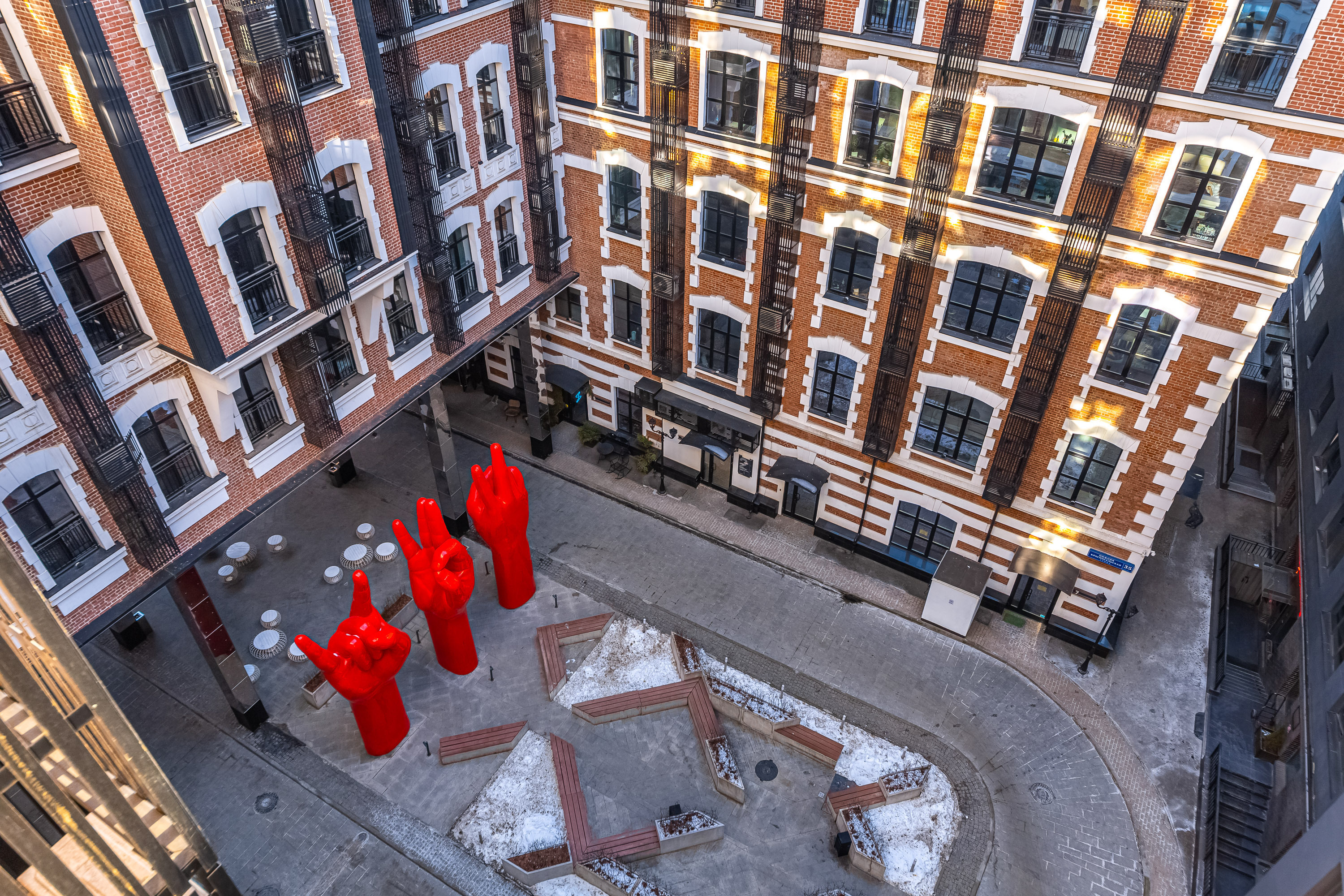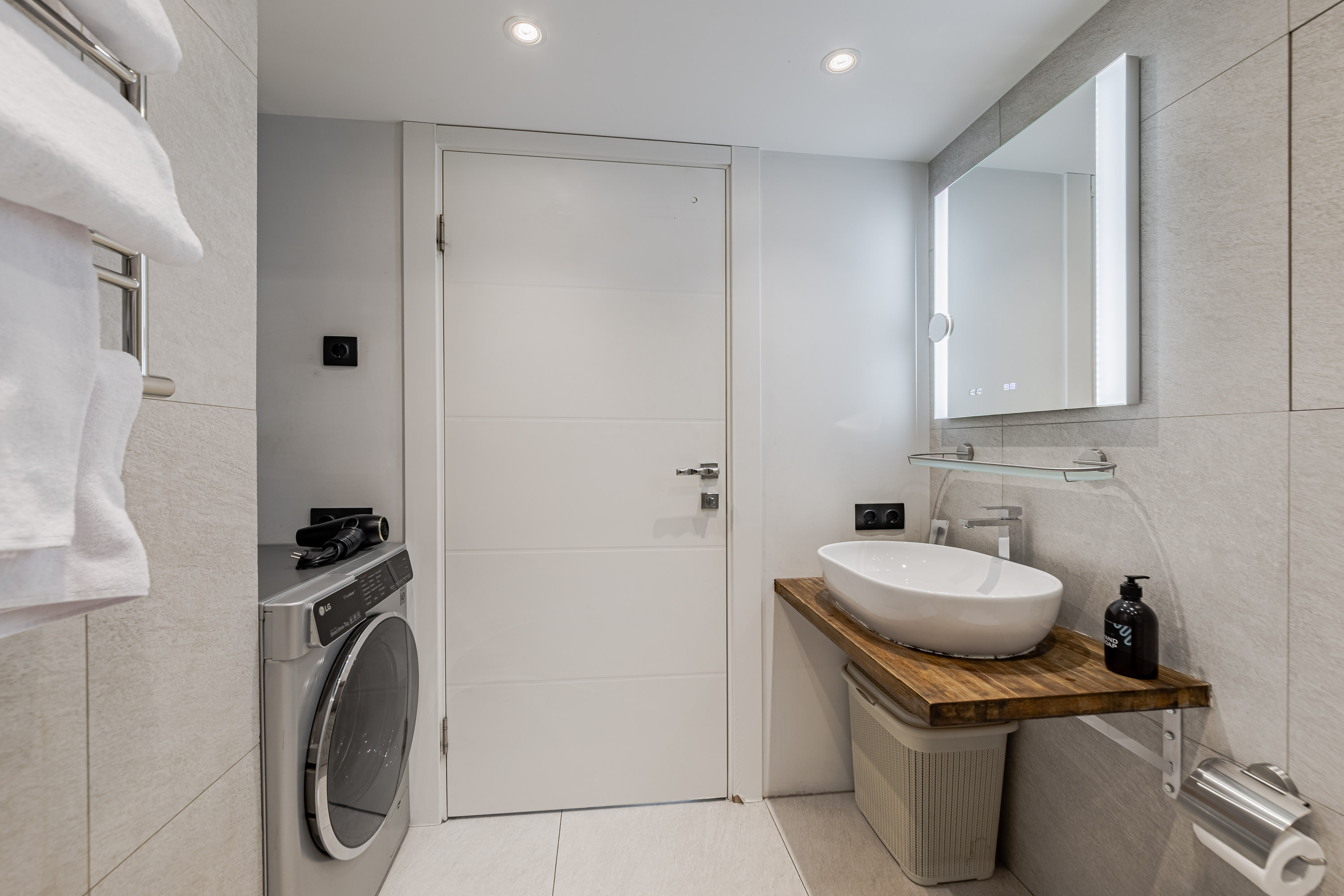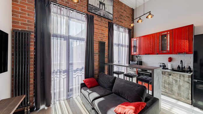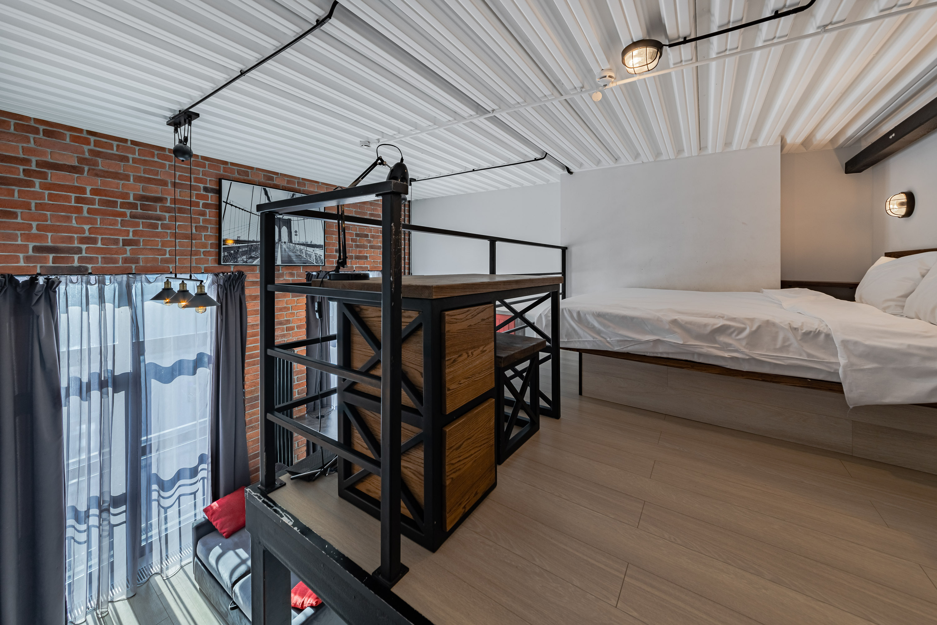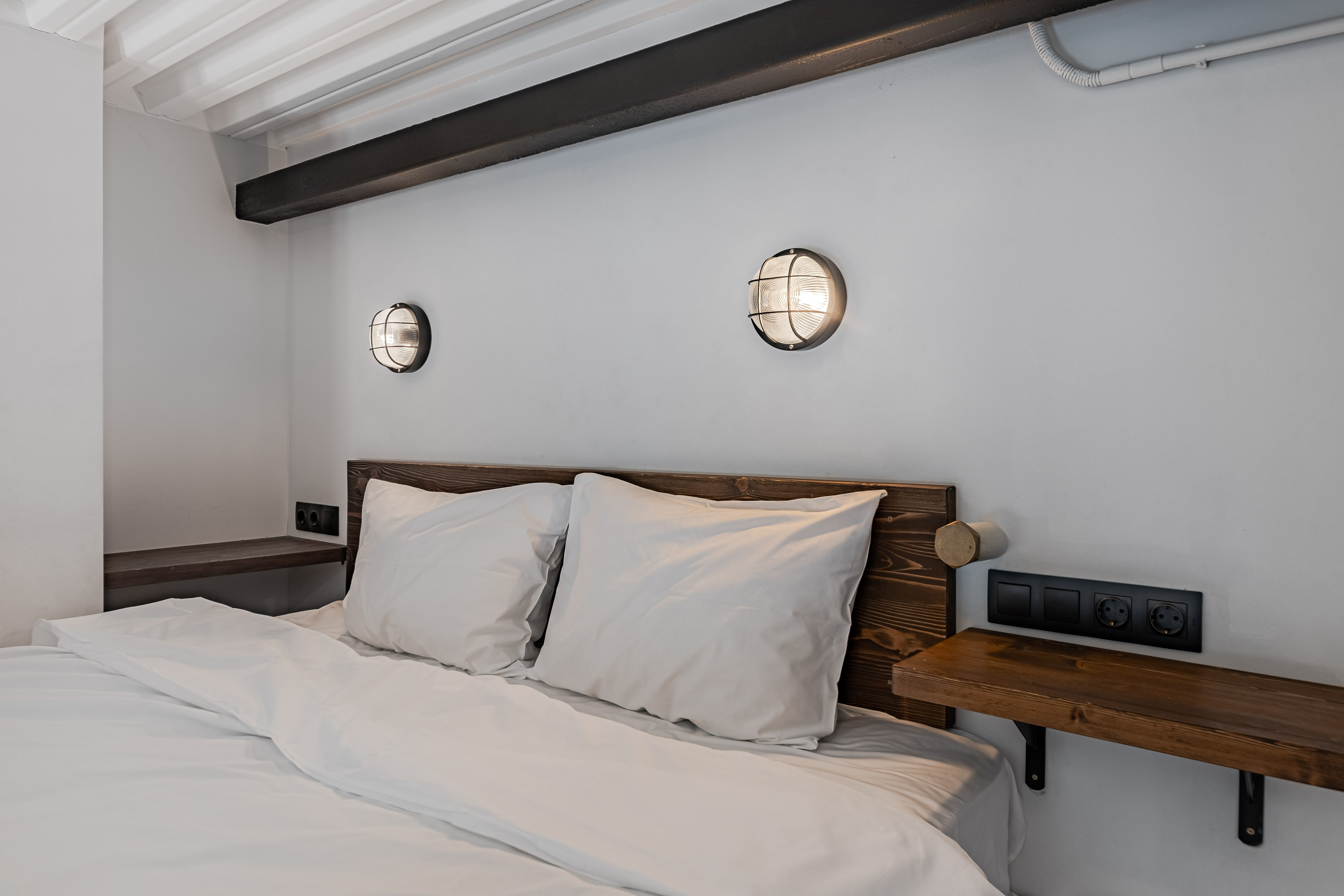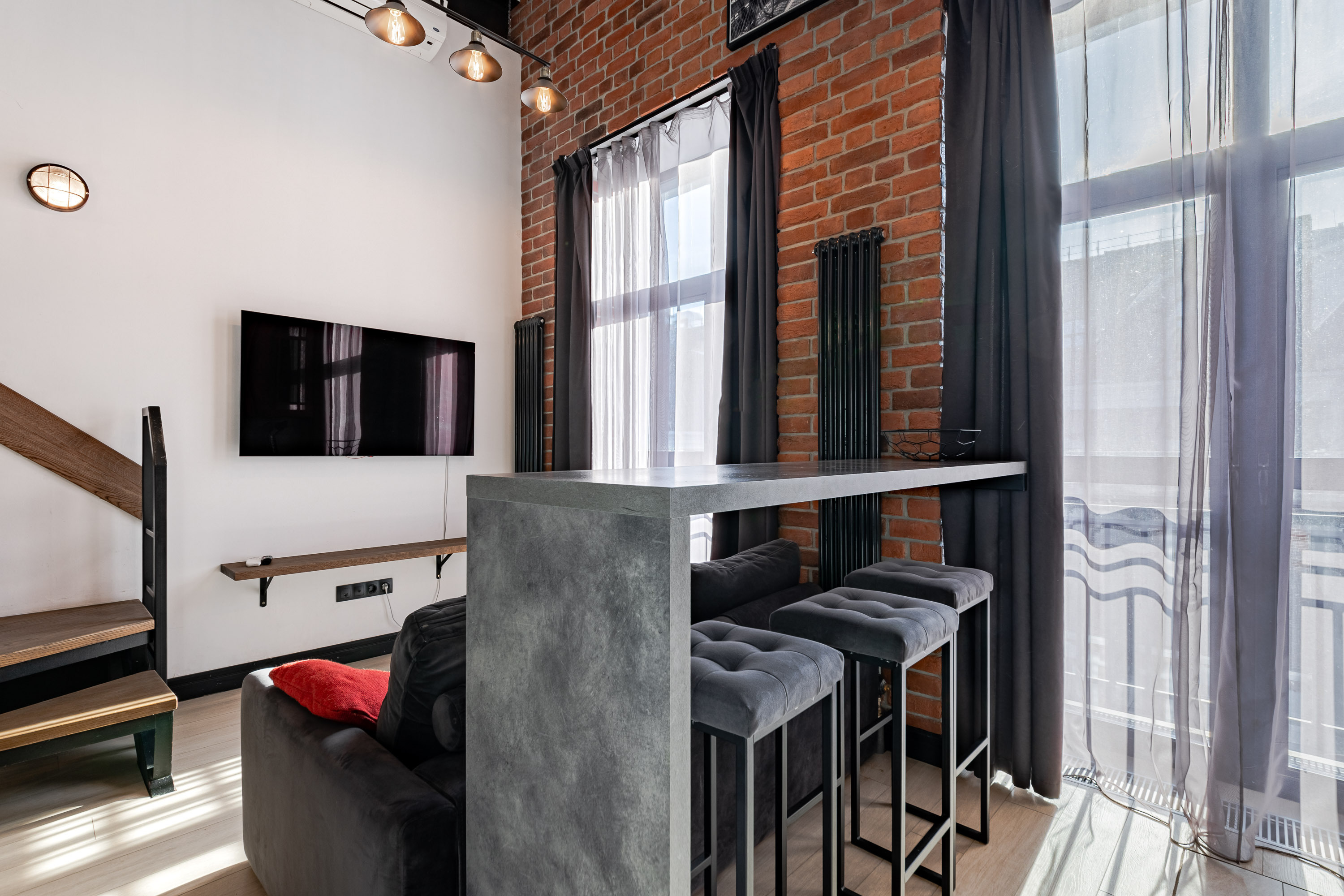 На первом уровне расположена кухня-гостиная с удобным диваном, который служит дополнительным спальным местом. Вы сможете не только пригласить друзей, но и приготовить им любимые блюда. Кухня полностью оснащена всем необходимым: плита, электрический чайник, холодильник и набор посуды для приготовления и приема пищи. На втором уровне расположена спальня с большой двухспальной кроватью, а также оборудованы гардеробная и рабочее место. Вы сможете не только отдохнуть, но и поработать, т.к. доступен скоростной интернет. Светлая ванная комната со стиральной машиной и просторным душевым отсеком находится на первом уровне лофта. Там вы найдете все необходимое для принятия душа: мыльные принадлежности и свежие полотенца.