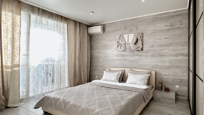 В спальне шикарная кровать с анатомическим матрасом и удобными подушками вкупе со шторами формата ВlасkОUТ - позволит Вам отлично выспаться. Размеры кровати 180*200.