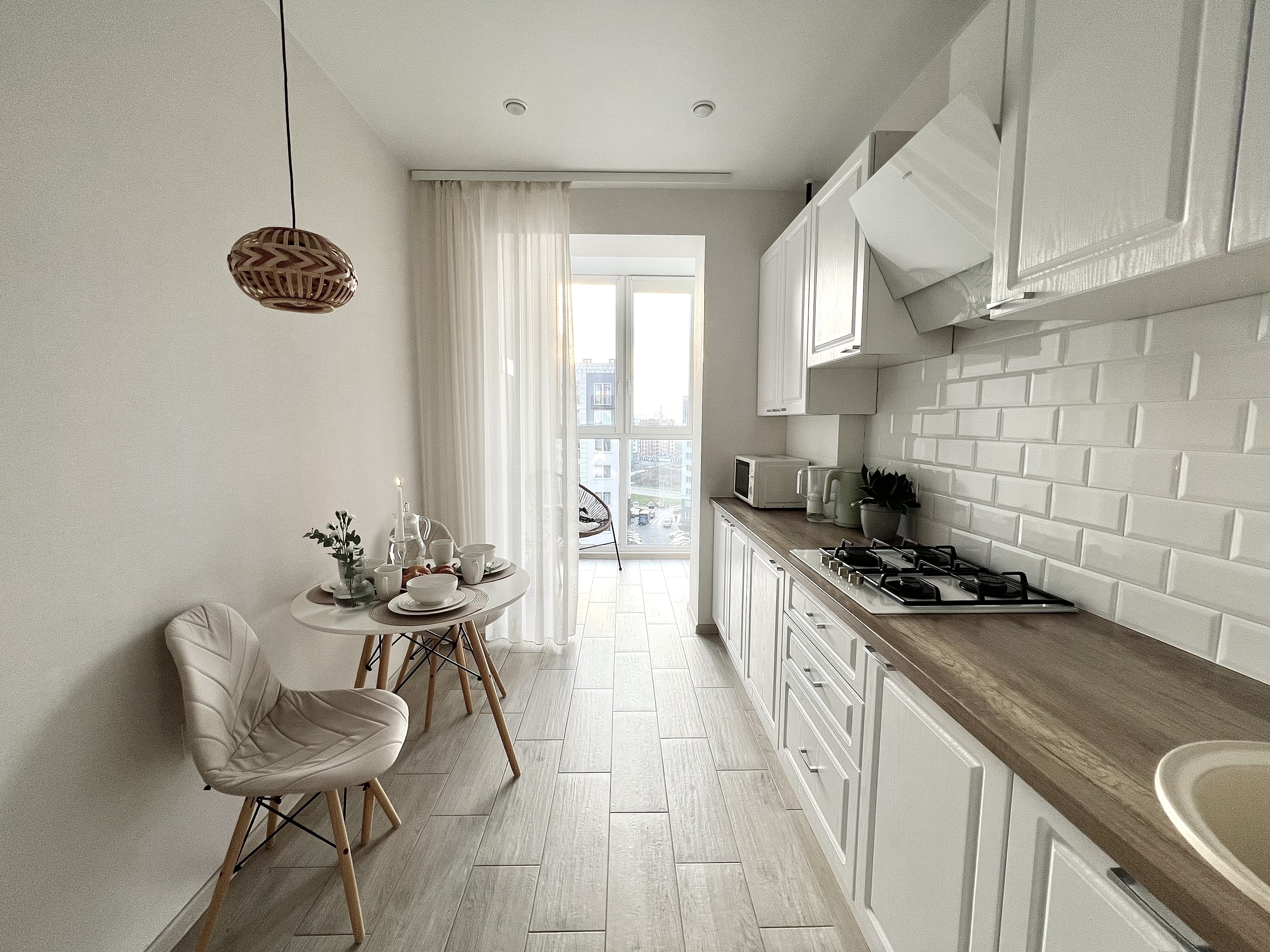 На просторной кухне есть вся необходимая посуда.