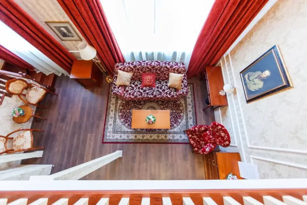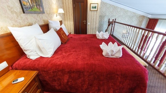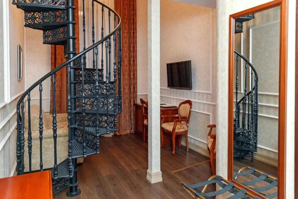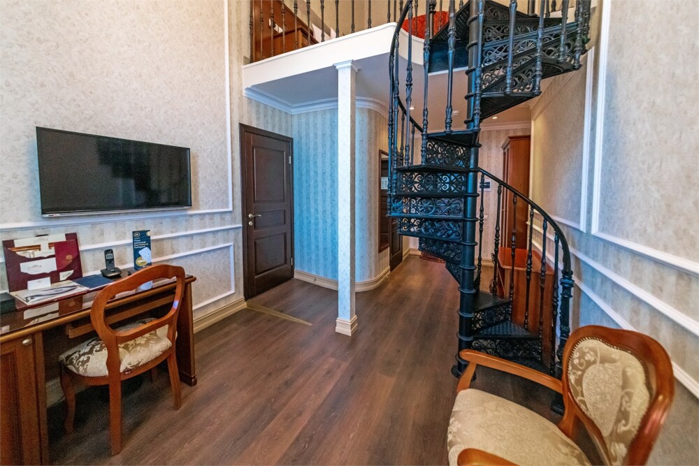 Уникальный номер с небольшой рабочей зоной на первом уровне и спальней на втором. Переход между уровнями осуществляется по винтовой лестнице.
