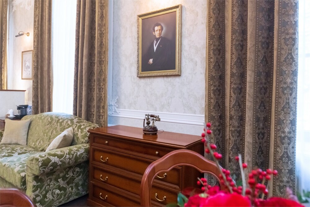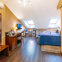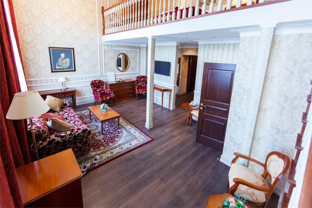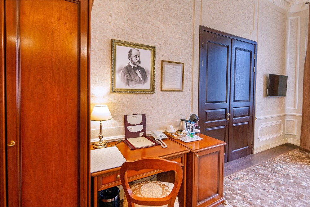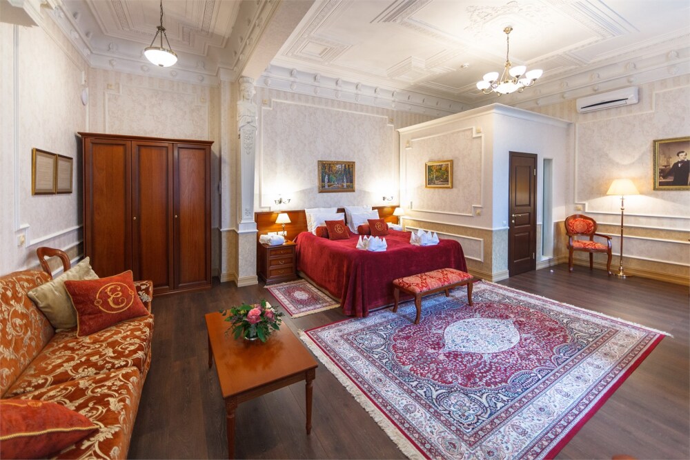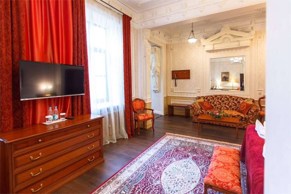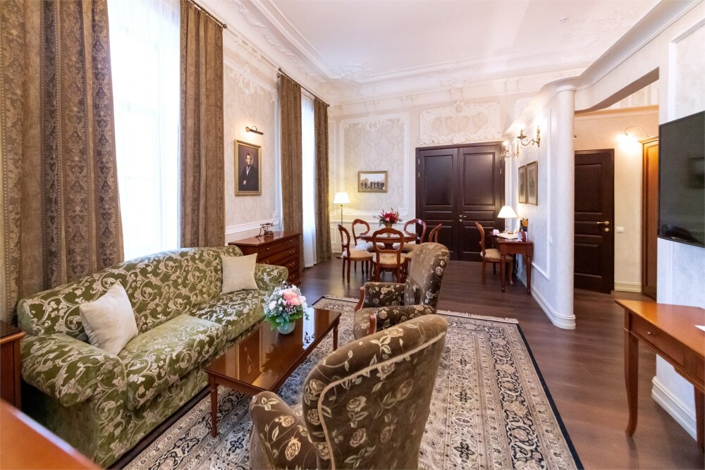 Роскошный номер люкс с видом на Миллионную улицу. Украшенный лепниной потолок, изысканный интерьер воссоздает атмосферу аристократических салонов старого Петербурга. Зонирование люкса обеспечивает максимальный комфорт и удобство для отдыха и досуга. Гостиная с мягким диваном, креслами и журнальным столиком, спальня с кроватью размера King Size (280х225), прихожая и просторная ванная комната.