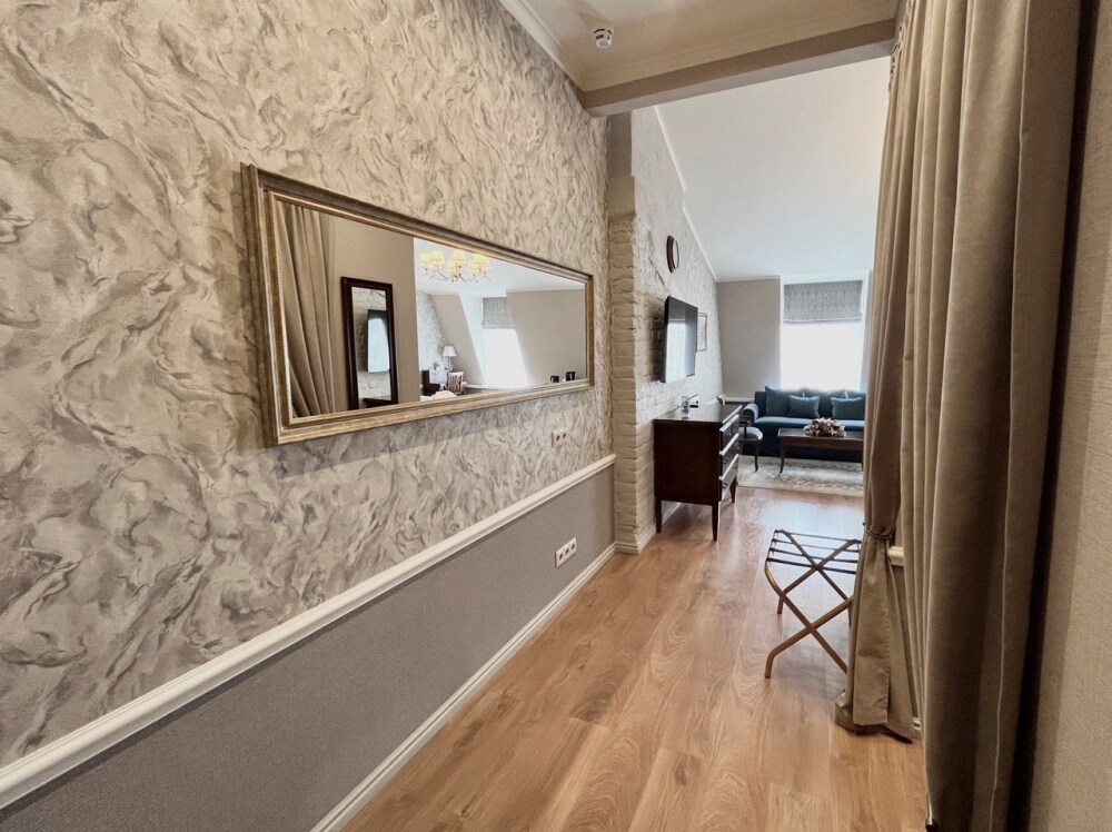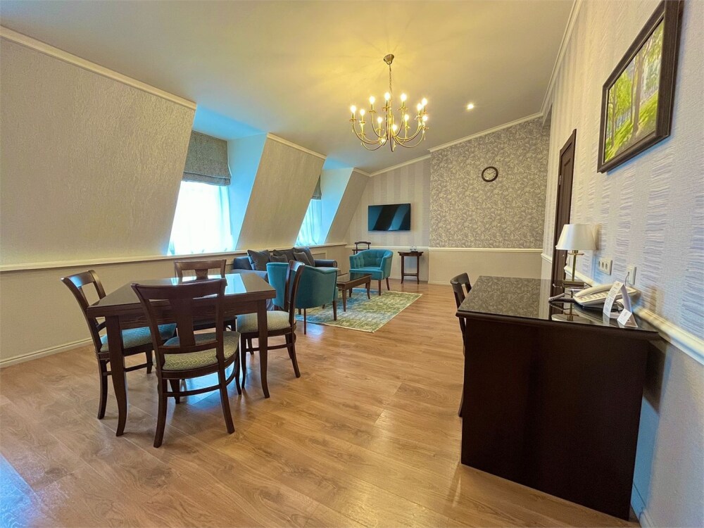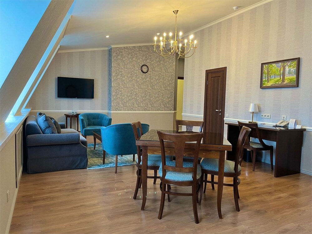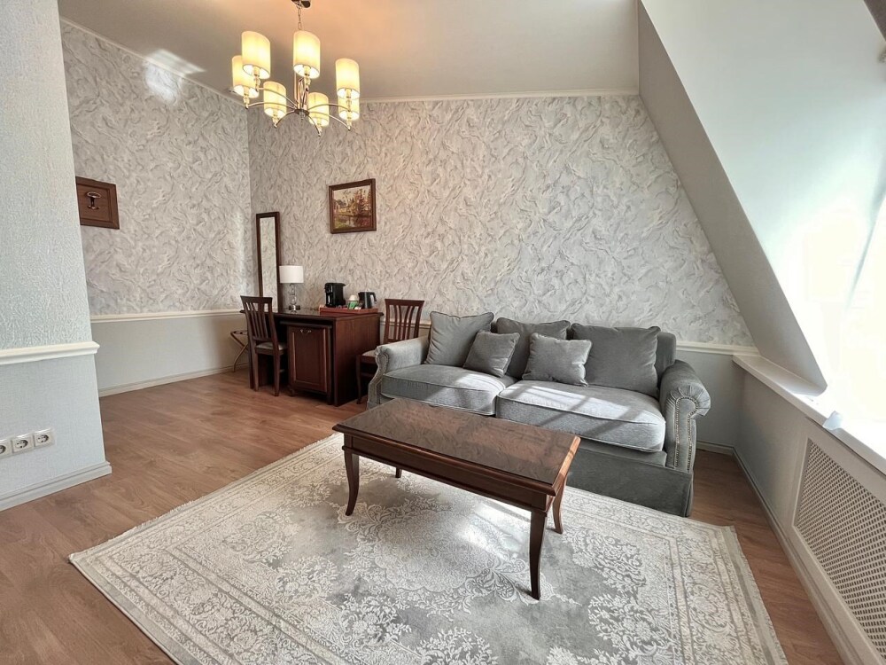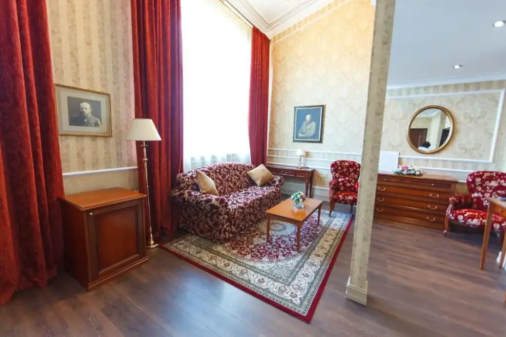 Роскошный номер люкс с видом на Миллионную улицу. Украшенный лепниной потолок, изысканный интерьер воссоздает атмосферу аристократических салонов старого Петербурга. Зонирование люкса обеспечивает максимальный комфорт и удобство для отдыха и досуга. Гостиная с мягким диваном, креслами и журнальным столиком, спальня с кроватью размера King Size (280х225), прихожая и просторная ванная комната.