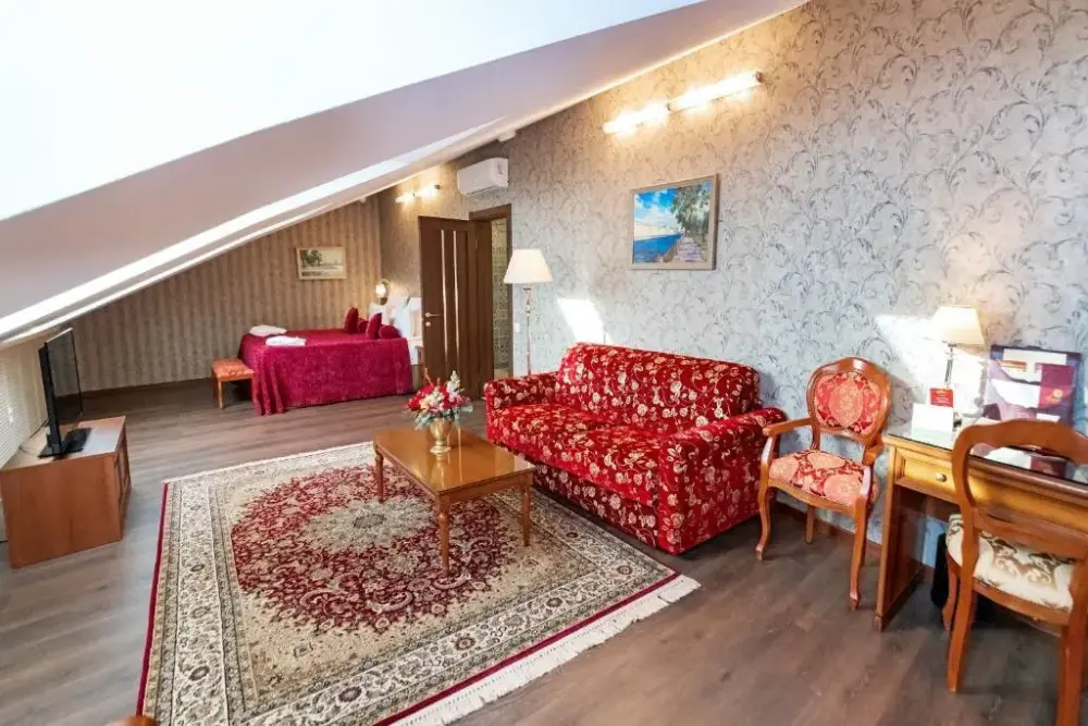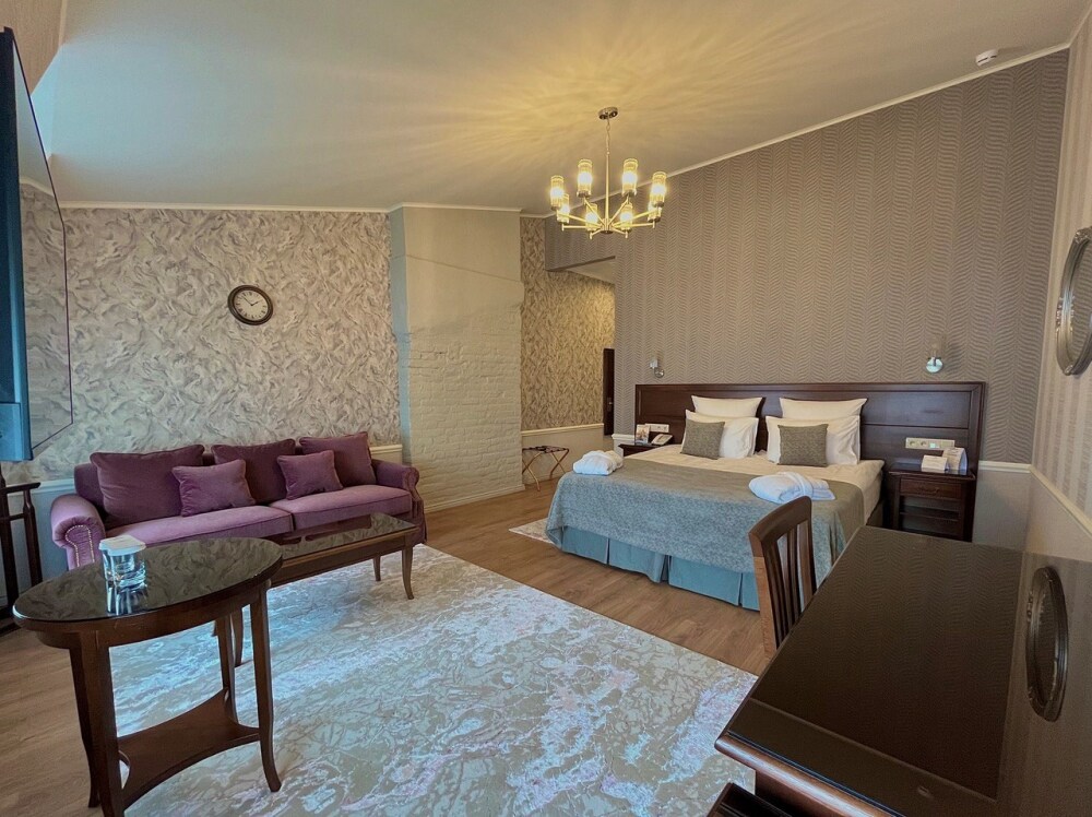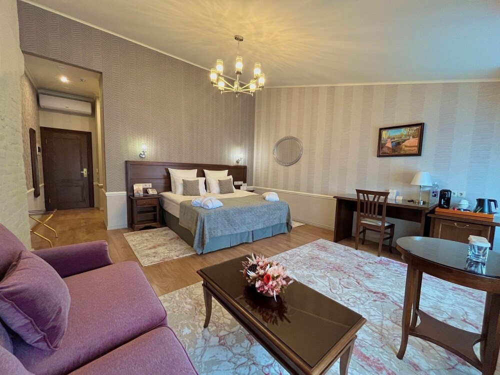 В номере установлена кровать King Size (180*200) и полутороспальный диван (150*200). В номере есть рабочая зона с удобным письменным столом и небольшой гостиной зоной.