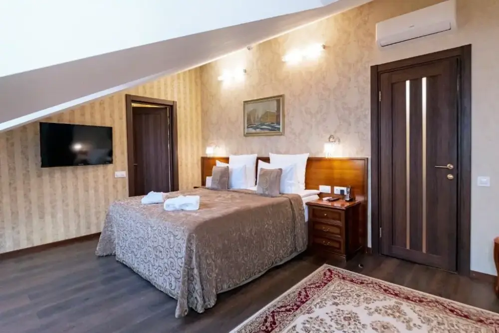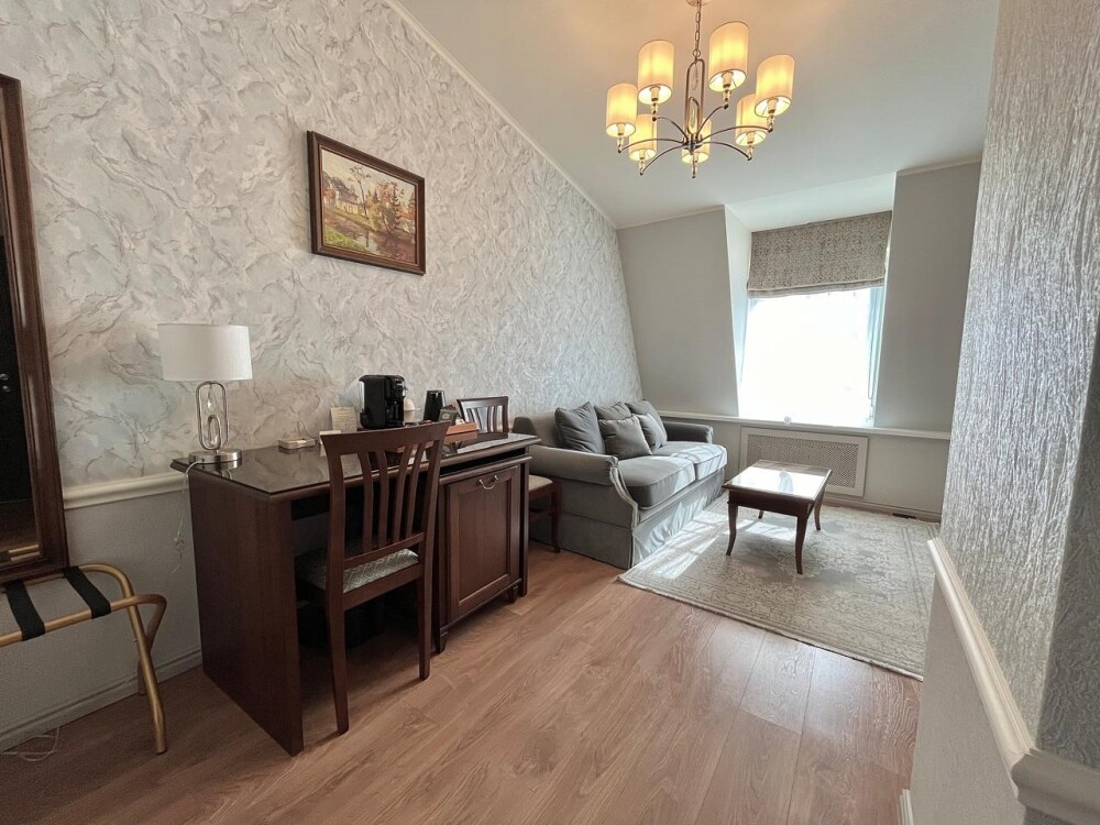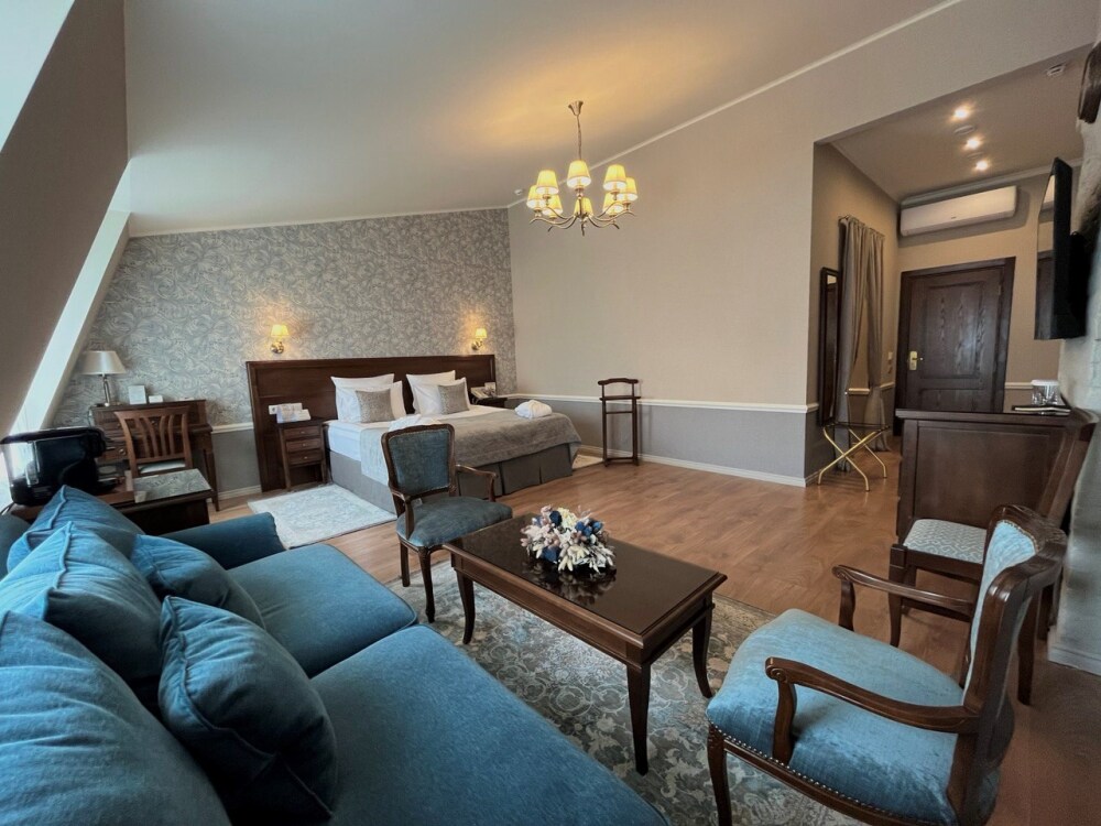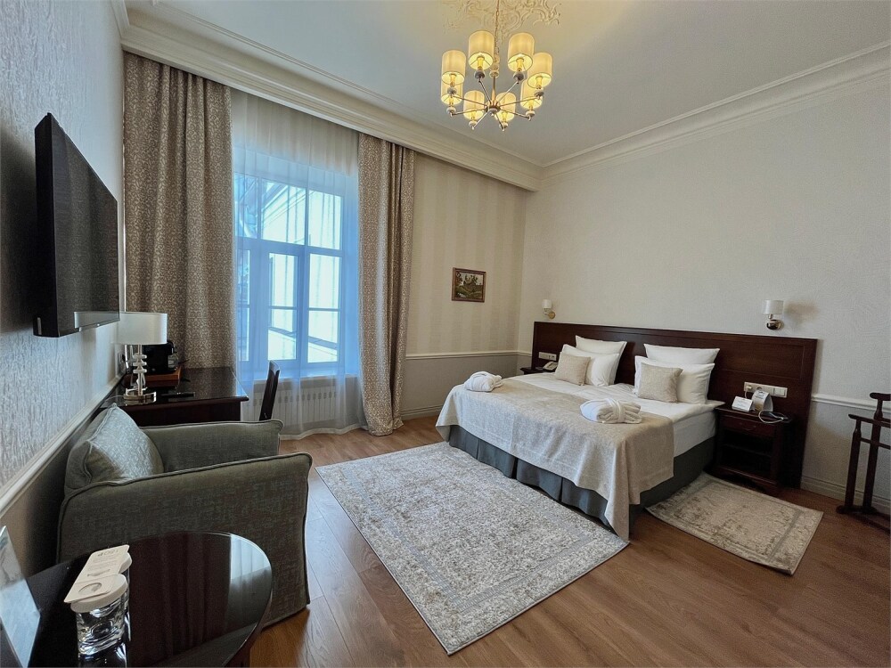 В каждом из номеров данной категории есть возможность сделать как одну большую двуспальную кровать King Size (180*200), так и две раздельные (90*200). В номере есть рабочая зона с удобным письменным столом и небольшой гостиный уголок со стульями и чайным столиком.