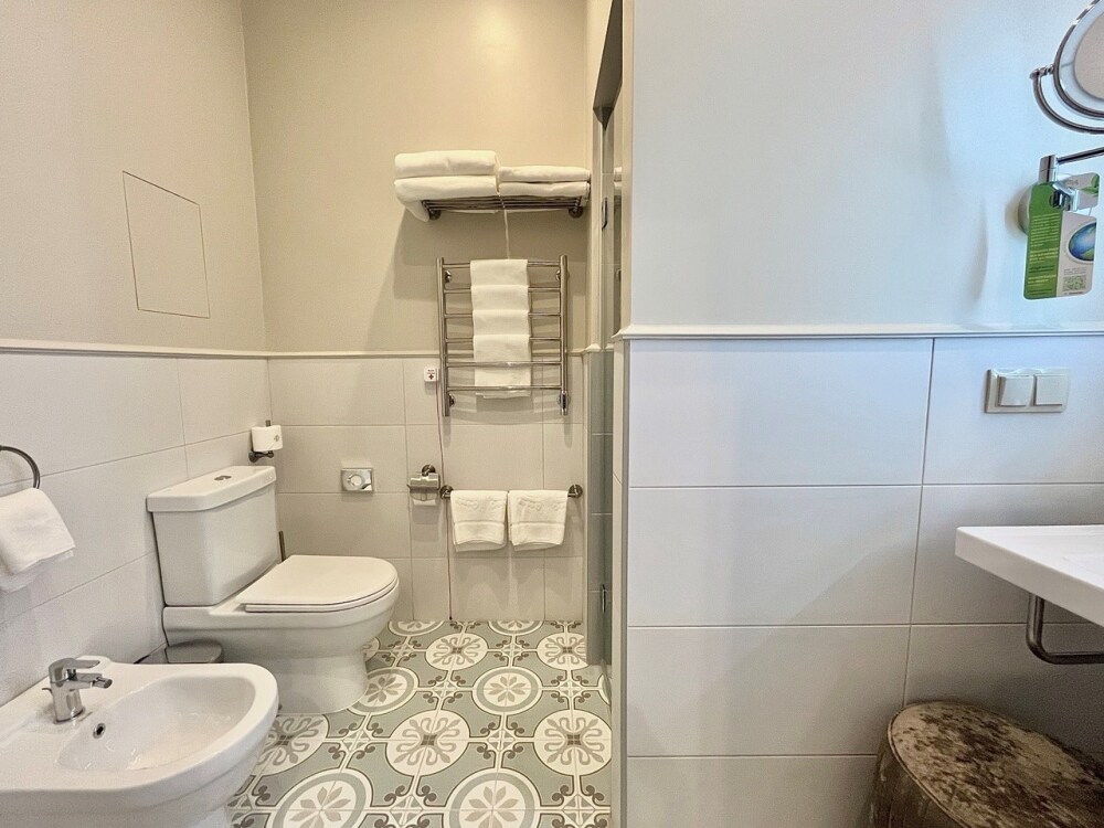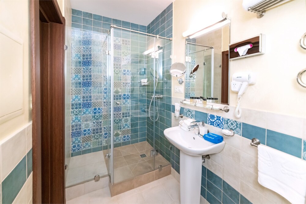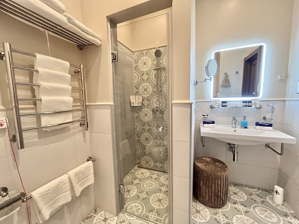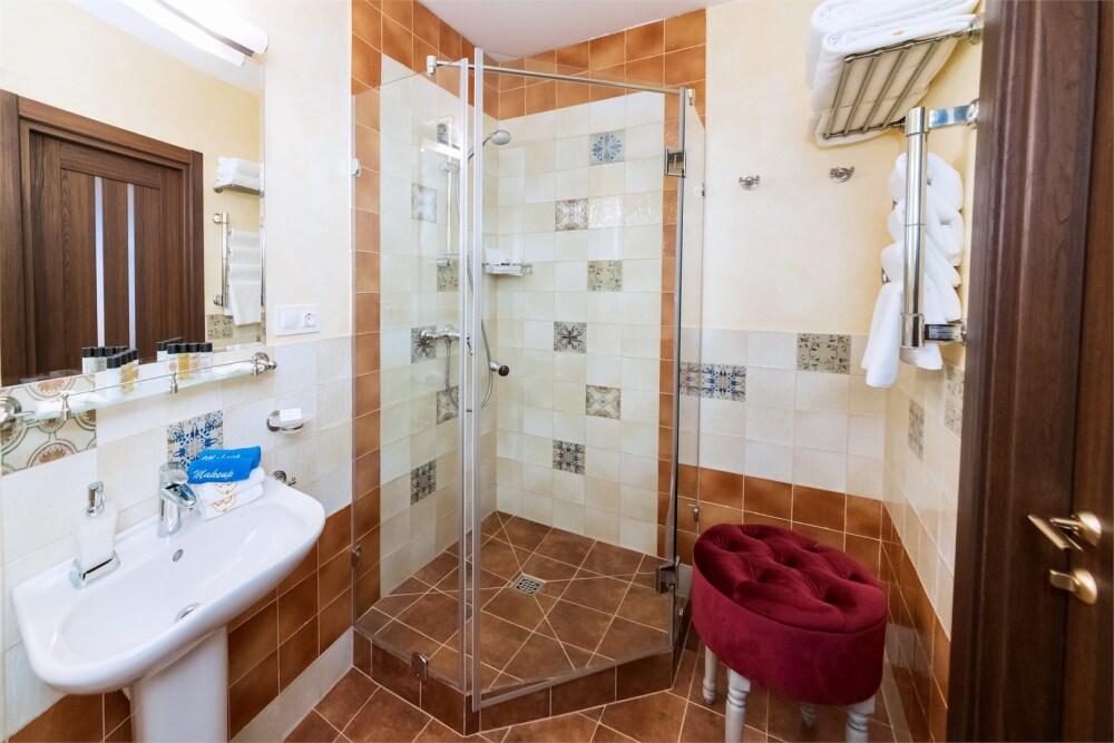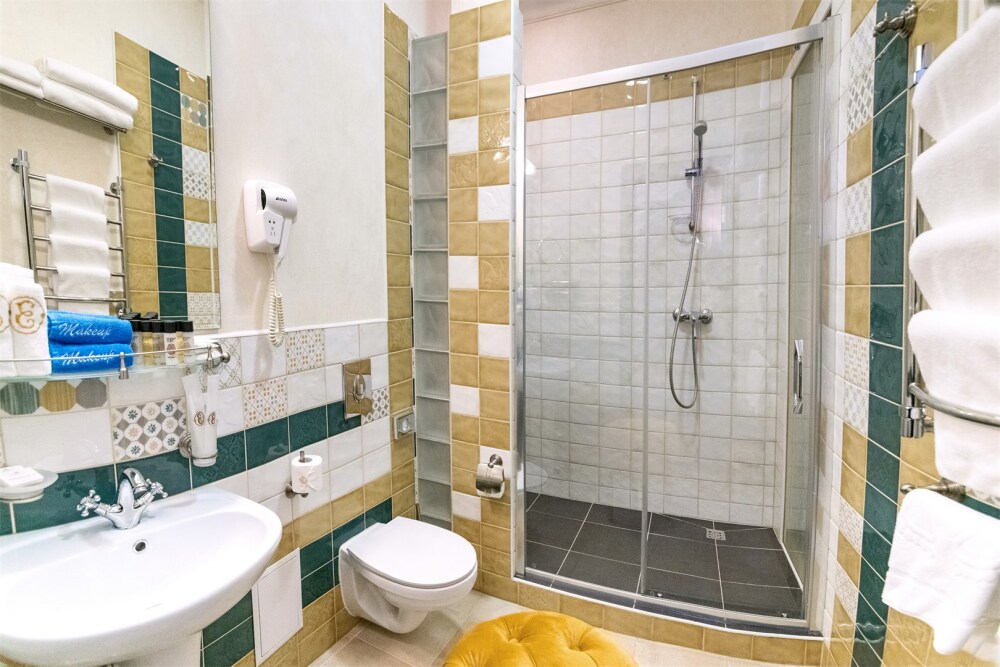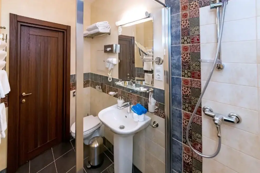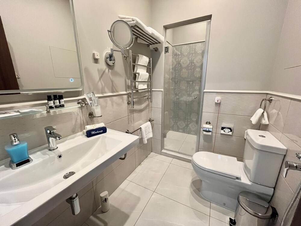 Ванная комната оснащена просторным душем. Гостям предоставляются наборы полотенец, махровые халаты, одноразовые тапочки, фен и косметические принадлежности.