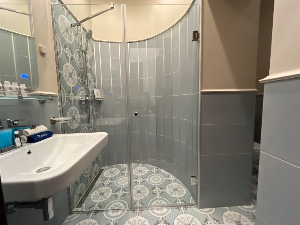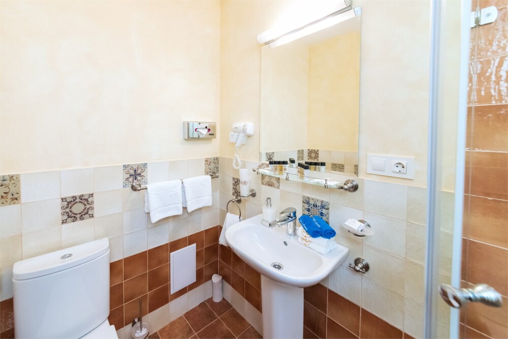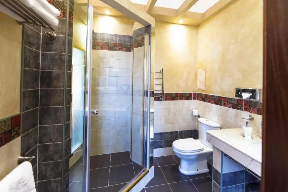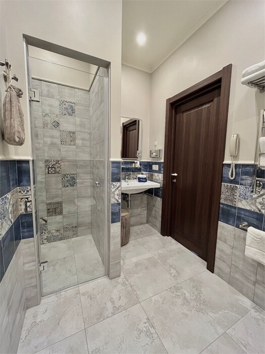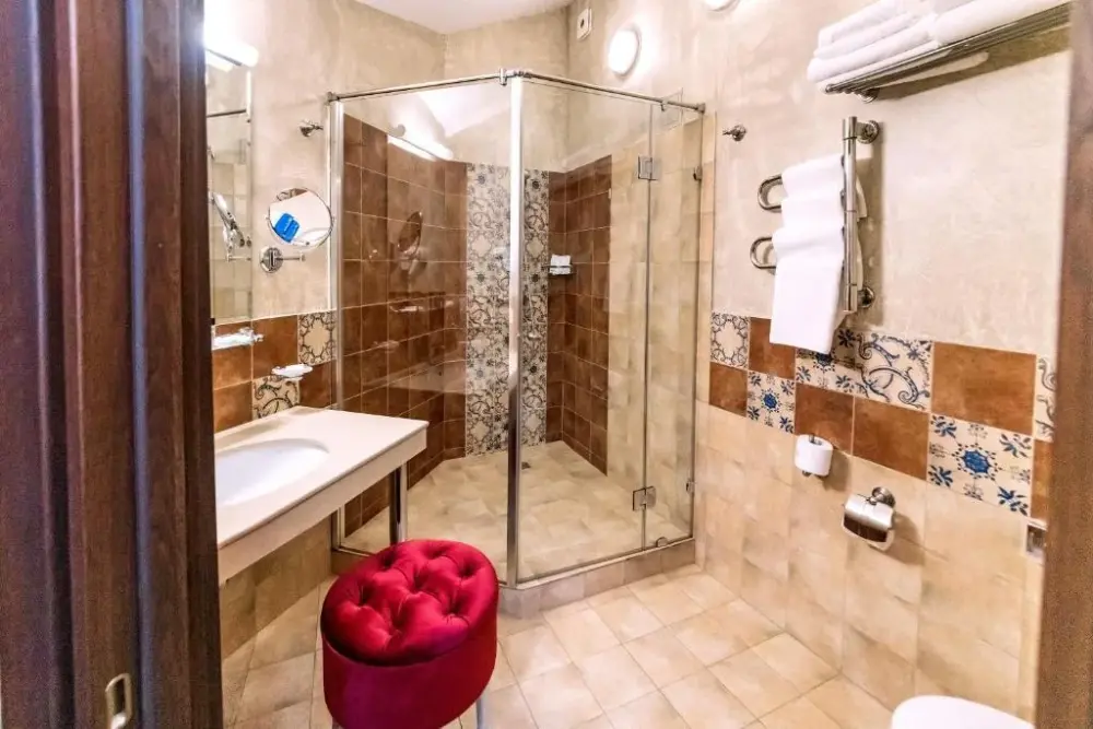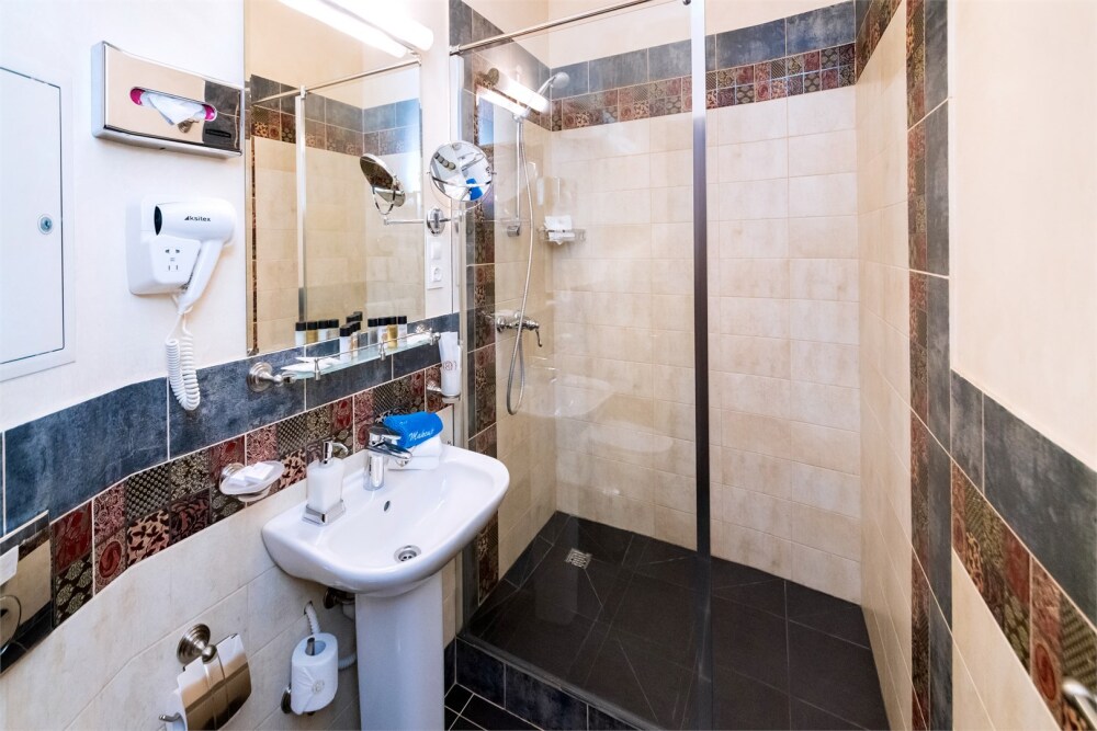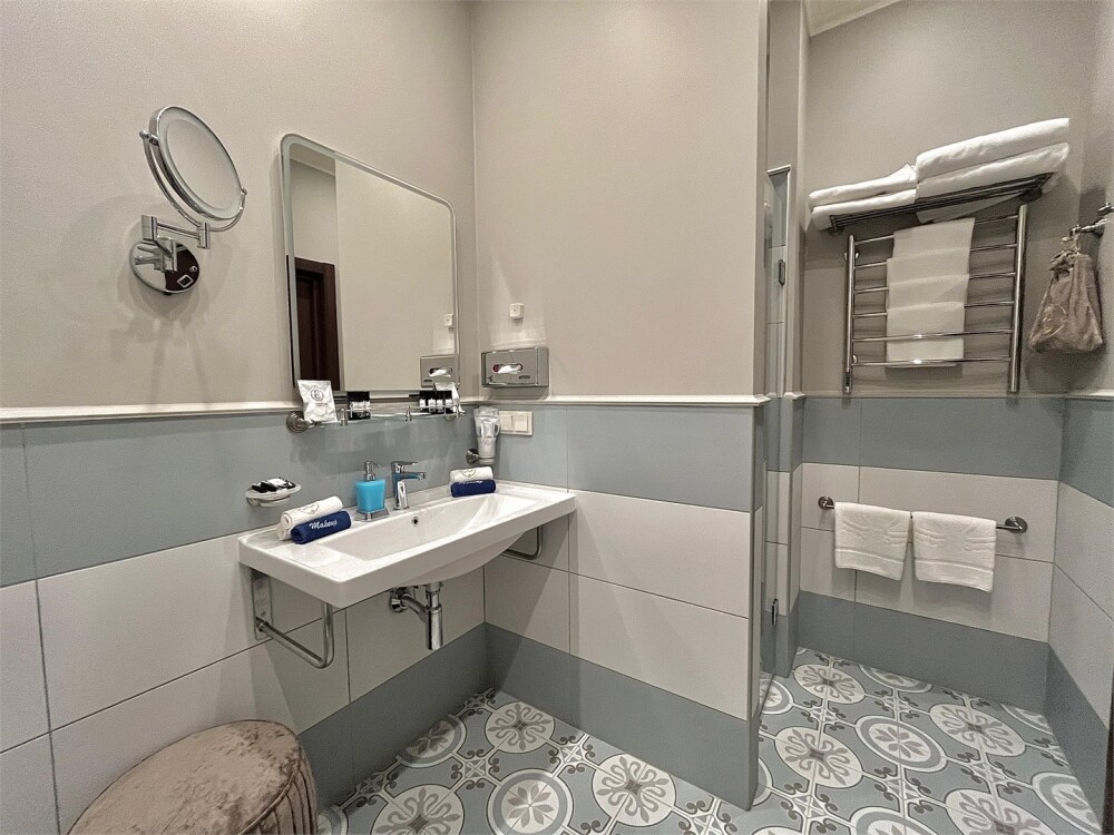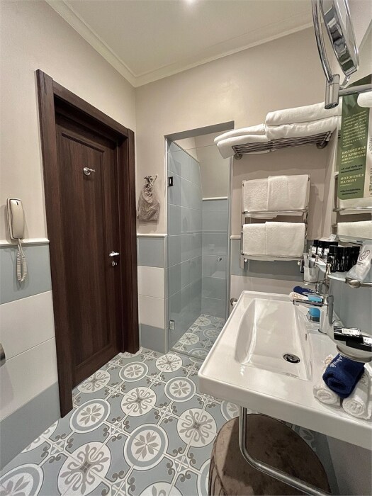 Ванная комната оснащена просторным душем. Гостям предоставляются наборы полотенец, махровые халаты, одноразовые тапочки, фен и косметические принадлежности.