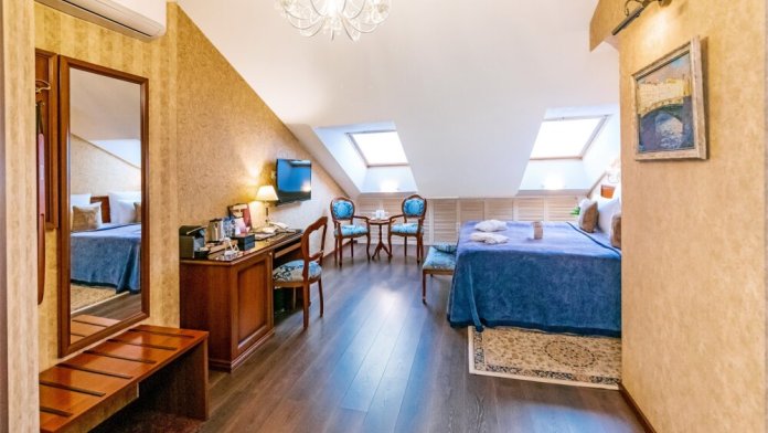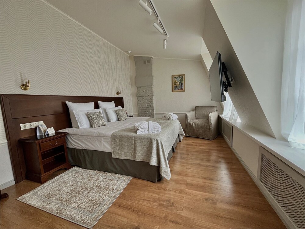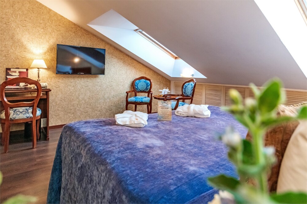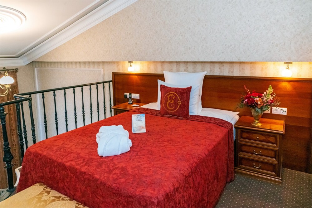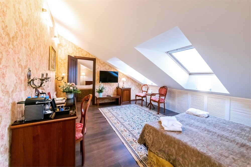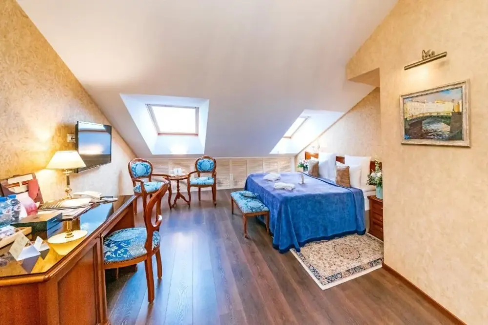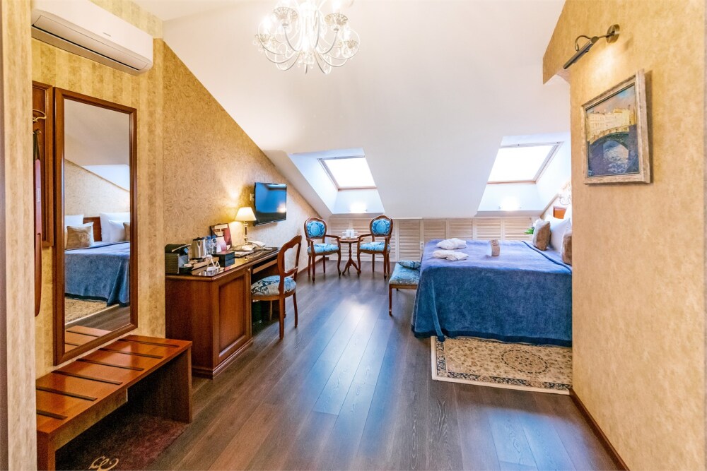 Для гостей, предпочитающих романтическую атмосферу Петербурга, идеально подойдёт номер данной категории с мансардными окнами.