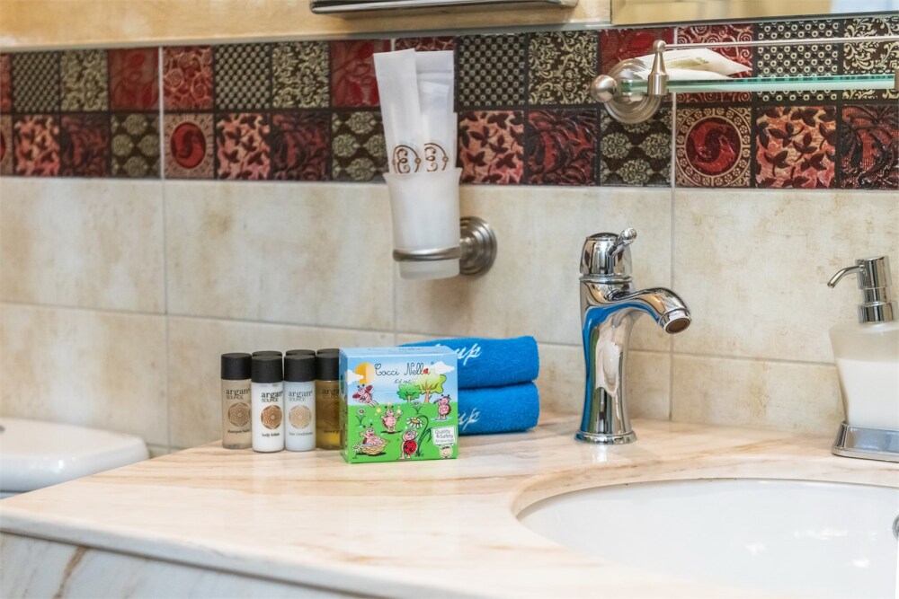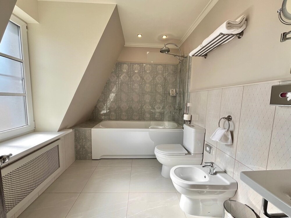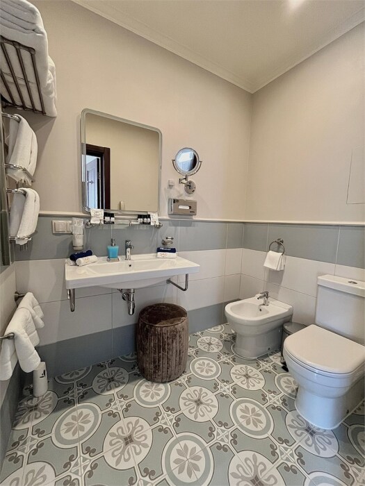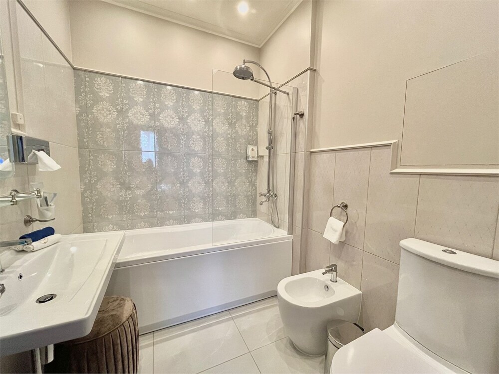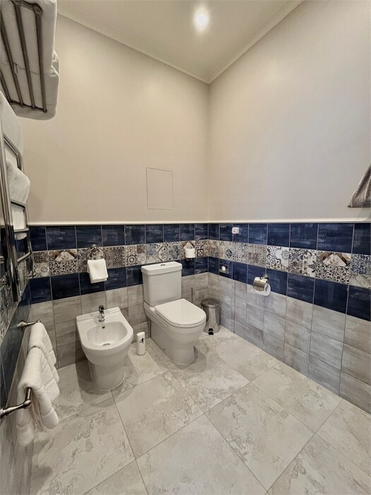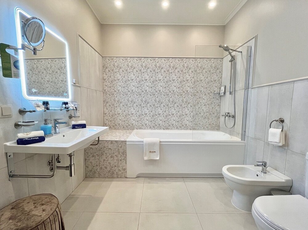 Ванная комната оснащена ванной и биде. Гостям предоставляются наборы полотенец, махровые халаты, одноразовые тапочки, фен и косметические принадлежности.