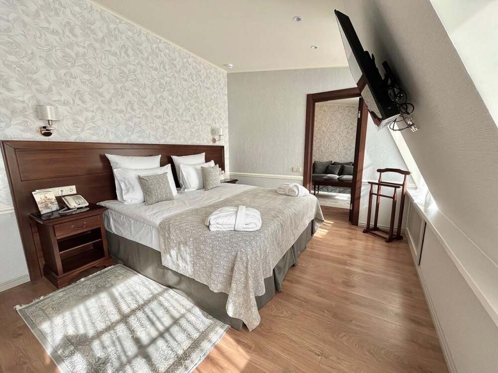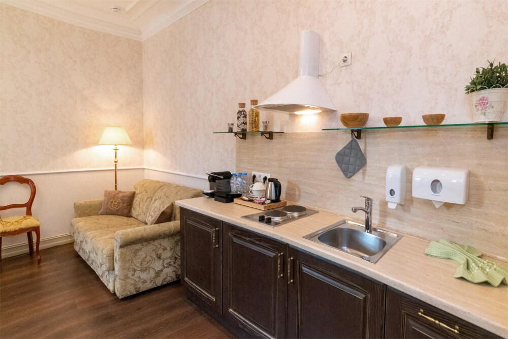 Номер состоит из двух комнат: спальня с одной большой двуспальной кроватью King-size и небольшой гардеробной, гостиная с комфортным диваном и мини-кухней.