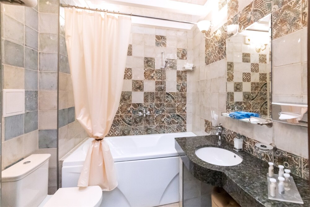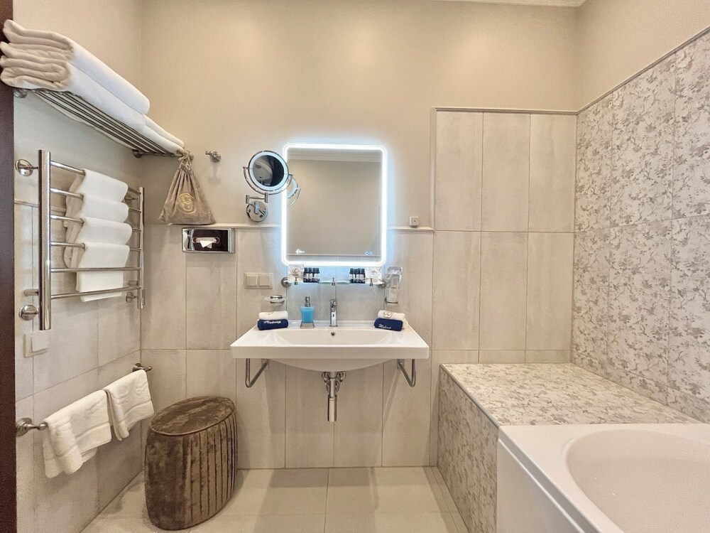 Ванная комната оснащена ванной. Гостям предоставляются наборы полотенец, махровые халаты, одноразовые тапочки, фен и косметические принадлежности.