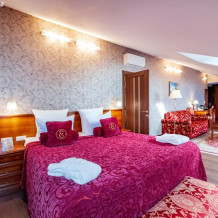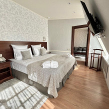 В каждом из номеров данной категории есть возможность сделать как одну большую двуспальную кровать King Size (180*200), так и две раздельные (90*200). В номере есть полутороспальный диван и рабочая зона с удобным письменным столом.