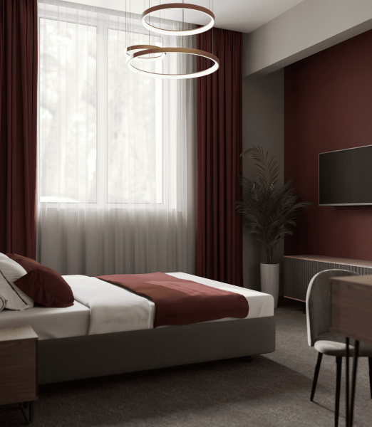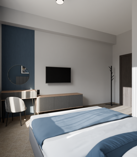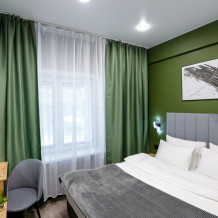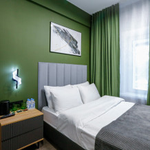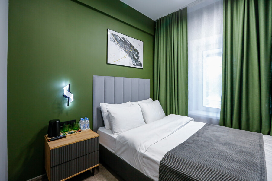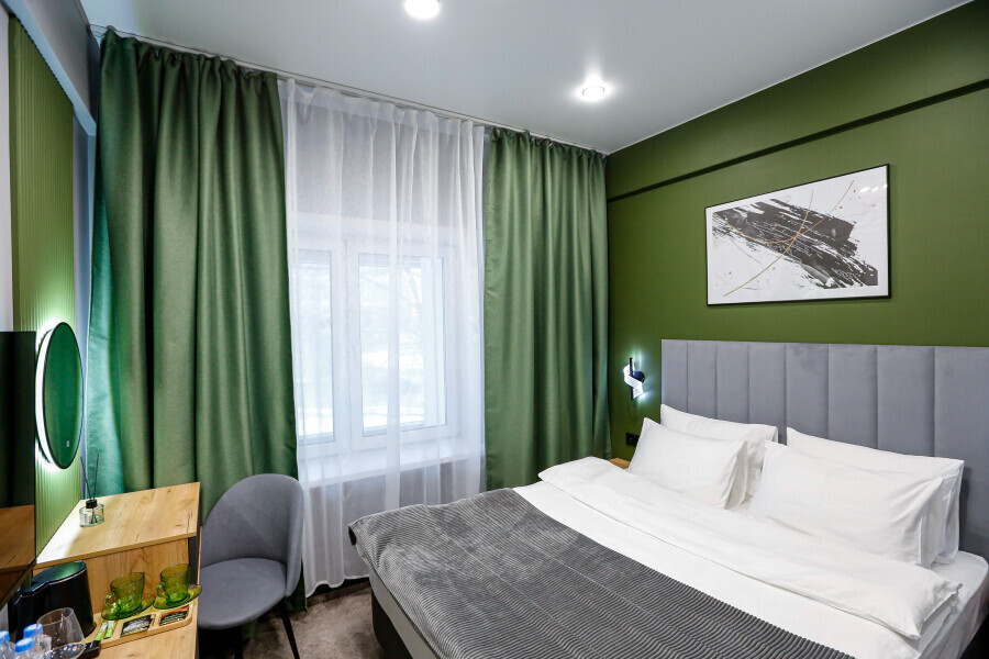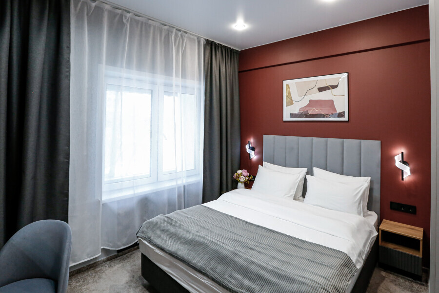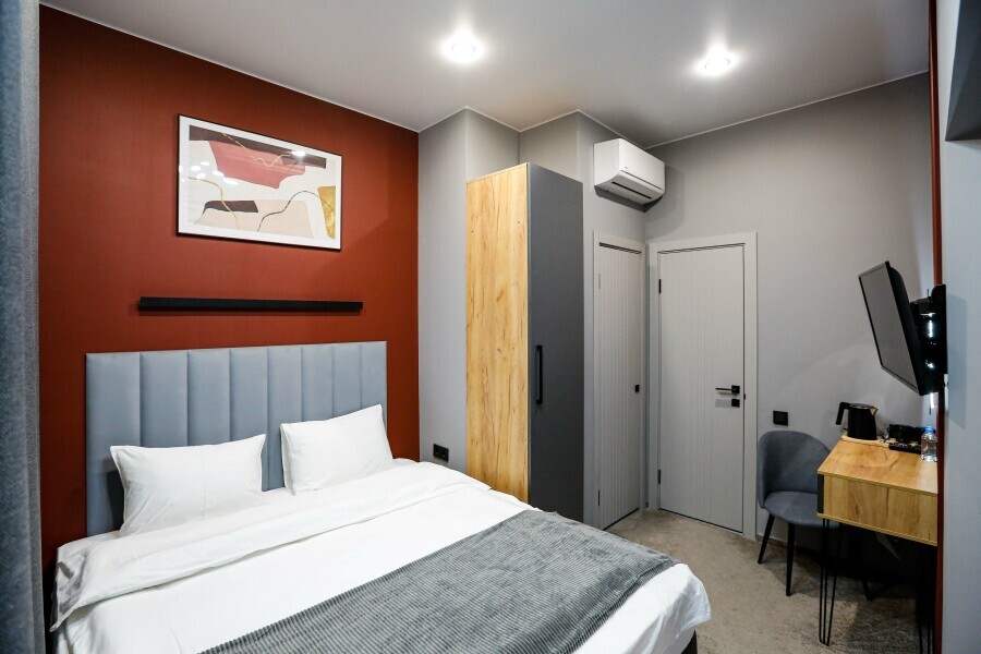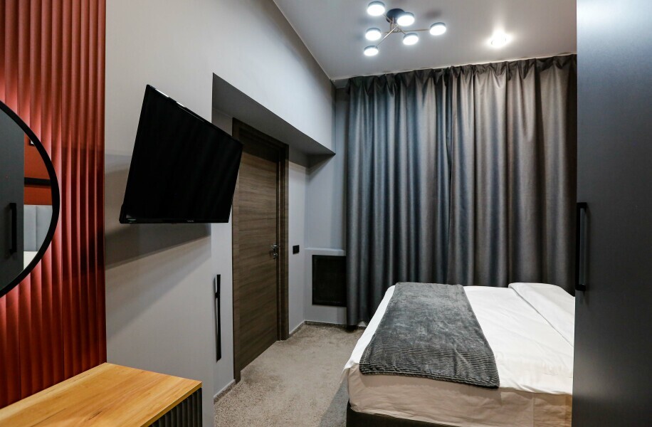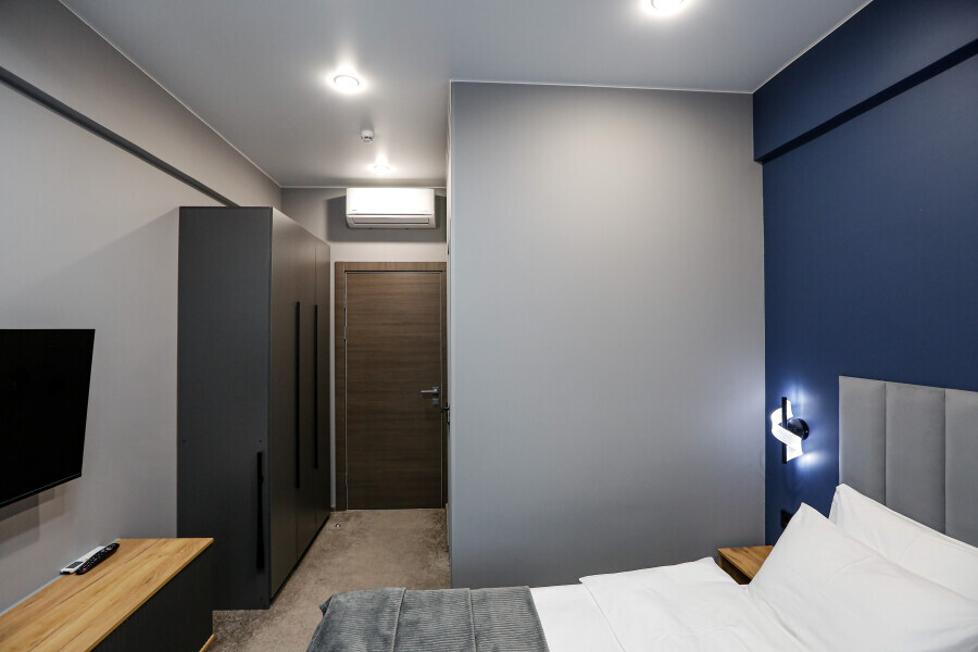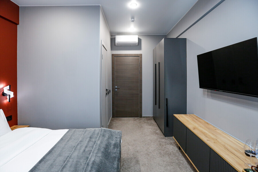 Минималистичный интерьер номера обеспечивает всё необходимое для качественного отдыха: большая удобная кровать, телевизор со Smart TV, шкаф и тумба для вещей. К услугам гостей отдельная ванная комната с душем и туалетом, качественные косметические наборы для душа, набор полотенец и тапочки.