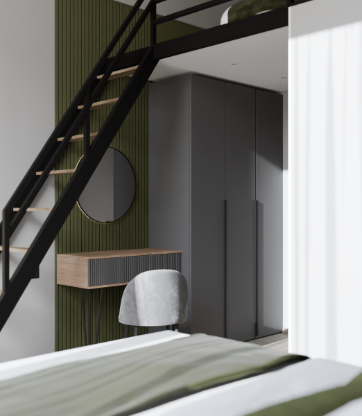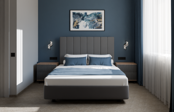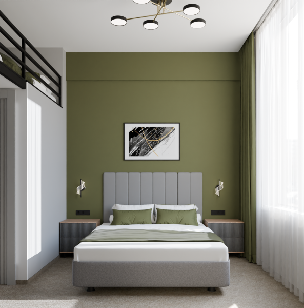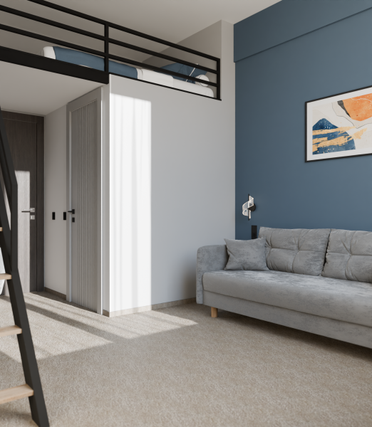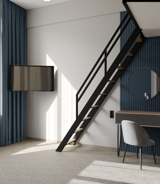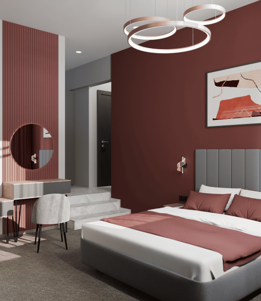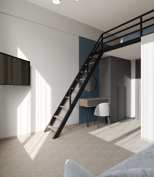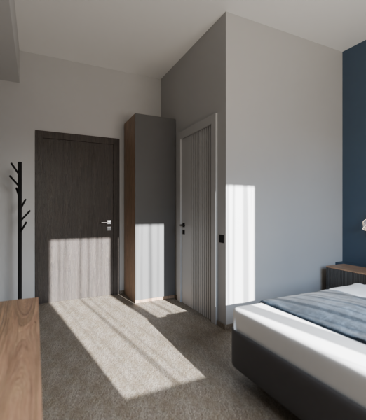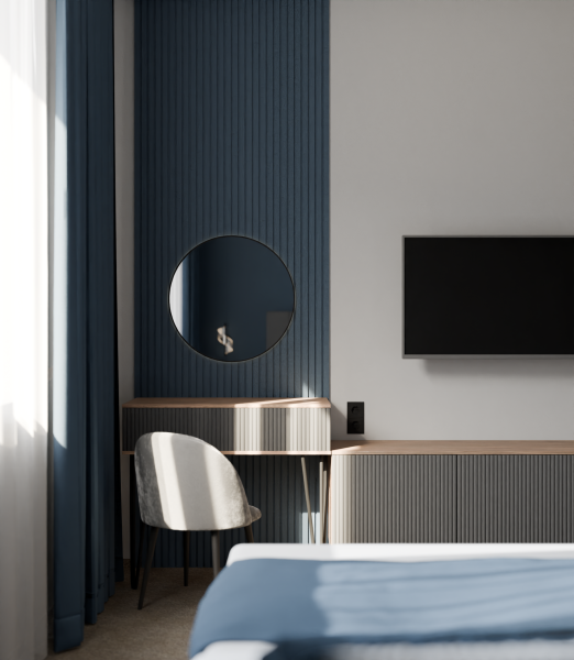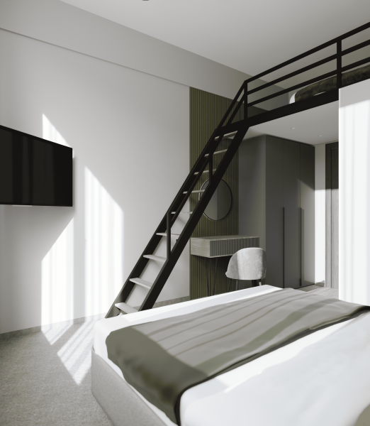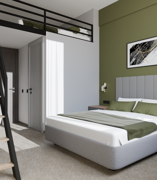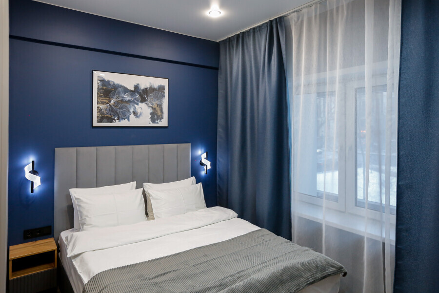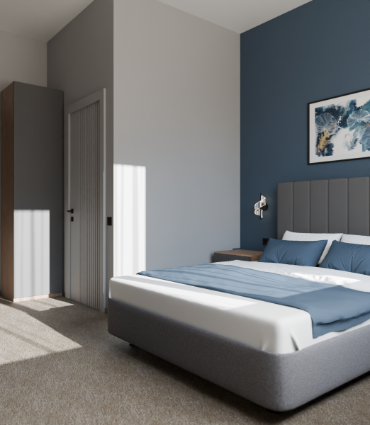 Минималистичный интерьер номера обеспечивает всё необходимое для качественного отдыха: большая удобная кровать, телевизор со Smart TV, шкаф и тумба для вещей. К услугам гостей отдельная ванная комната с душем и туалетом, качественные косметические наборы для душа, набор полотенец и тапочки.