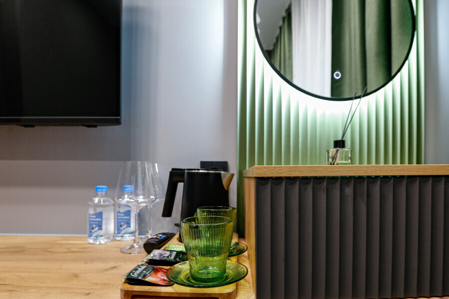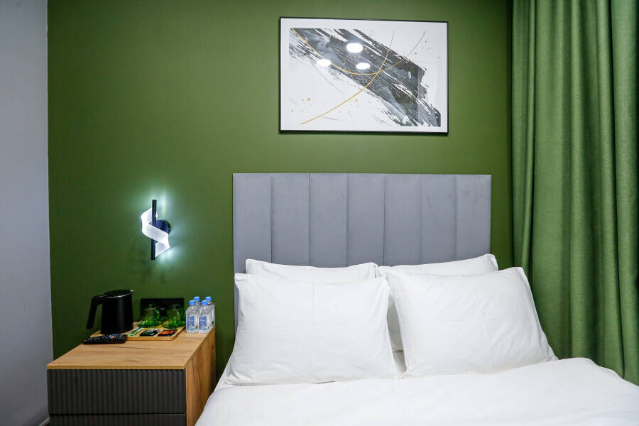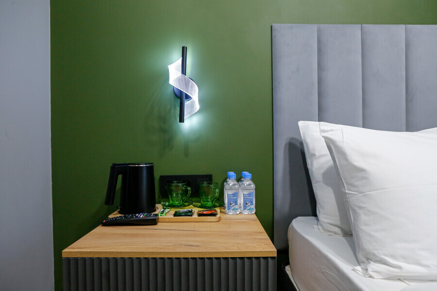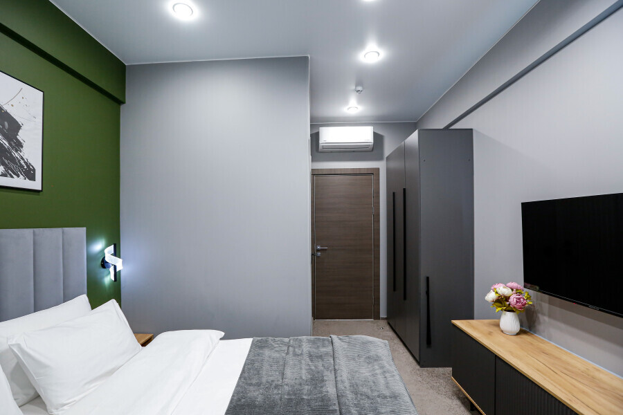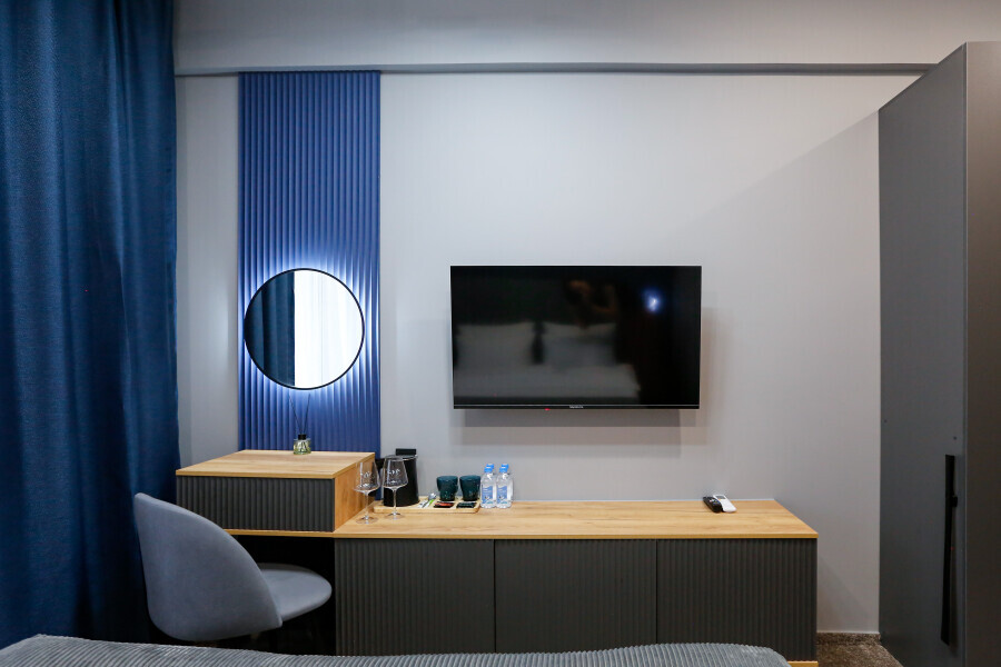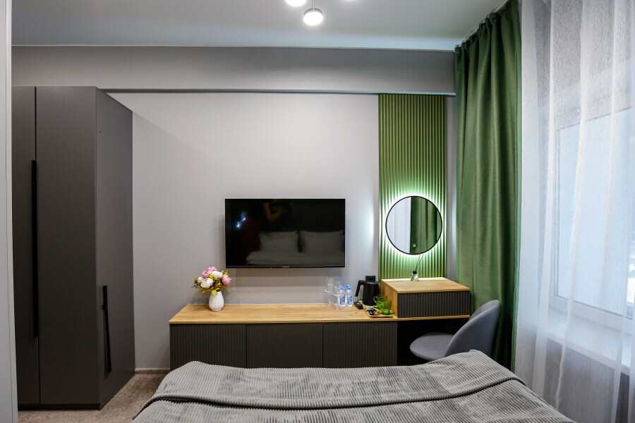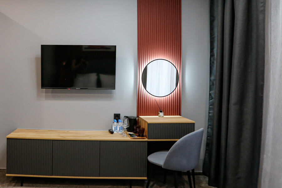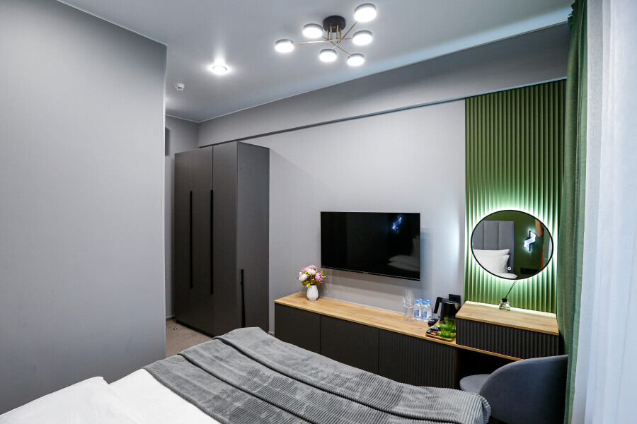 Приятный дизайнерский интерьер номера обеспечивает гостям расслабление и комфортный отдых. Для дополнительного удобства номер оснащен широкоформатным телевизором со Smart TV, шкафом для одежды, кондиционером, чайным набор и мини-холодильником. К вашим услугам отдельная ванная комната с душевой кабиной и туалетом, гигиенический душ, фен для волос, косметические принадлежности, набор полотенец и тапочки.