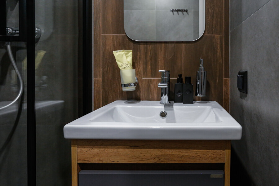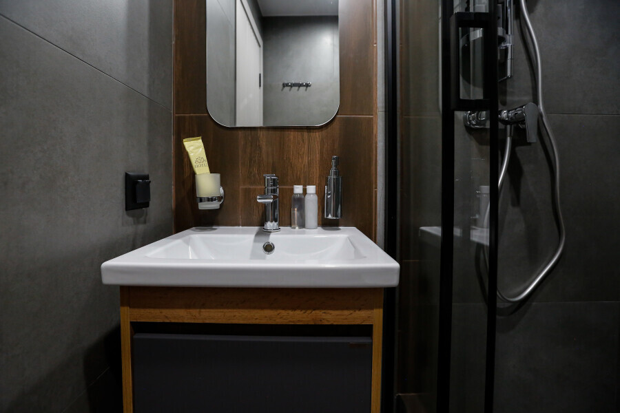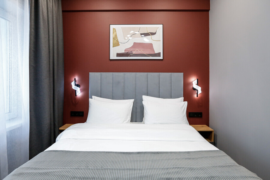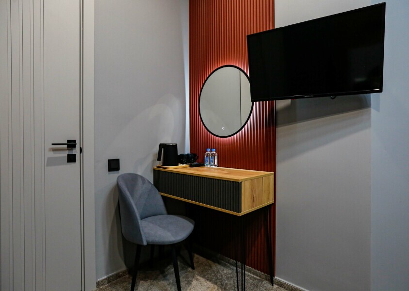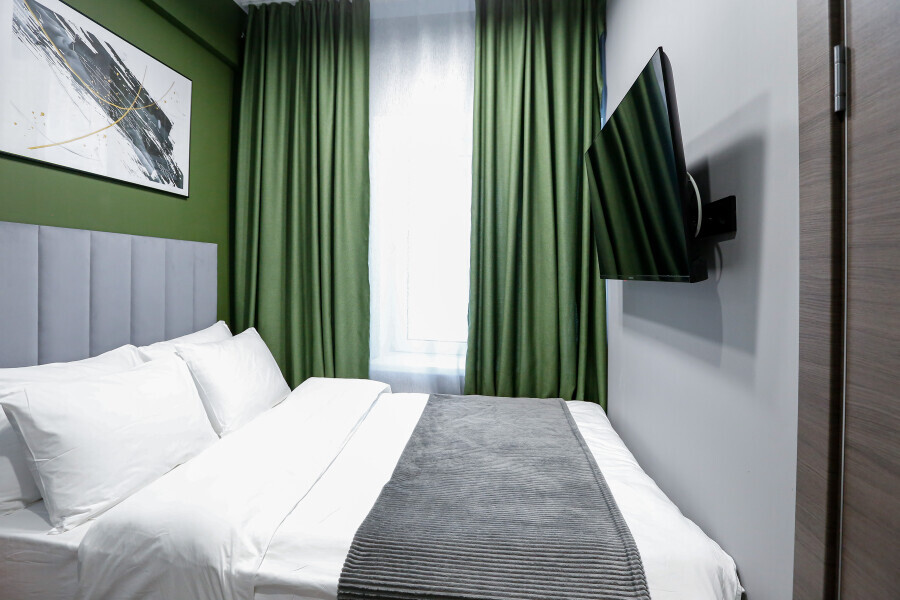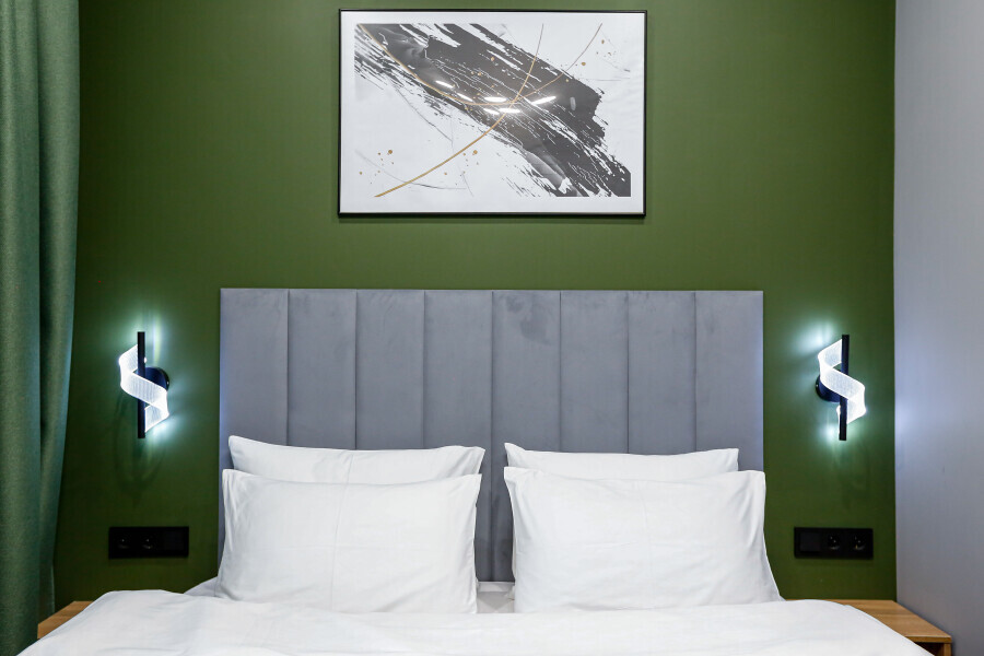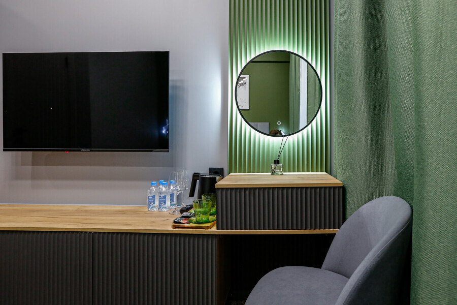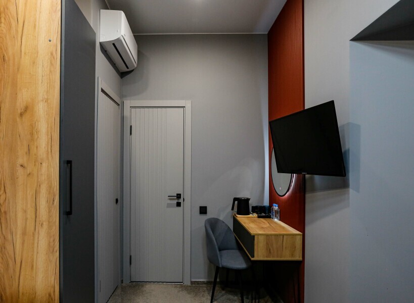 Приятный дизайнерский интерьер номера обеспечивает гостям расслабление и комфортный отдых. Для дополнительного удобства номер оснащен широкоформатным телевизором со Smart TV, шкафом для одежды, кондиционером, чайным набор и мини-холодильником. К вашим услугам отдельная ванная комната с душевой кабиной и туалетом, гигиенический душ, фен для волос, косметические принадлежности, набор полотенец и тапочки.