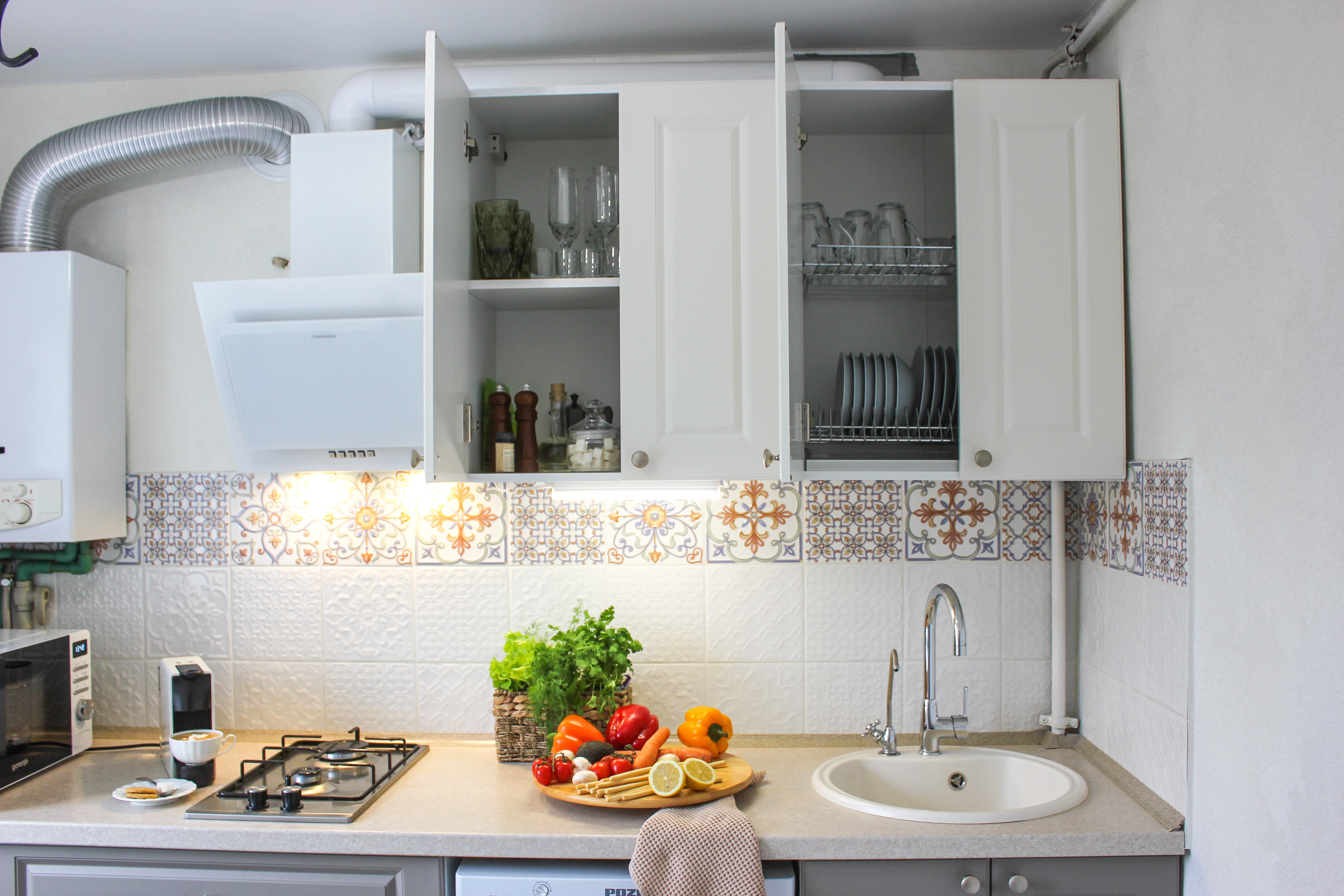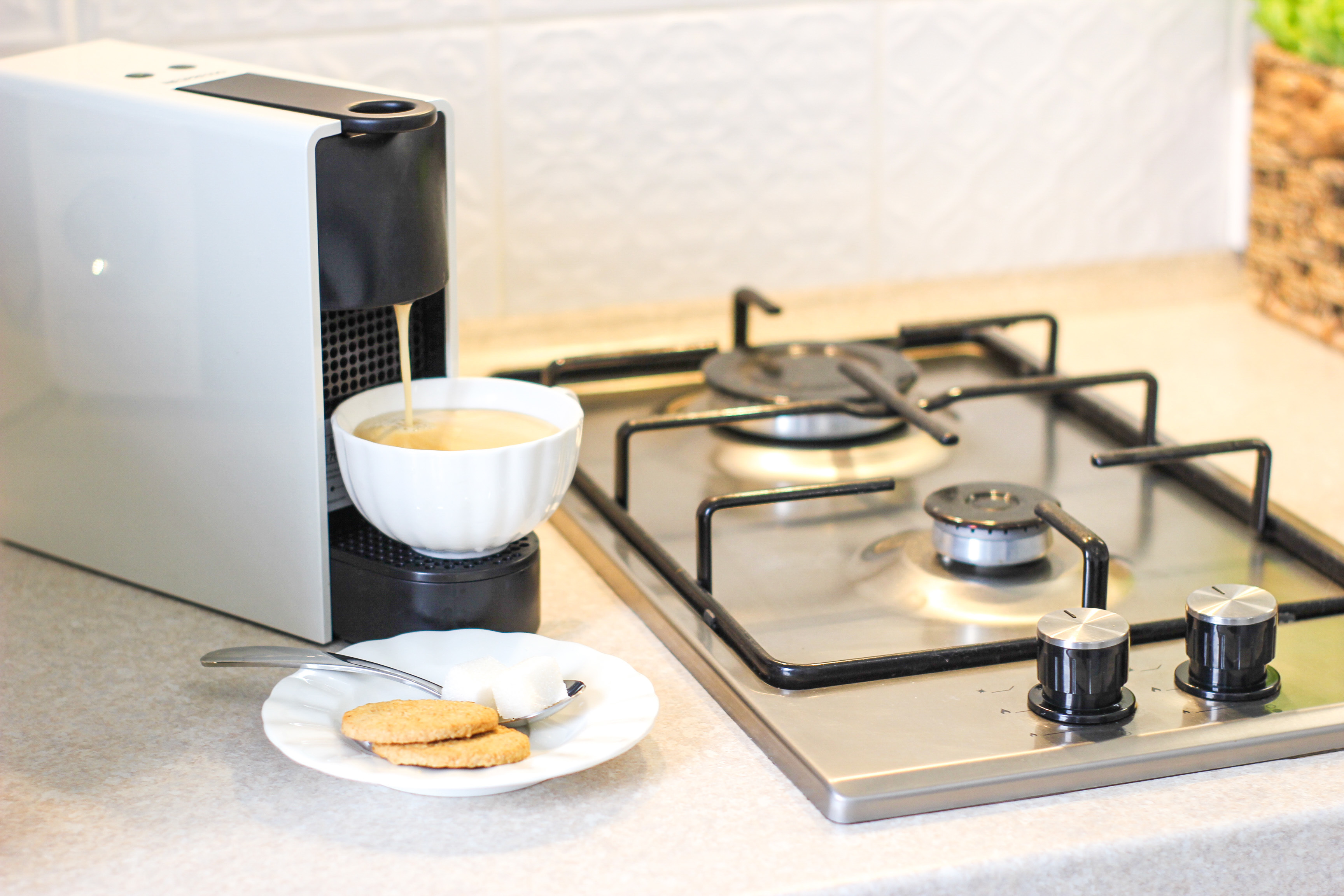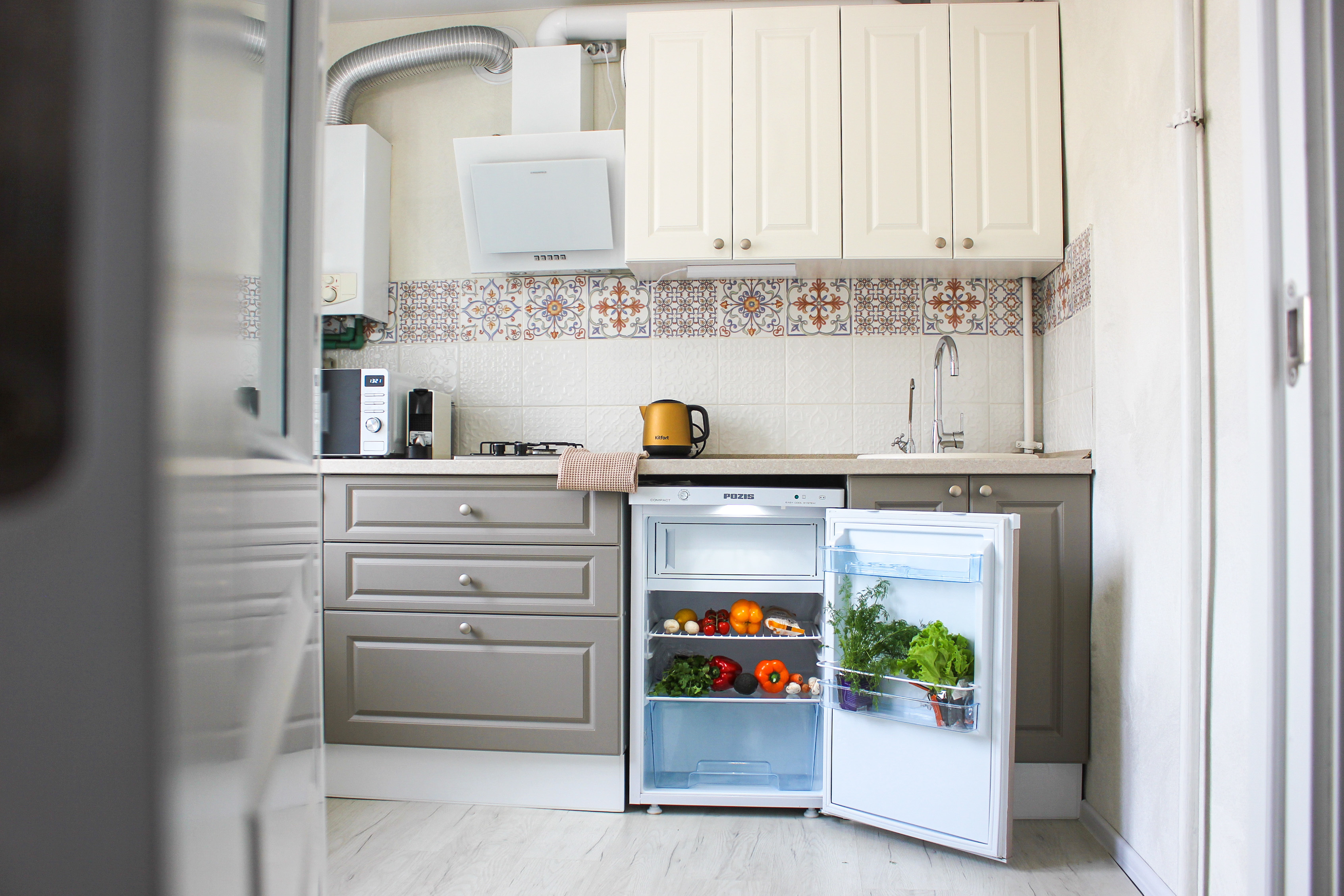 Оборудованная кухня со всей необходимой утварью и посудой, в том числе и кофемашина, обеденный стол. Вид из окна - в тихий внутренний двор
