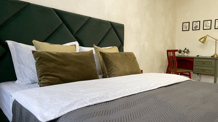 Спальня 1: оснащена двуспальной кроватью 160*200, прикроватные тумбы и светильники, комод для хранения вещей, рабочий стол и стул, ТВ с кабельными каналами, шторы блек-аут.