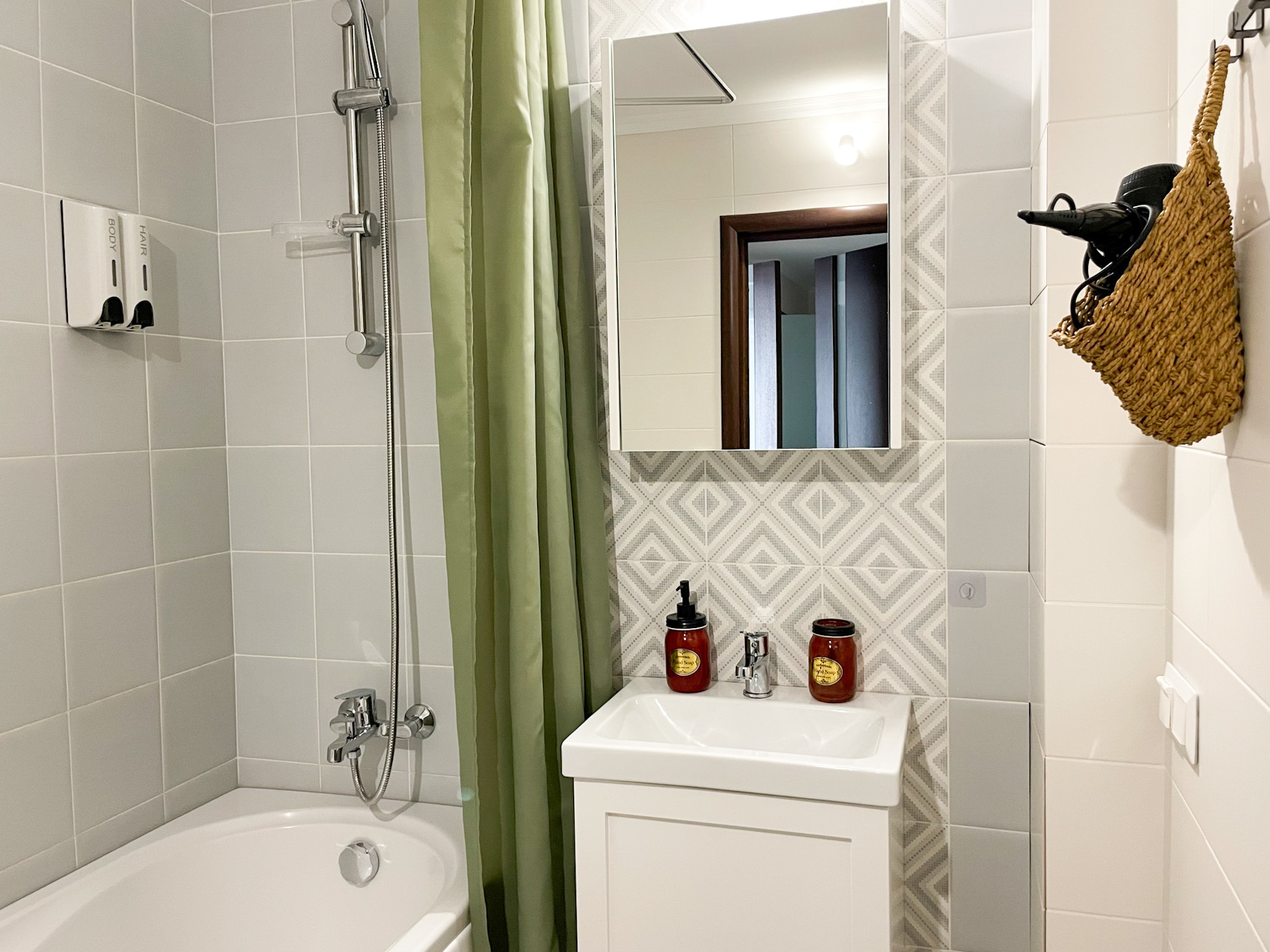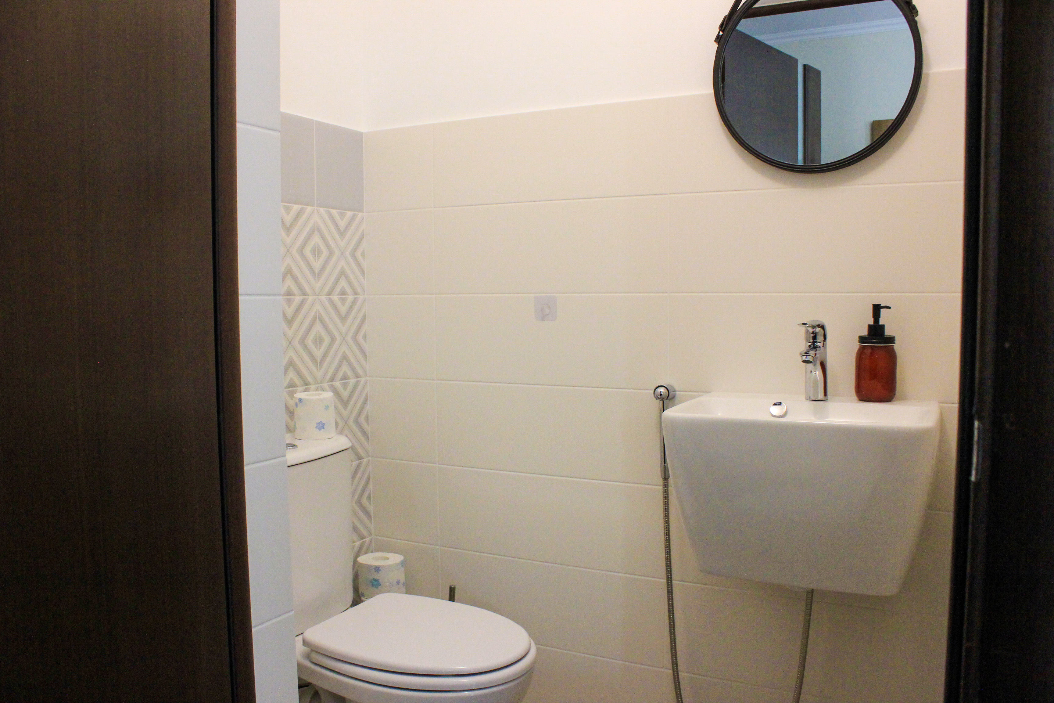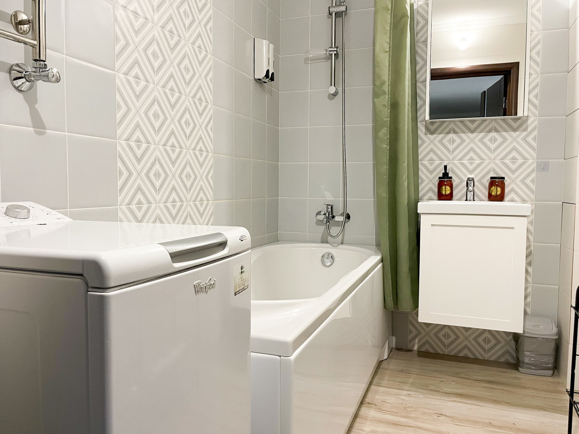 В ванной комнате установлена большая ванна, теплый пол, стиральная машинка. Предлагаем полный набор гигиенических принадлежностей.