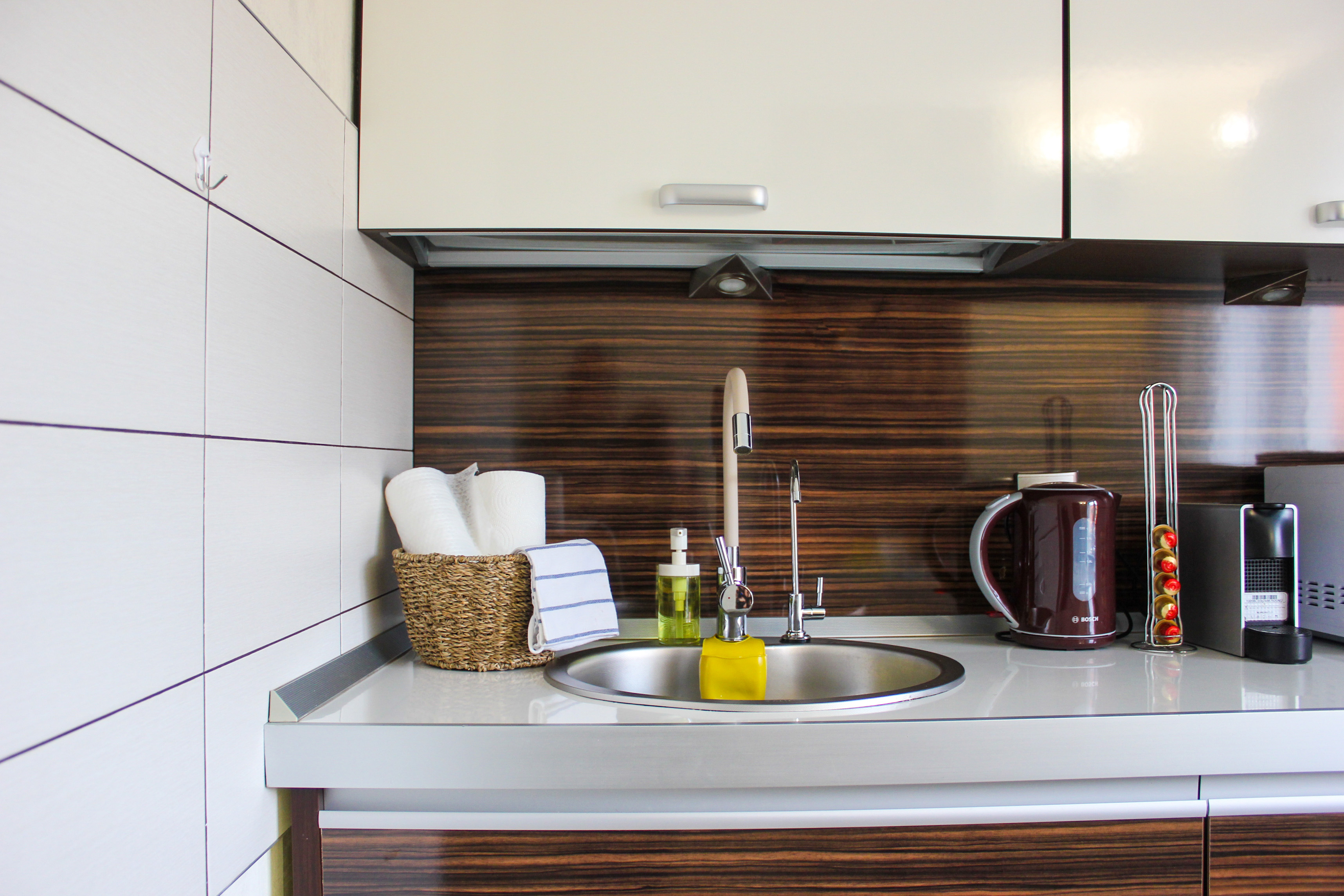 Оборудованная кухня со всей необходимой утварью и посудой, в том числе и кофемашина. Большой обеденный стол. Вид из окна - в тихий внутренний двор.