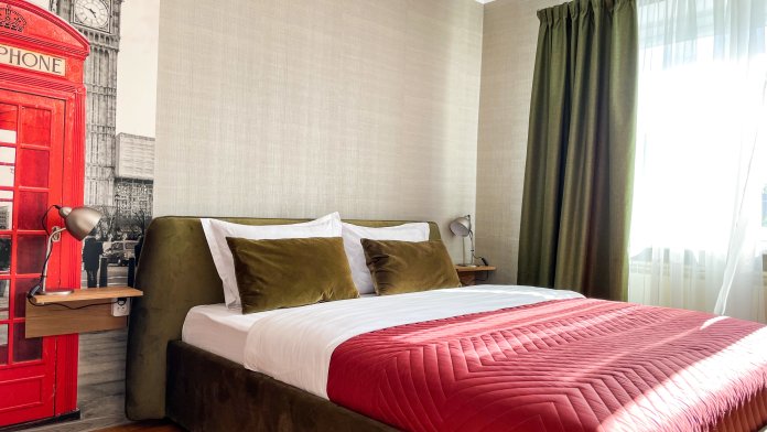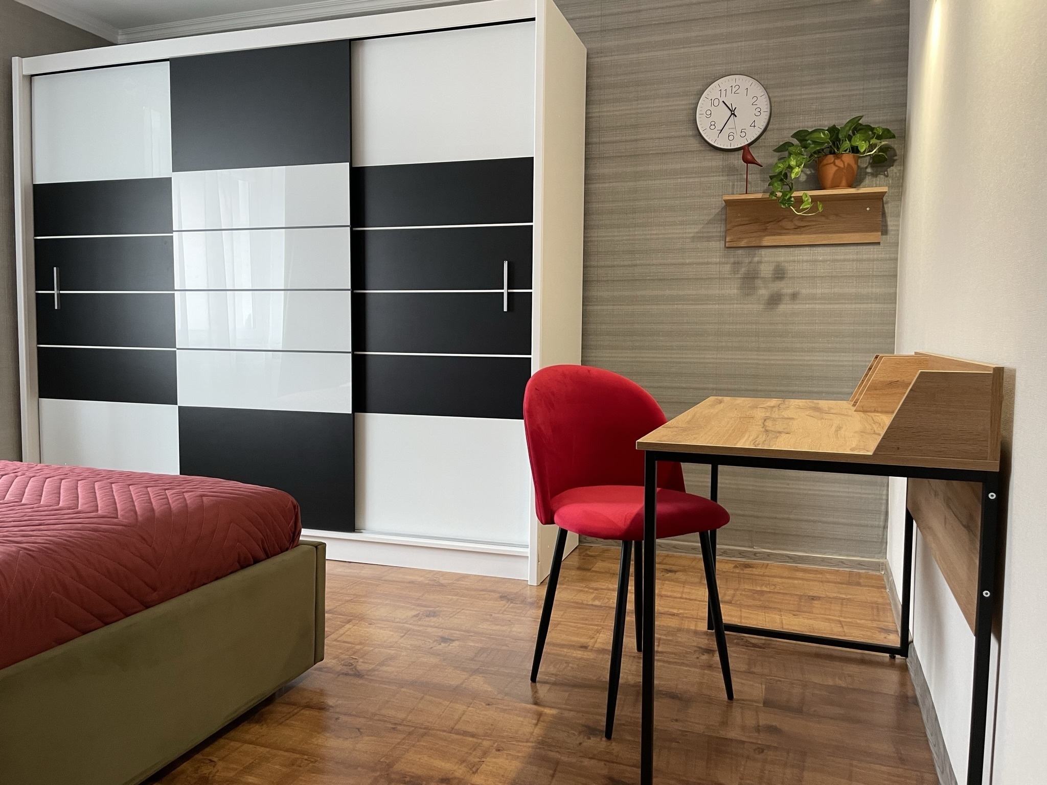 Спальня: оснащена двуспальной кроватью 160*200, прикроватные тумбы и светильники, просторный шкаф для хранения вещей, рабочий стол и стул, шторы блек-аут. Окна выходят в тихий двор.